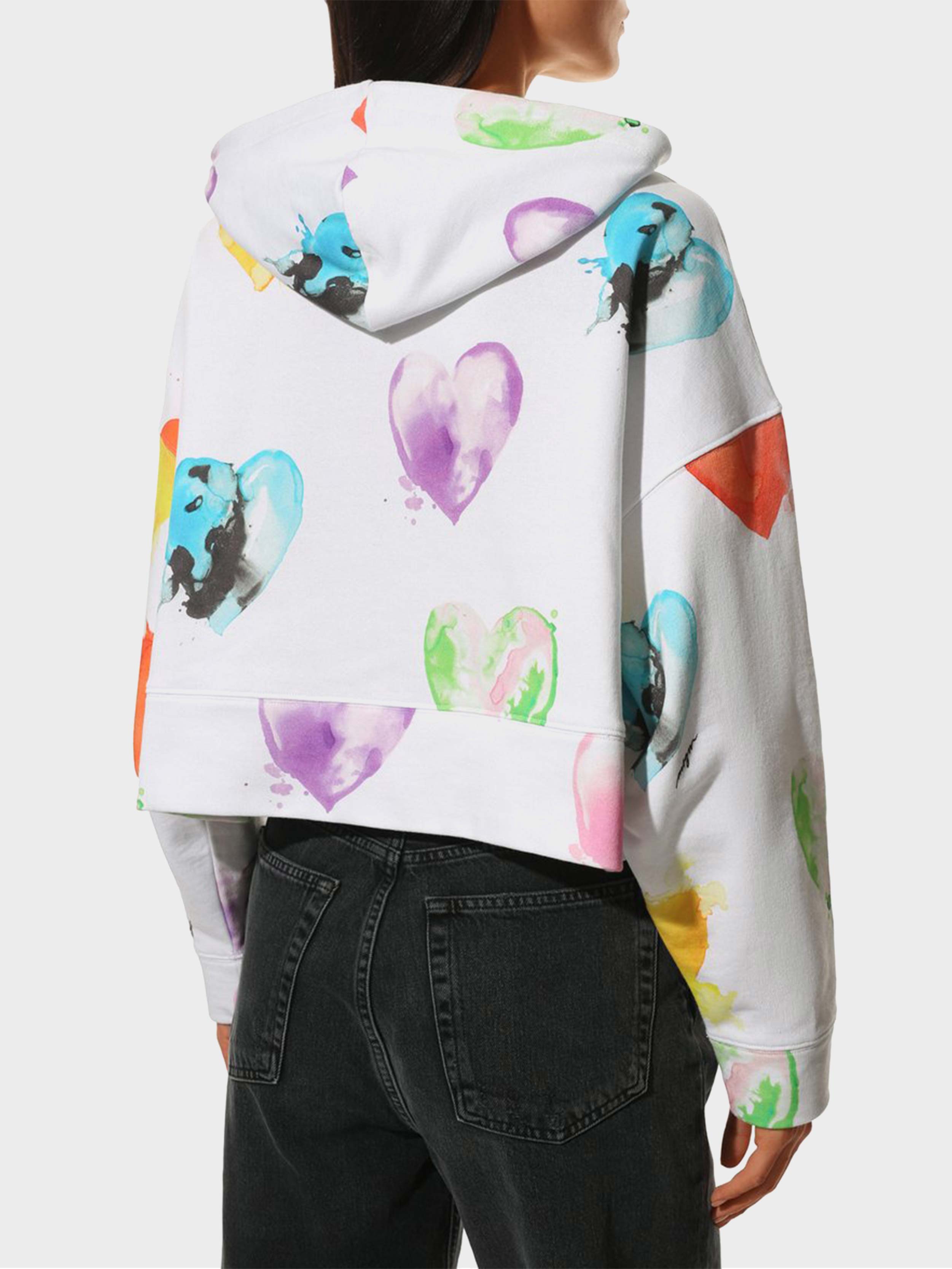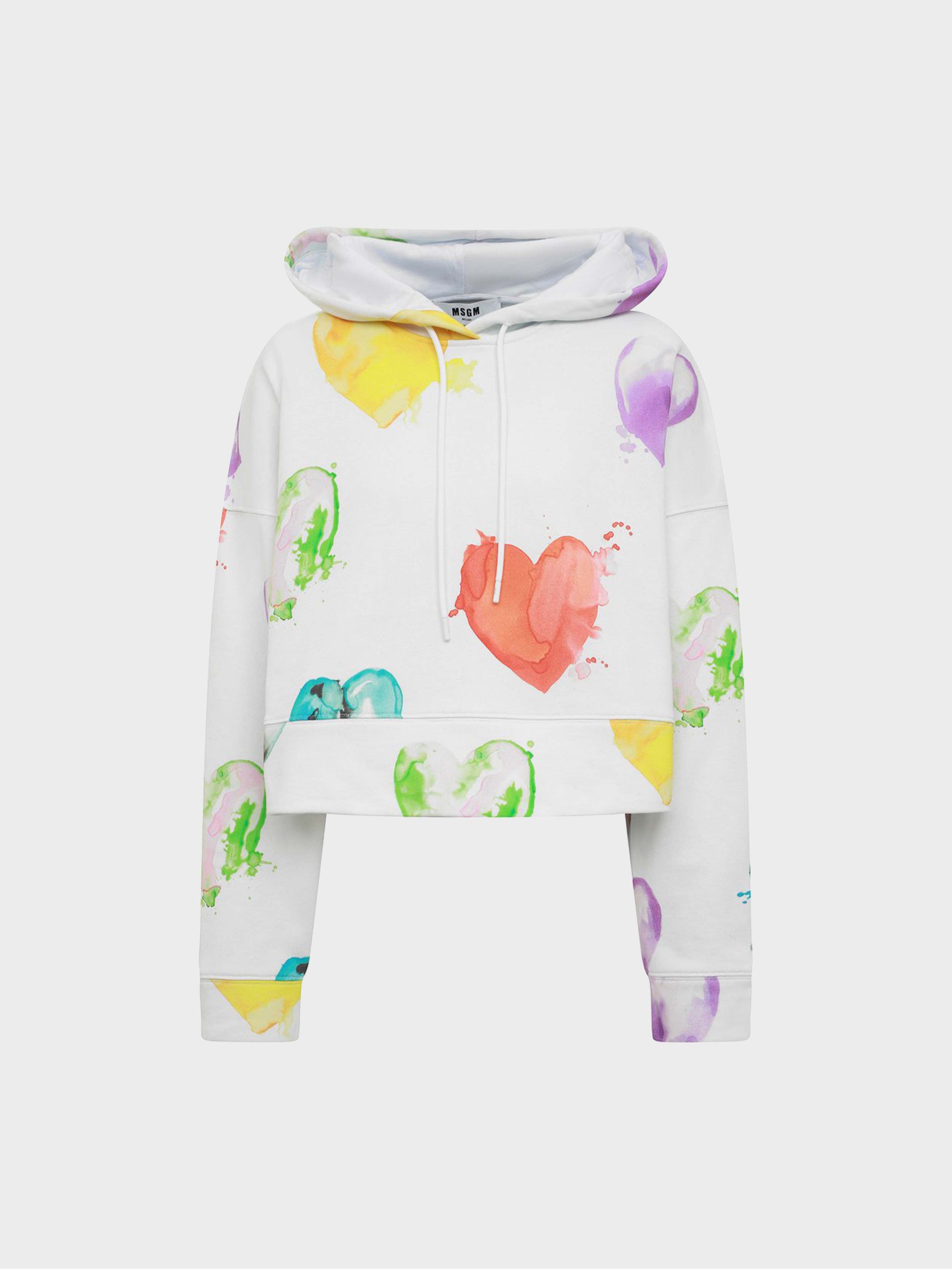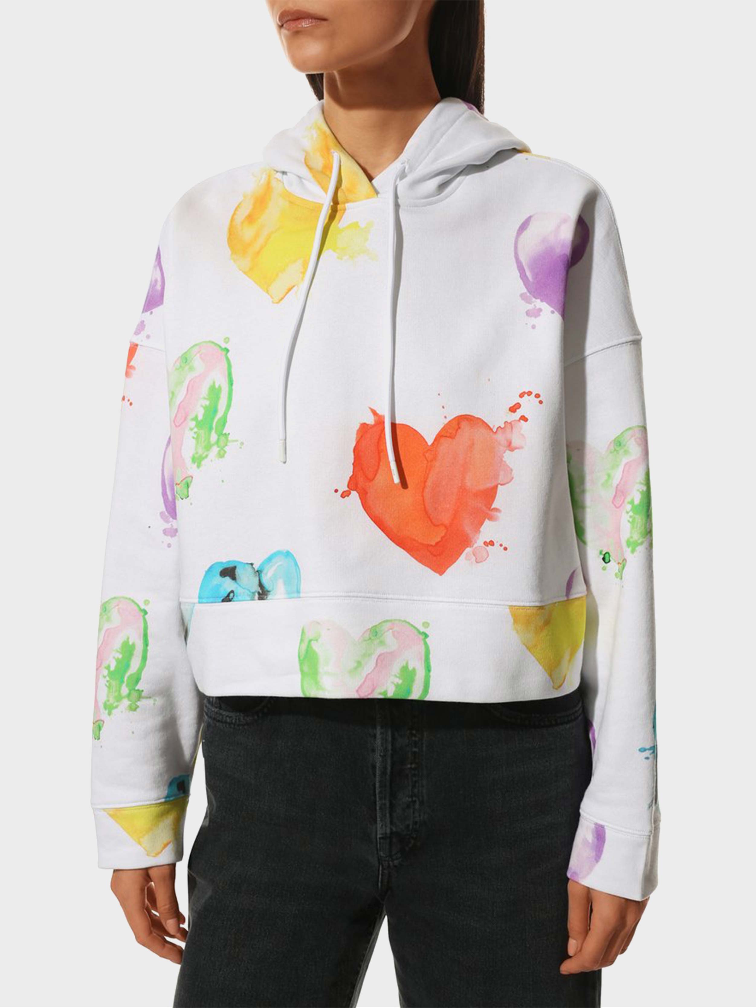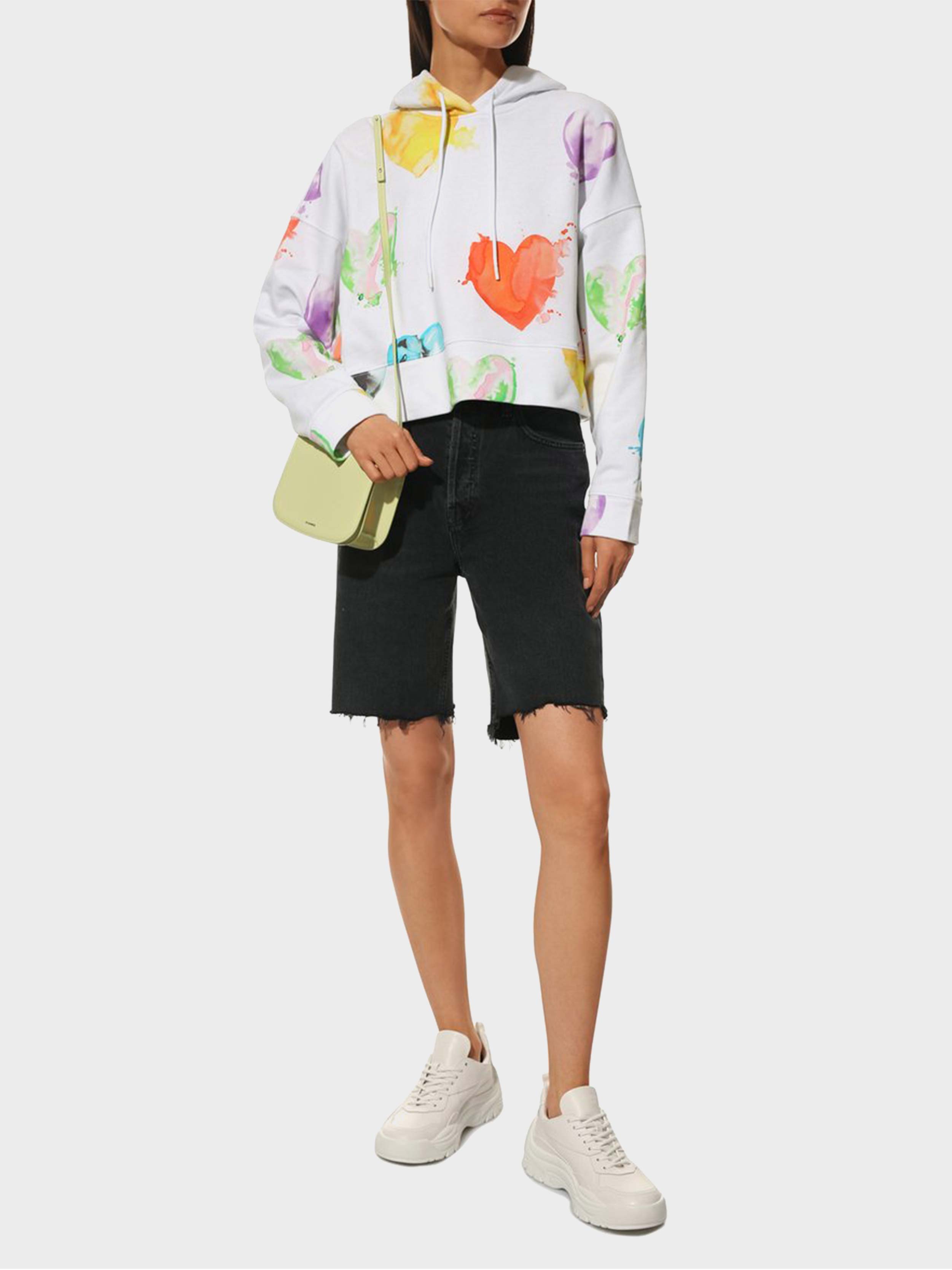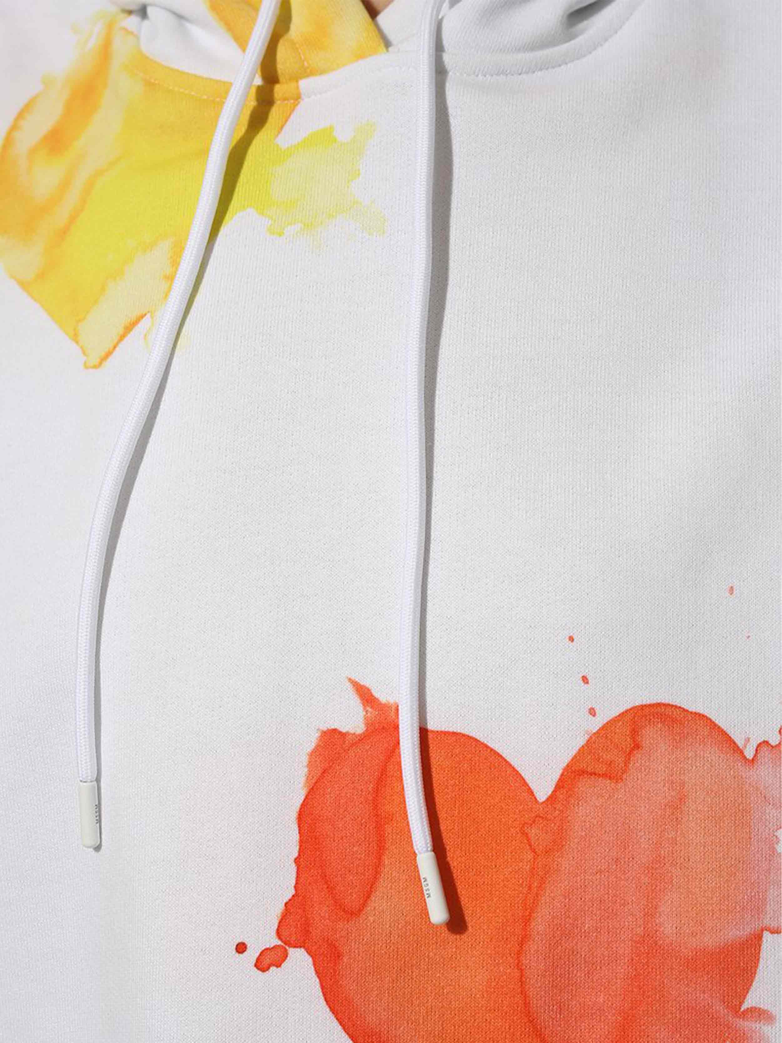 • A colorful print of watercolor hearts helped Massimo Giorgetti make this white loose hoodie romantic. For sewing a slightly shortened model with a dropped shoulder line, the designer chose thick, pleasant to the touch cotton knitwear.