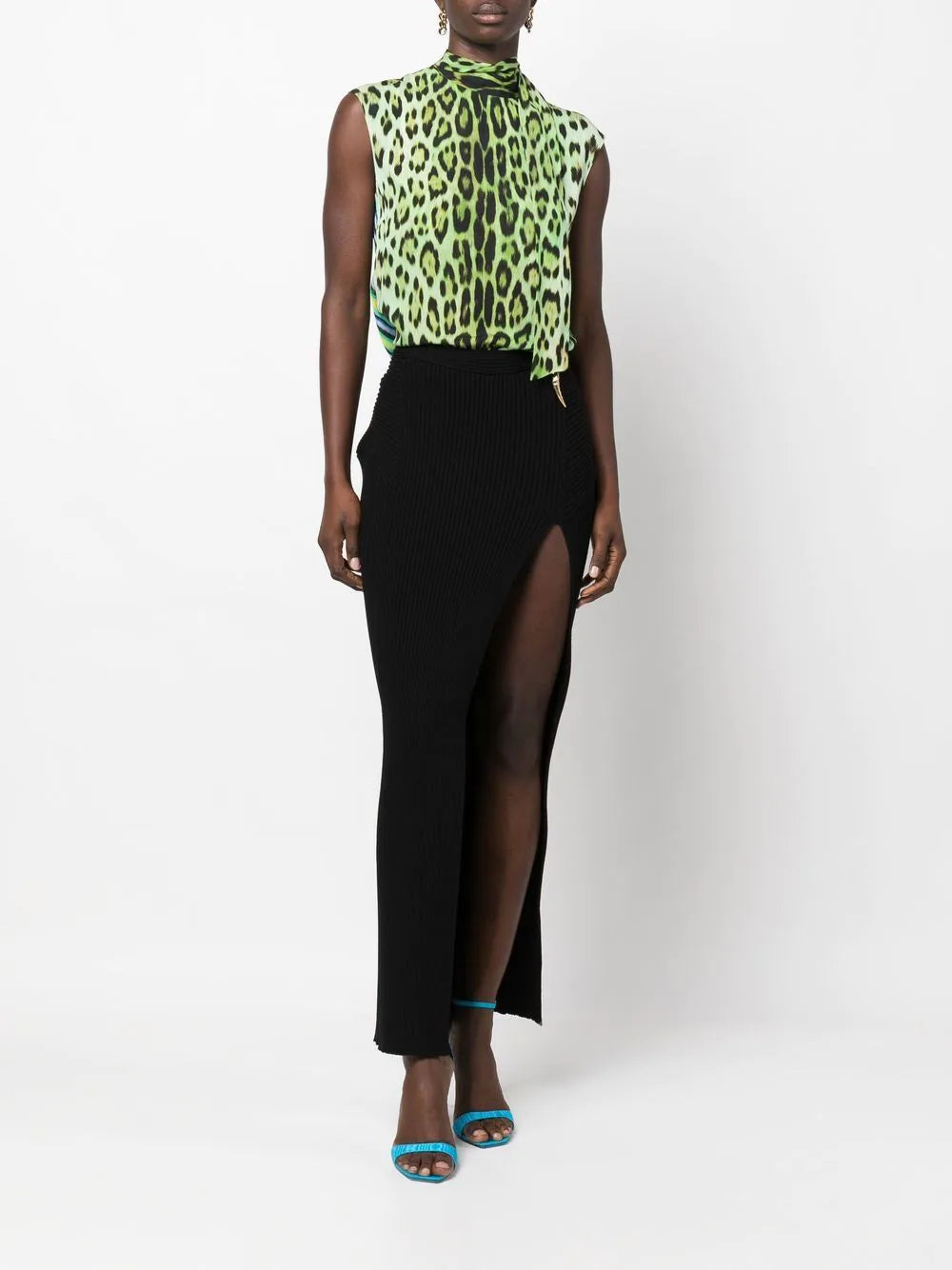 • This casual tank top is simply finished with a scarf to tie at the funnel neck, leaving the spotlight on the two prints: the jaguar motif on the front and the Exotic Stripe motif on the back. The green palette allows for a fresh take on animal themes.