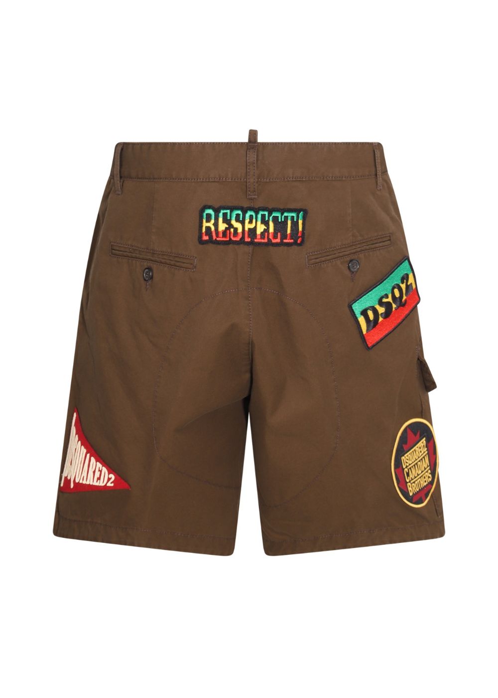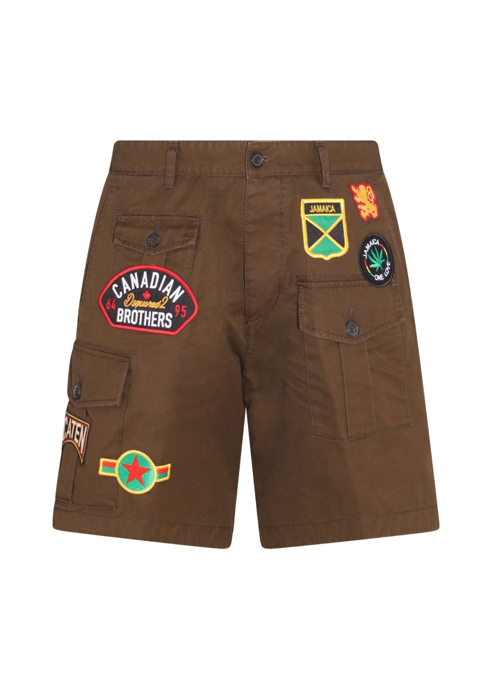 • Khaki cargo shorts from Dsquared2. Made of cotton, this pair features buttons fastenings, multicolored logo patches and multiple pockets.