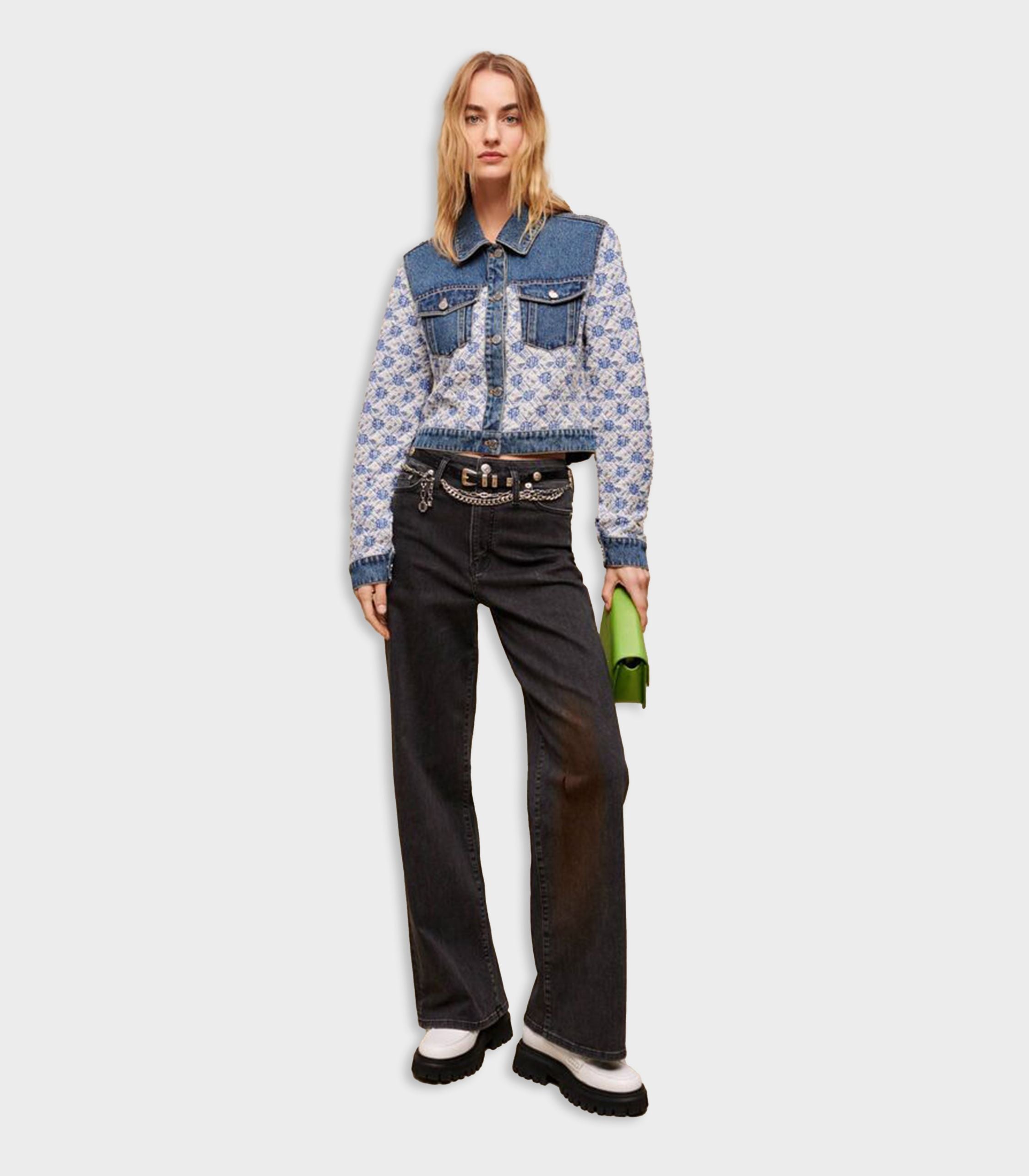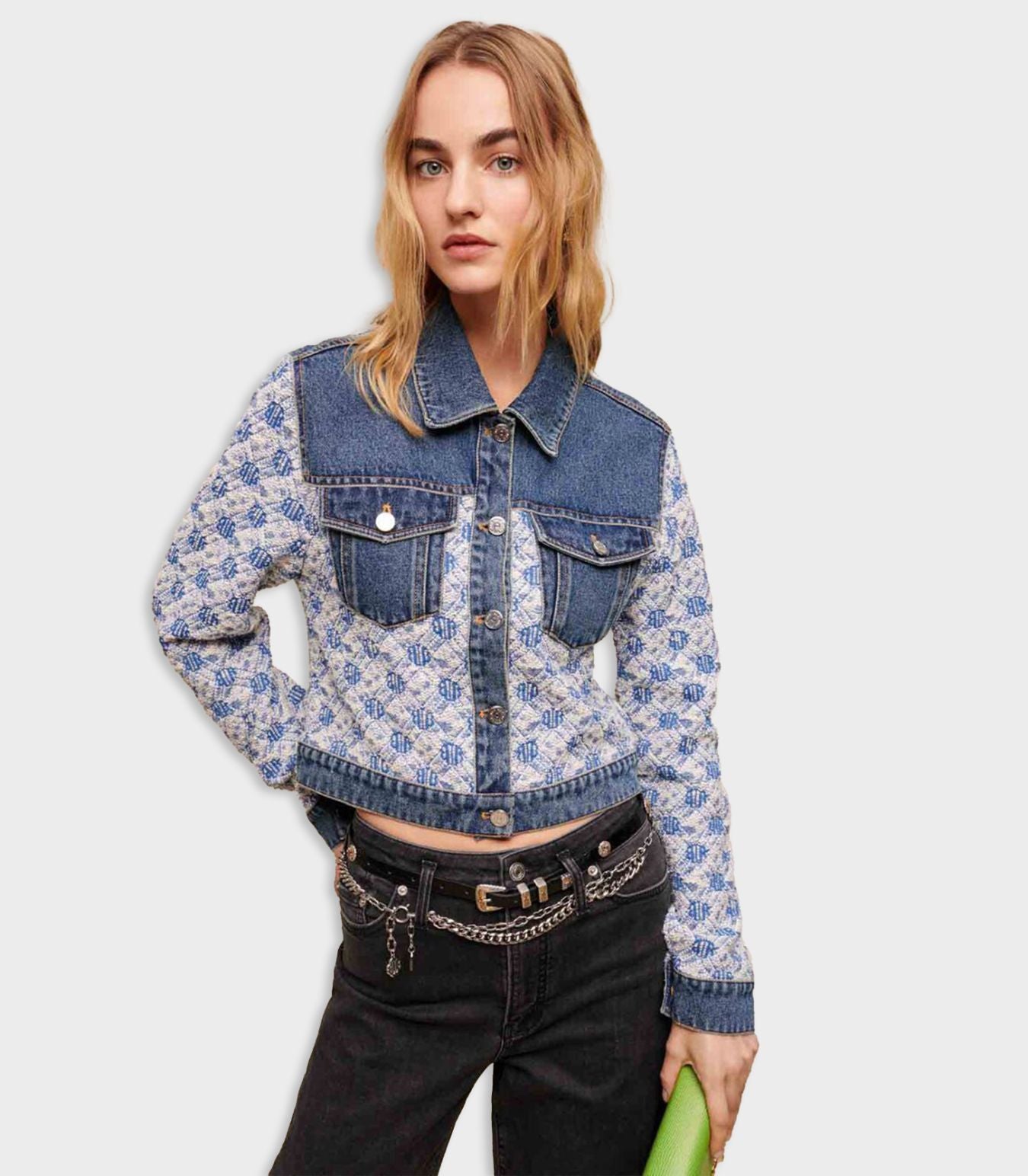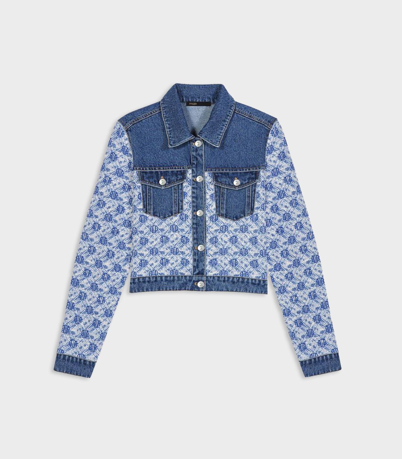 • This style offers an original, modern new take on the classic denim jacket. It features subtly overstitched sky-blue Maje Clover prints which create a quilted effect alongside raw denim inserts.