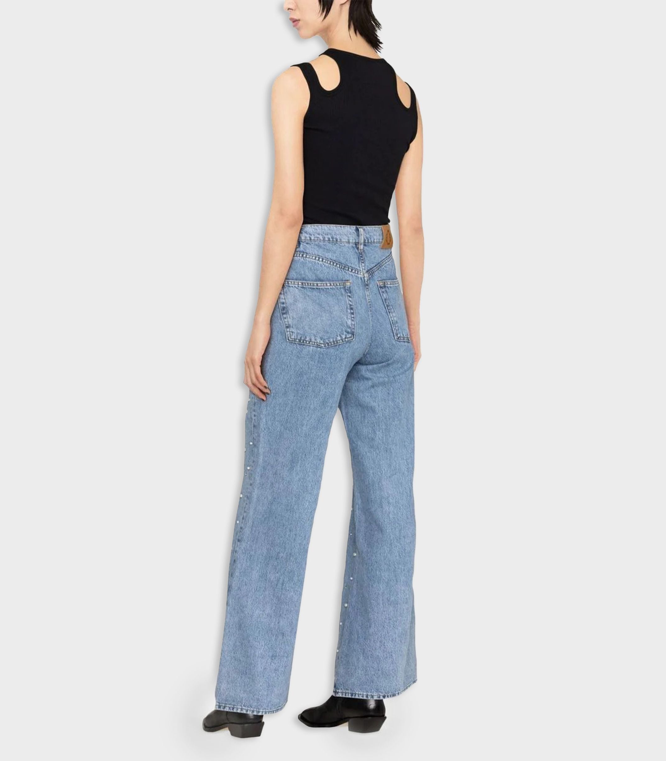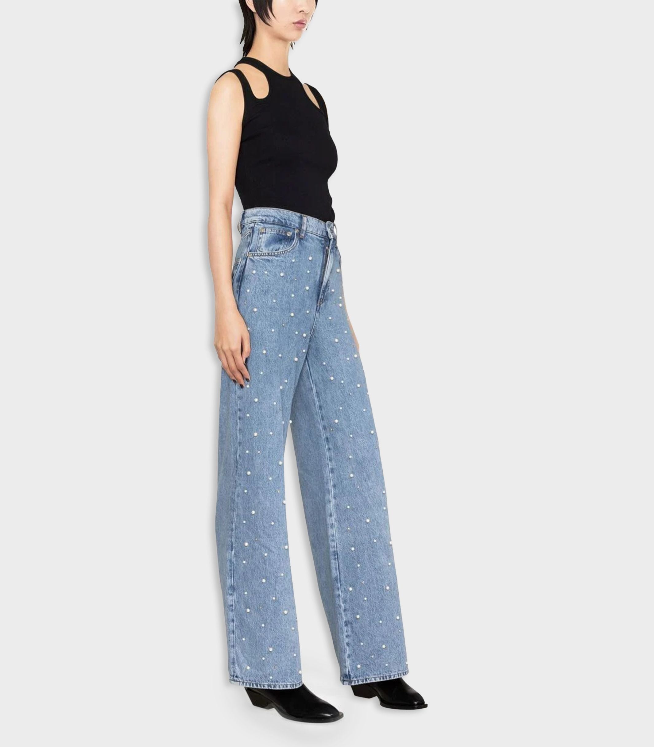 • These 100% cotton jeans are made using 20% recycled cotton. We bring a little femininity to their wide, straight cut by adding shiny mother-of-pearl beads to the front.