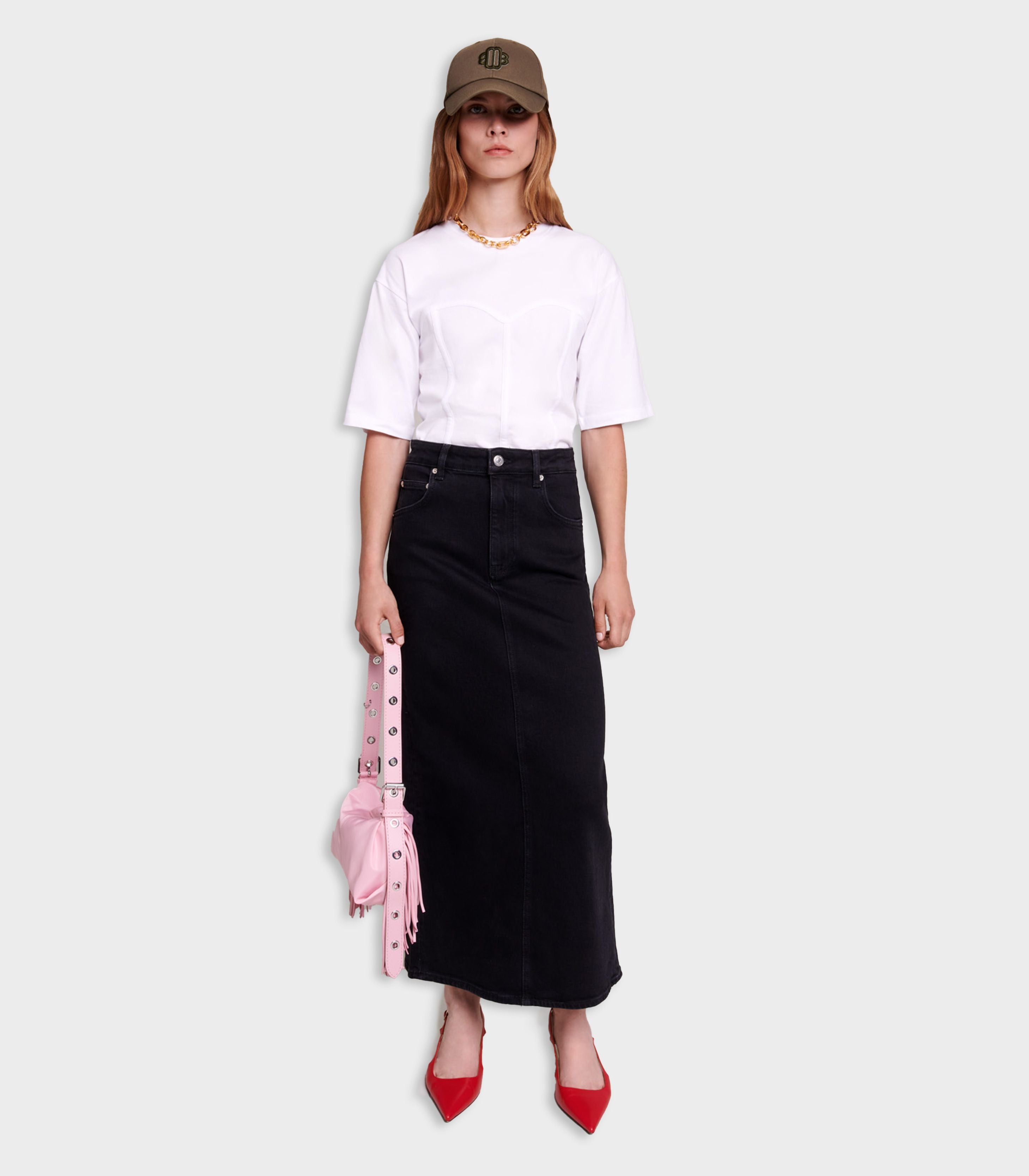 • This season, Maje reinterprets the season's classics in style and has come up with a range of signature pieces to create the boldest combinations. A real wardrobe essential, this long denim skirt creates a sleek, structured look thanks to its stiff denim. With a high waist and button fastening, the back slit is designed for extra freedom of movement and a flowing silhouette for a confident yet comfortable piece.
