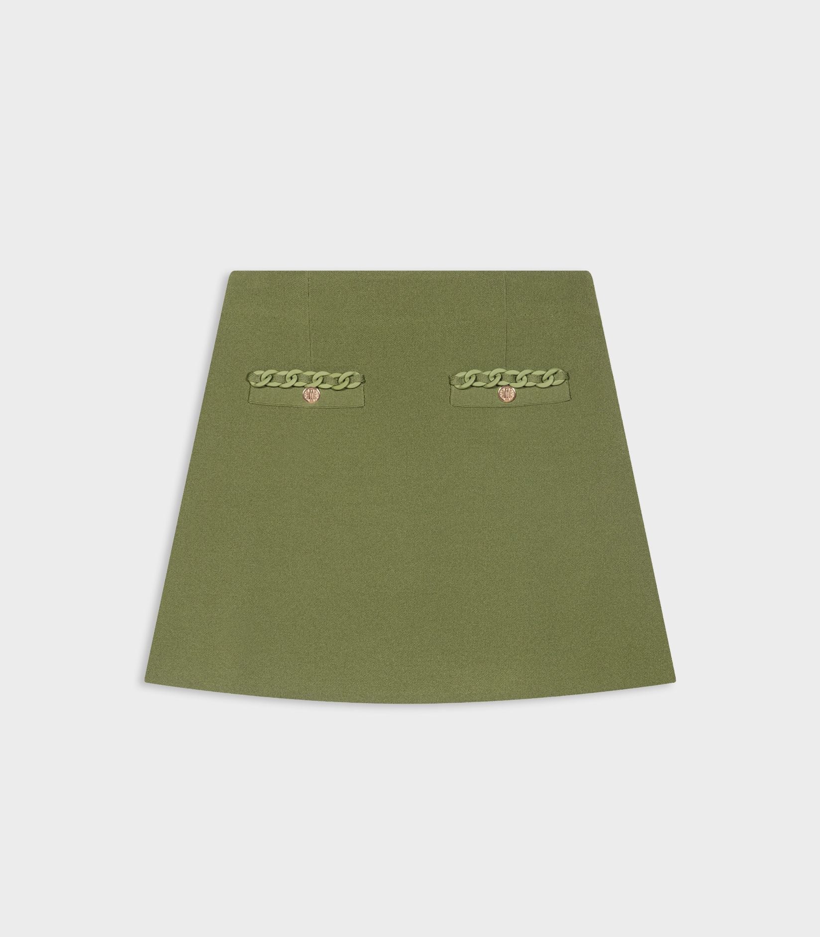 • Embellished with interlacing matte rubber chains along the pockets, this straight-cut mini skirt will take your from one season to the next, paired with winter knits or summer blouses. It features elaborate buttons and can be paired with the matching crop top for a chic, modern ensemble.
