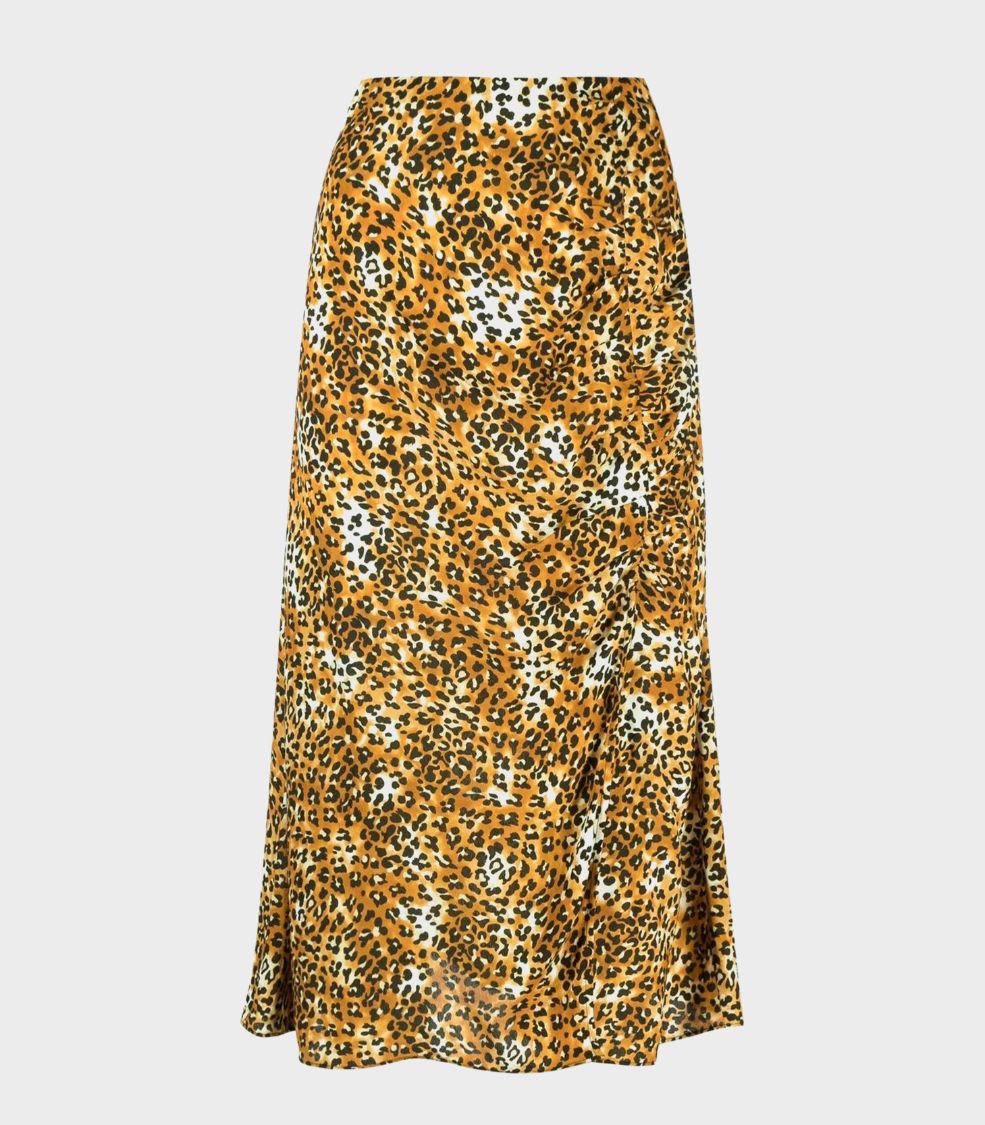 • Decorated with a wild leopard print, this high-waisted midi skirt with a zip fastening is slightly flared at the bottom, which sits just below the knee. It features pretty asymmetric draping on the side and a thigh-high slit. Dare to wear it in bold combinations with a contrasting graphic print or a casual sweatshirt, or opt for a total leopard look with a matching top.
