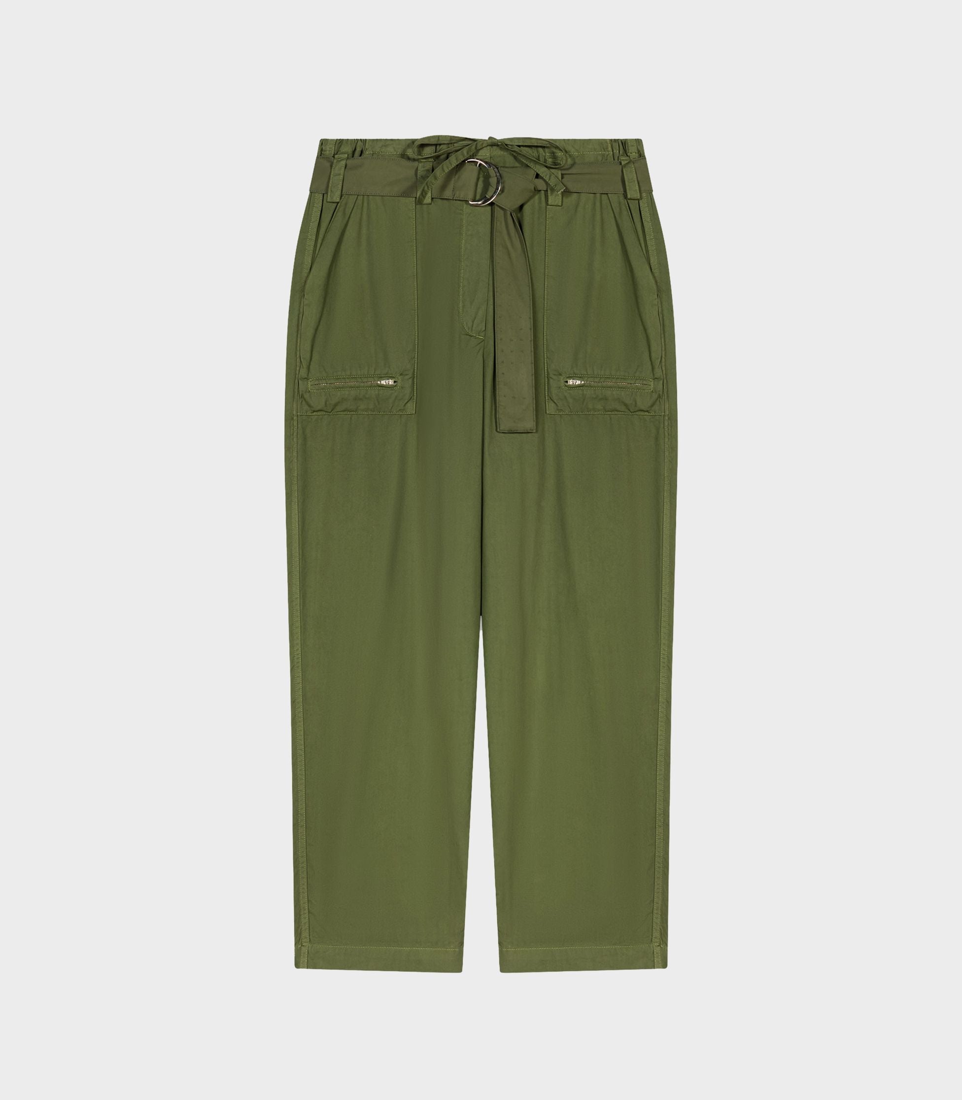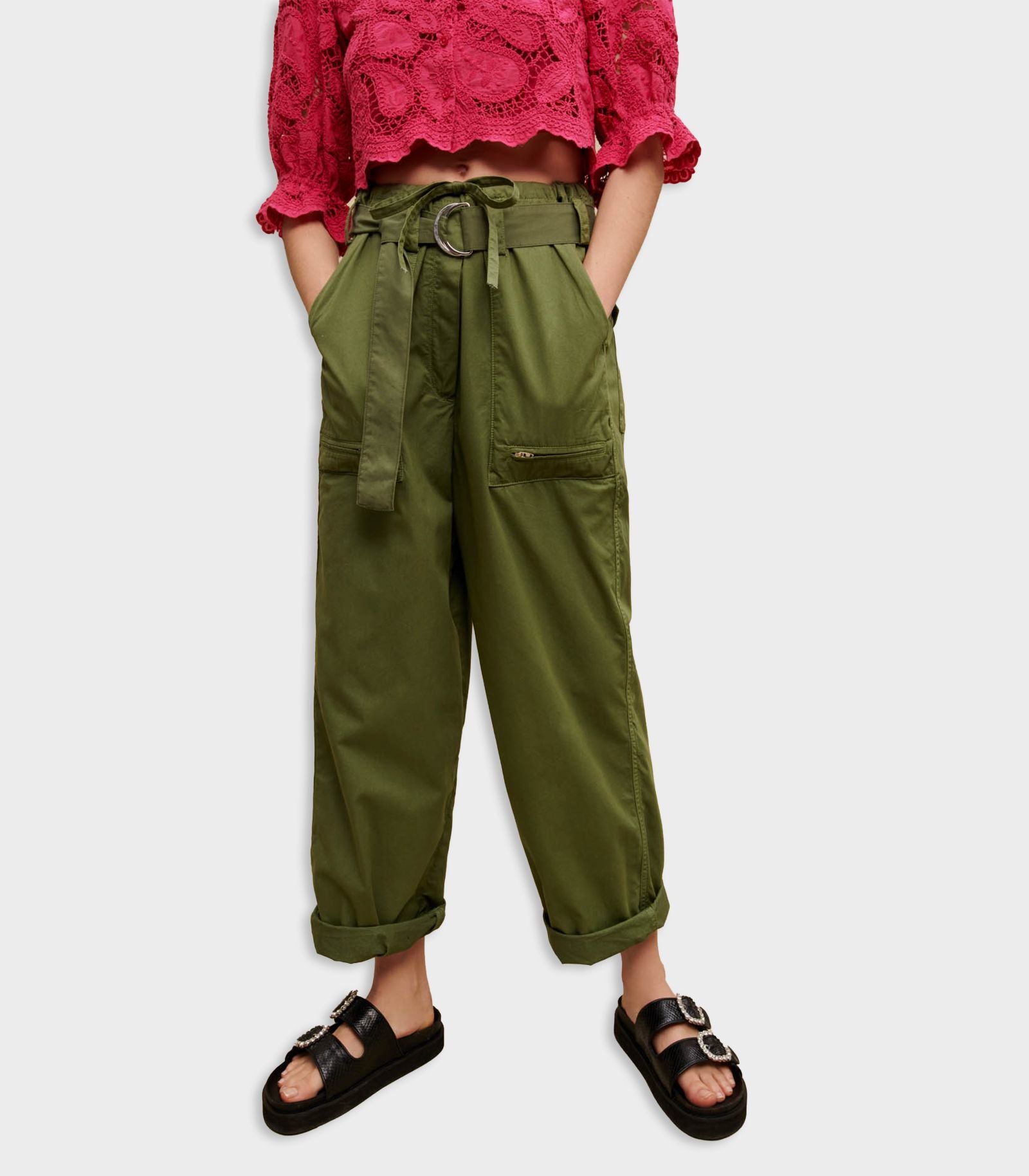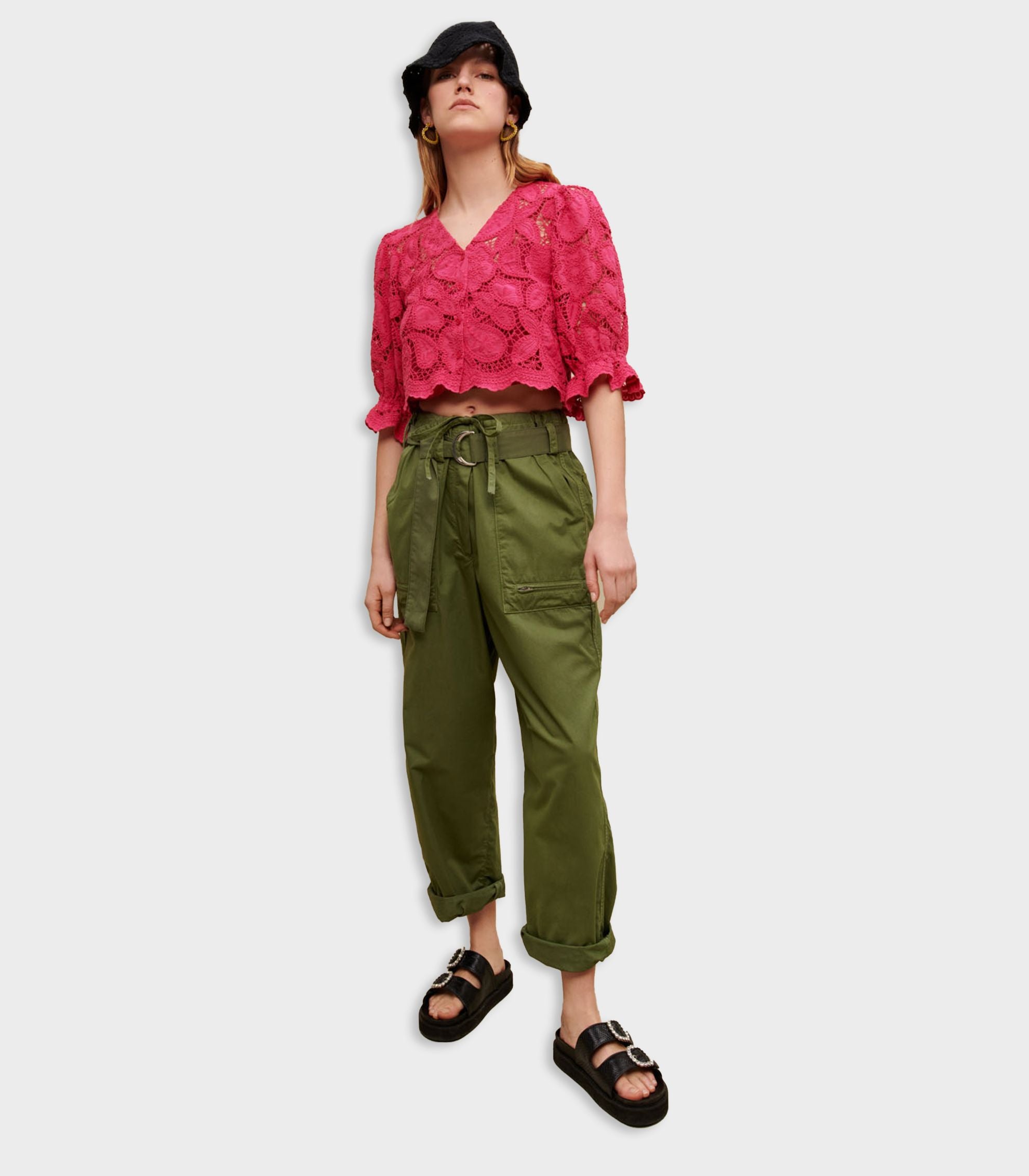 • These cotton cargo trousers have been redesigned for summer to combine style, lightness and comfort. With a wide-leg, loose fit, the waistband is accentuated with belt loops and a tie-front drawstring for a structured, relaxed look. Featuring two pockets with zips on the front and two flap pockets on the back, they roll up at the ankles to suit your mood. Wear them any time and mix with any style, pair them with an embroidered top, a bucket hat and a pair of black sandals.