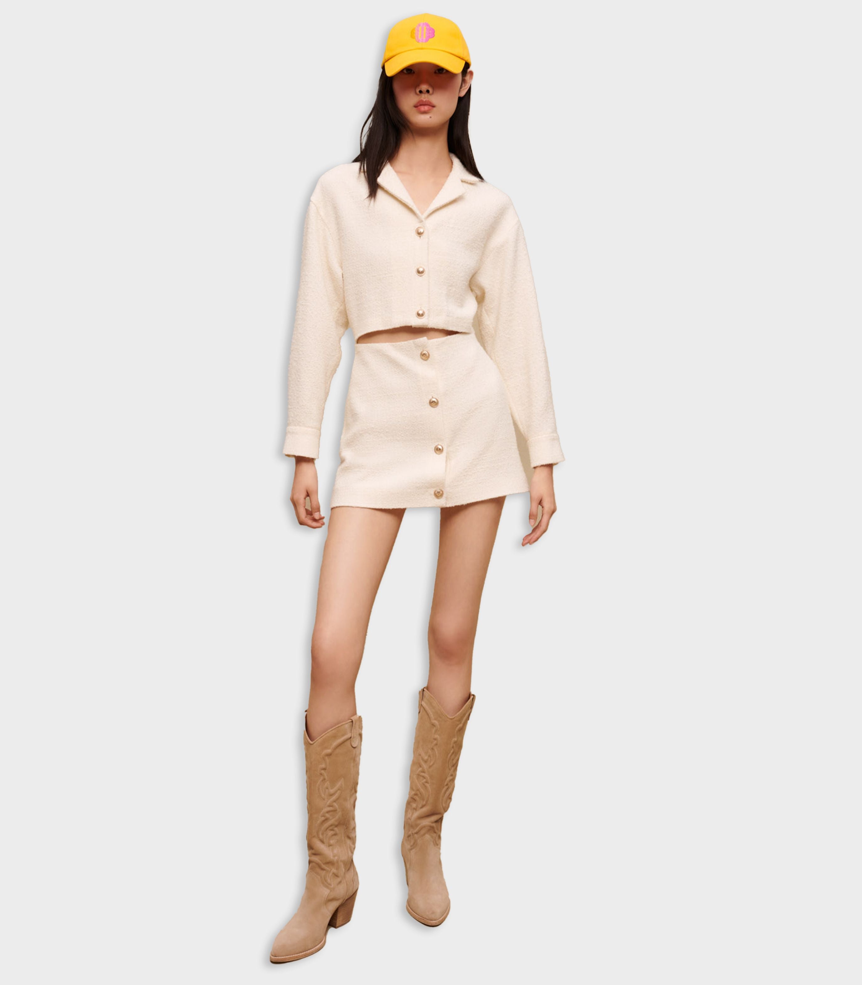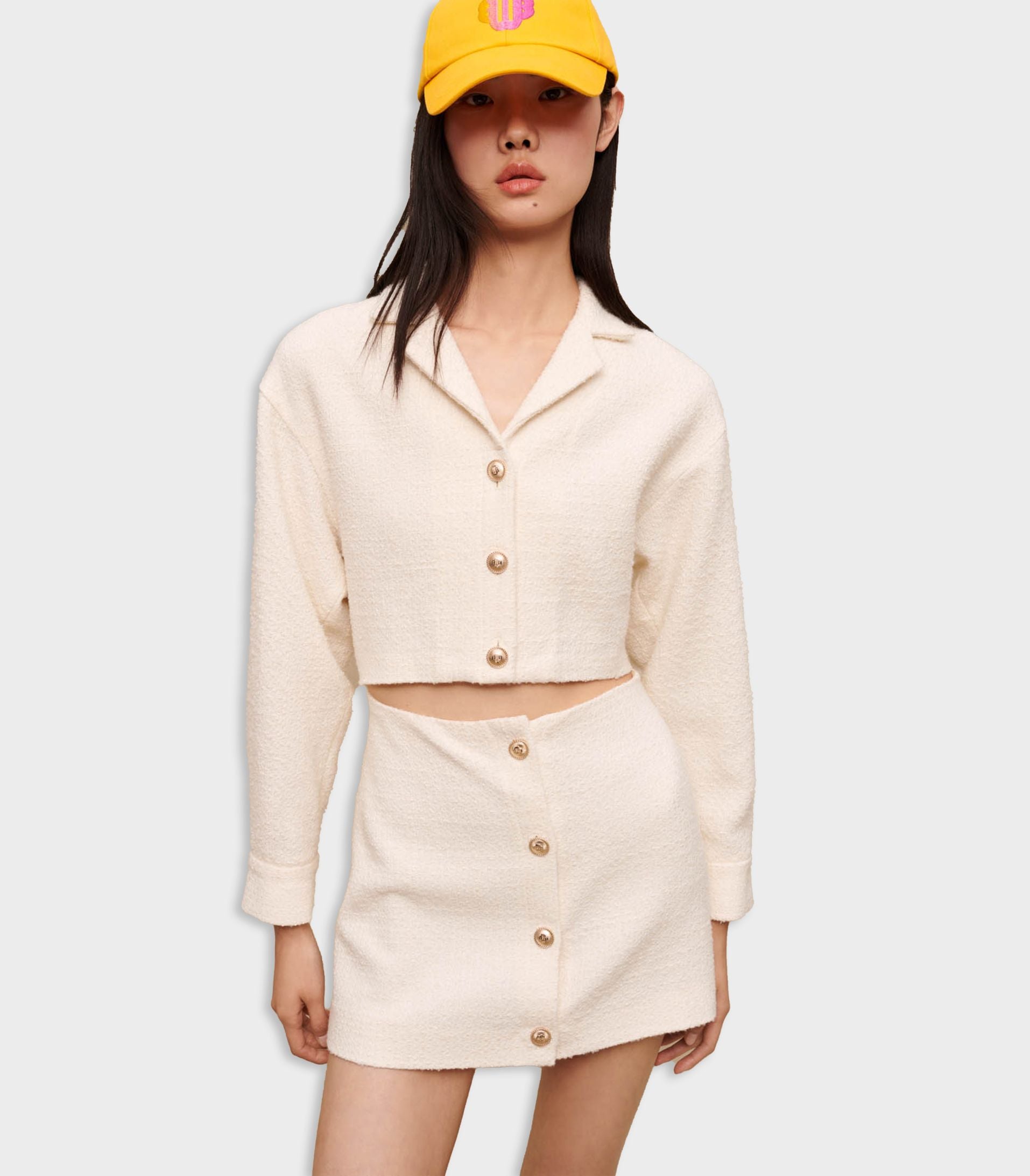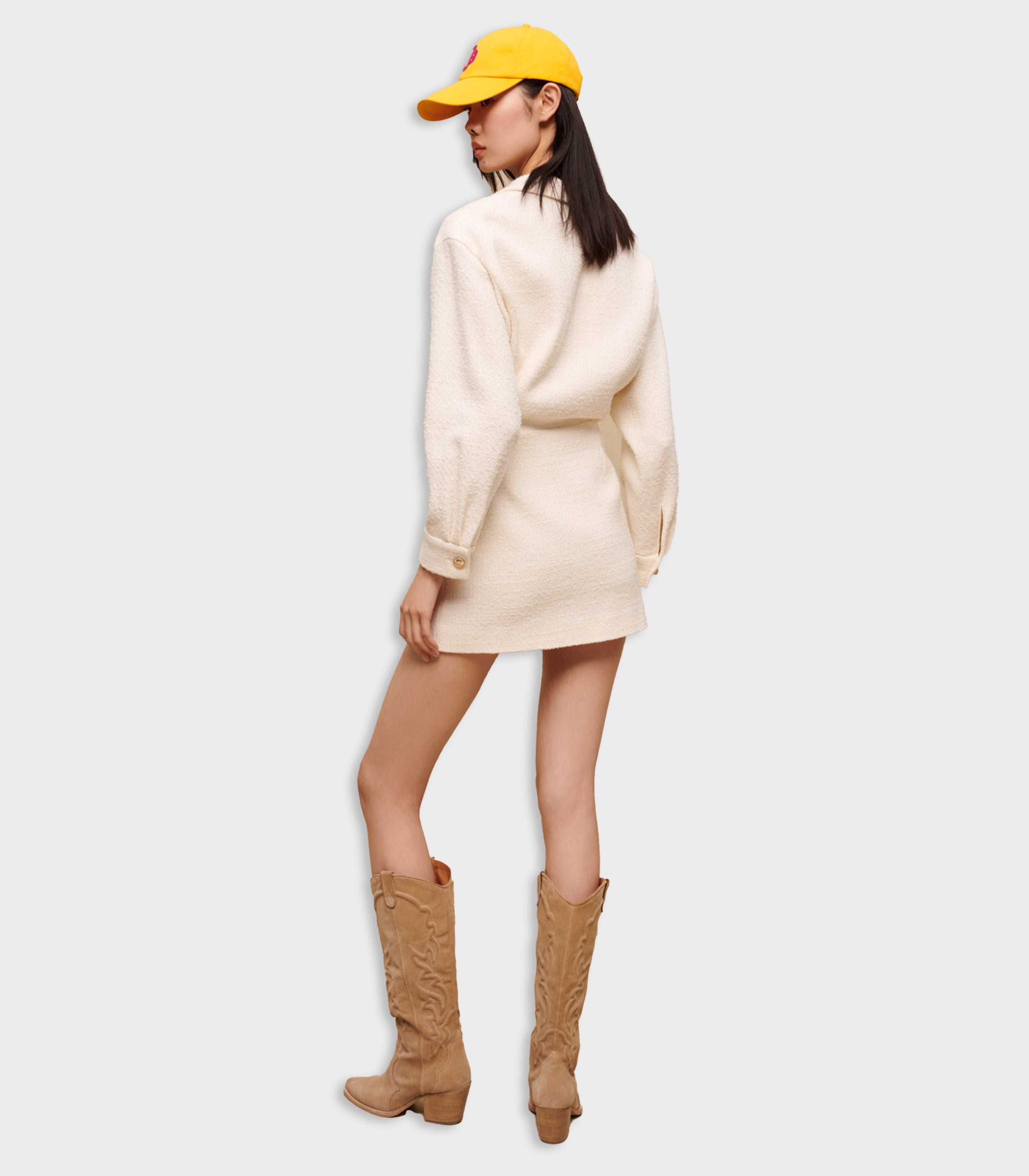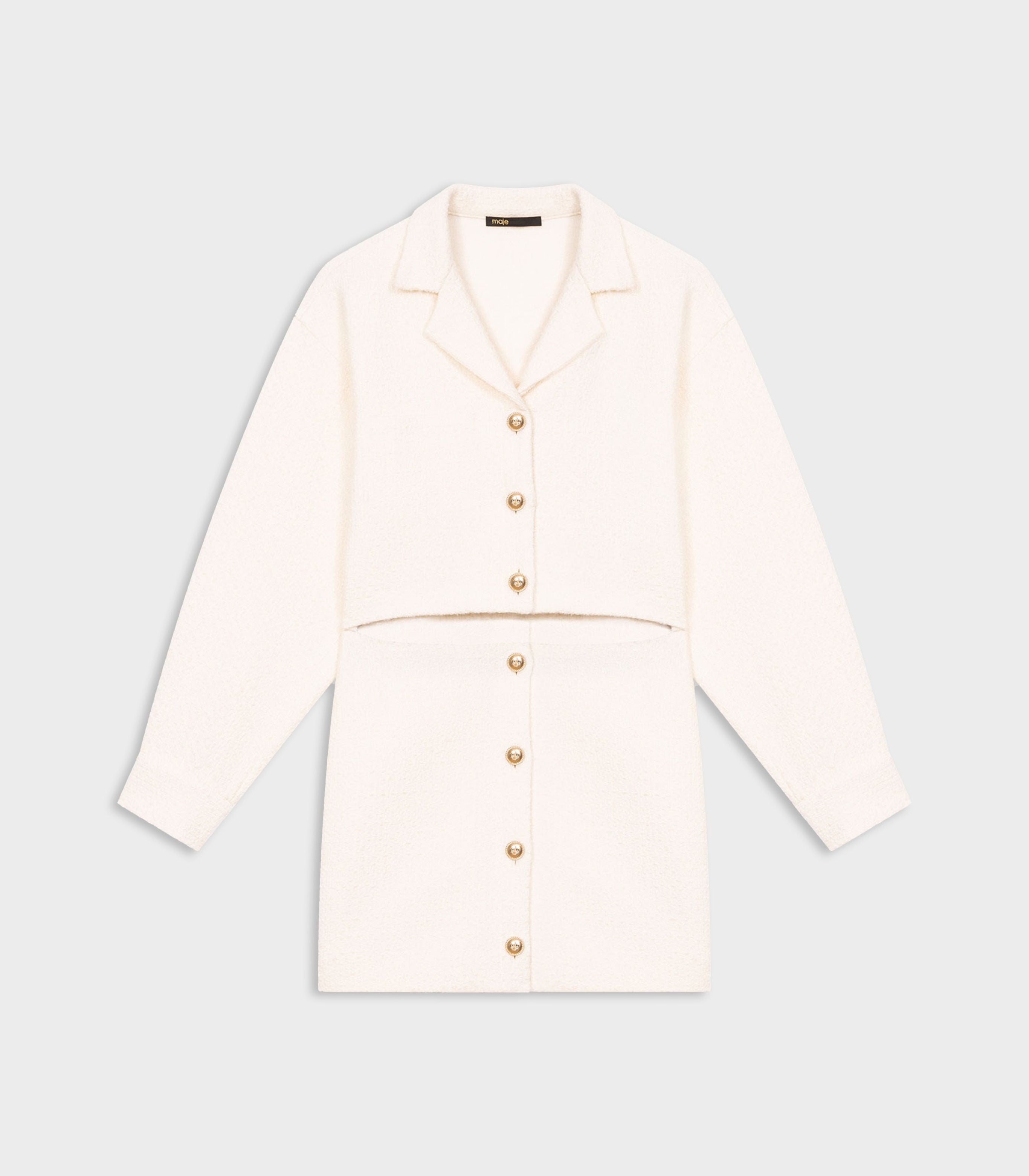 • Short, straight-cut dress, fitted at back, in thick, textured fantasy tweed. Long, loose sleeves with cuffs. Lined. Collar and open neckline to adjust with buttons. Darts at the back. Gold-tone metal Maje Clover buttons at front. Front opening at waist. Perfect for during the day for a special occasion or at the office.