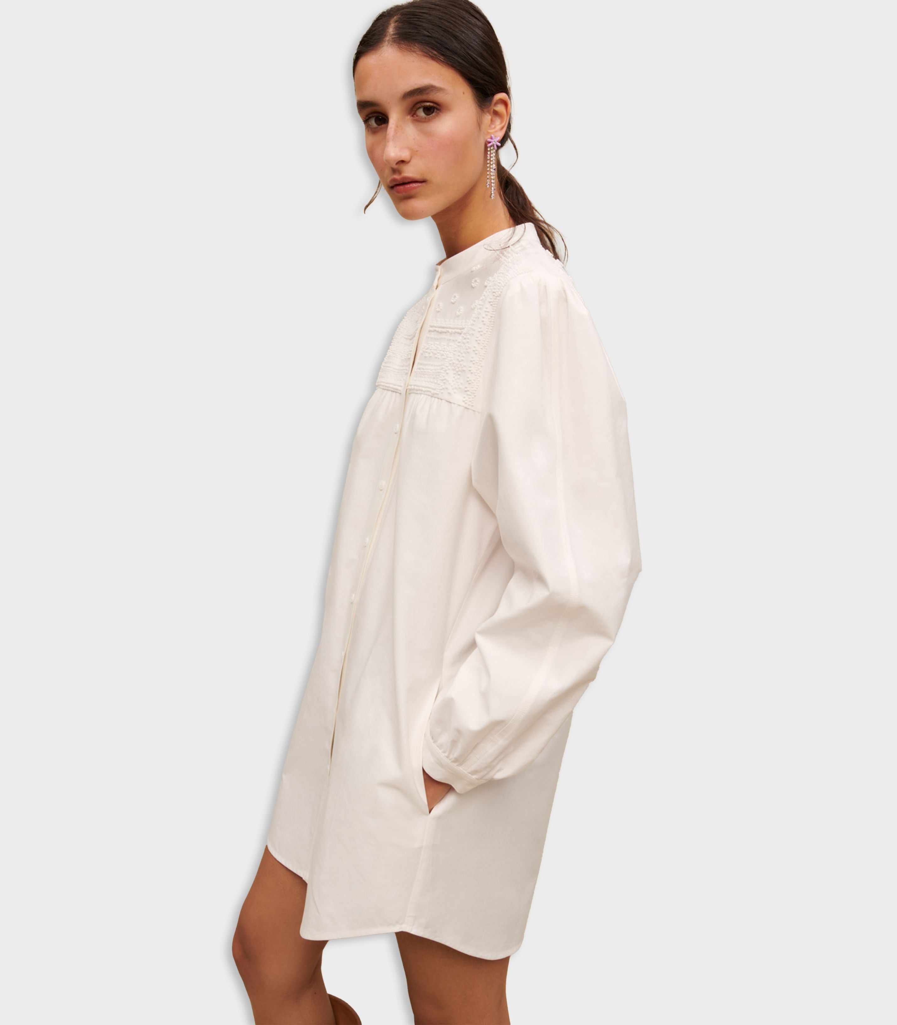 • This mini dress stylishly updates volumes by adopting oversized sleeves. It features delicate buttons which can be worn more open or closed depending on your mood or the occasion.