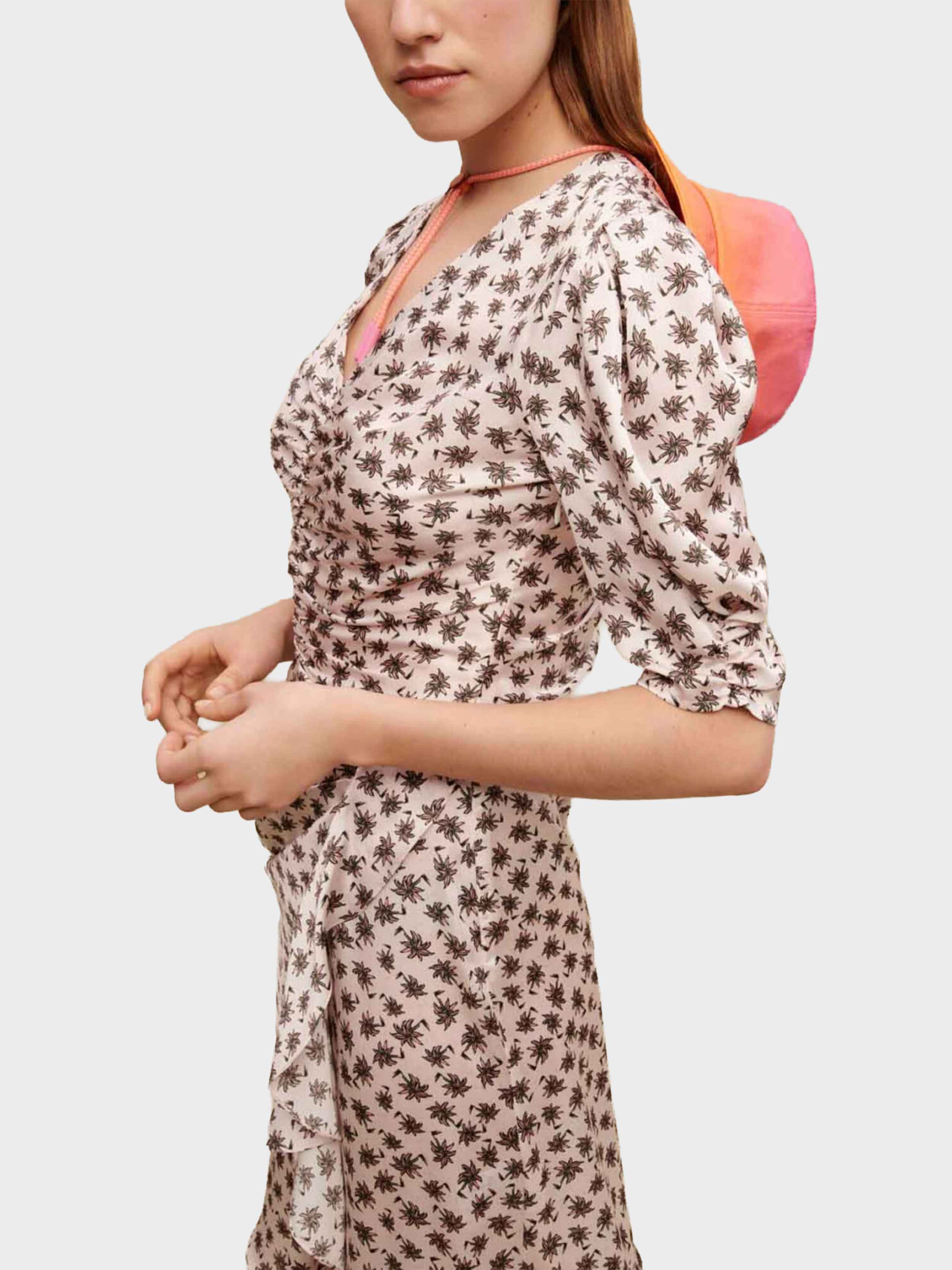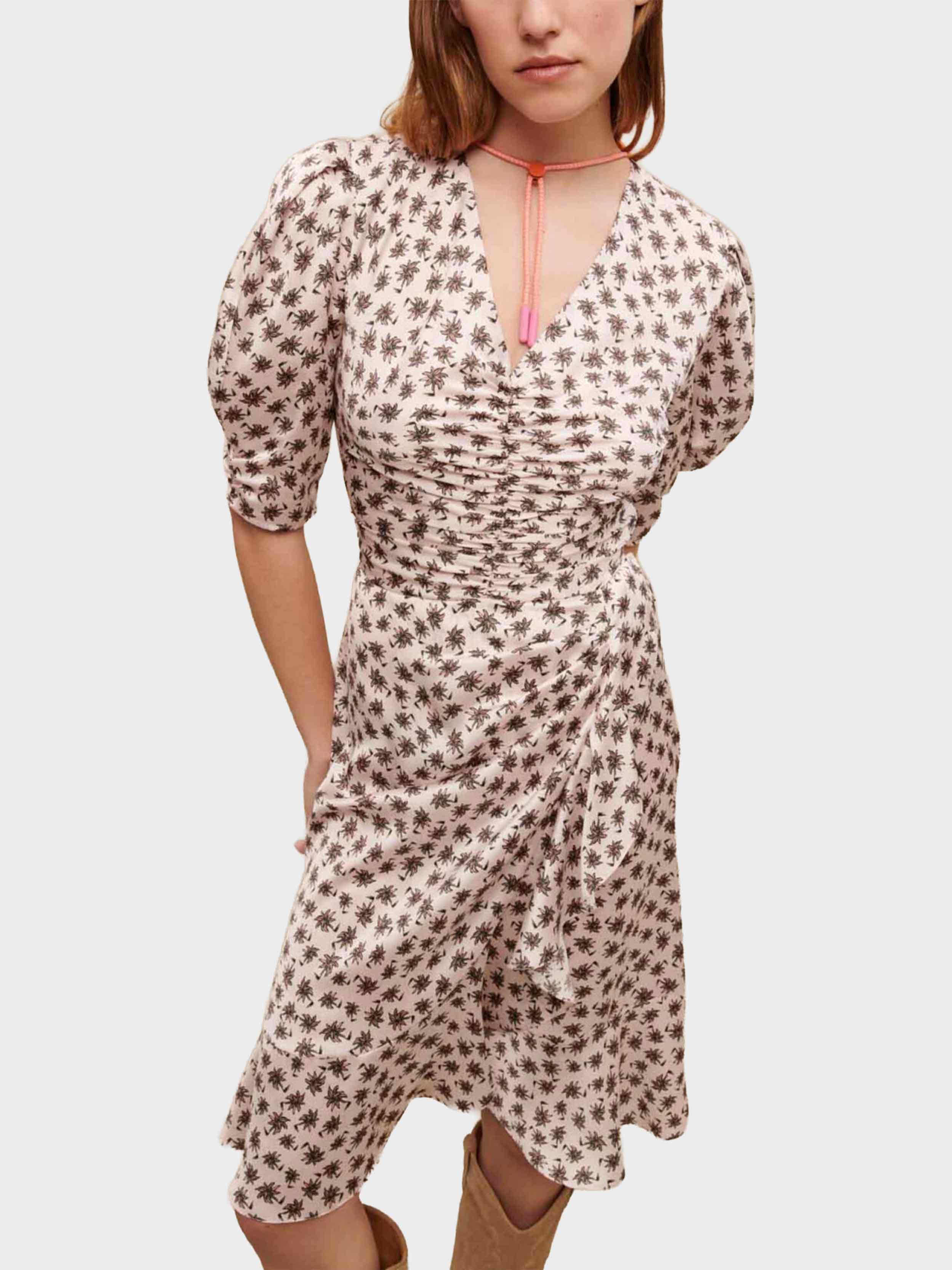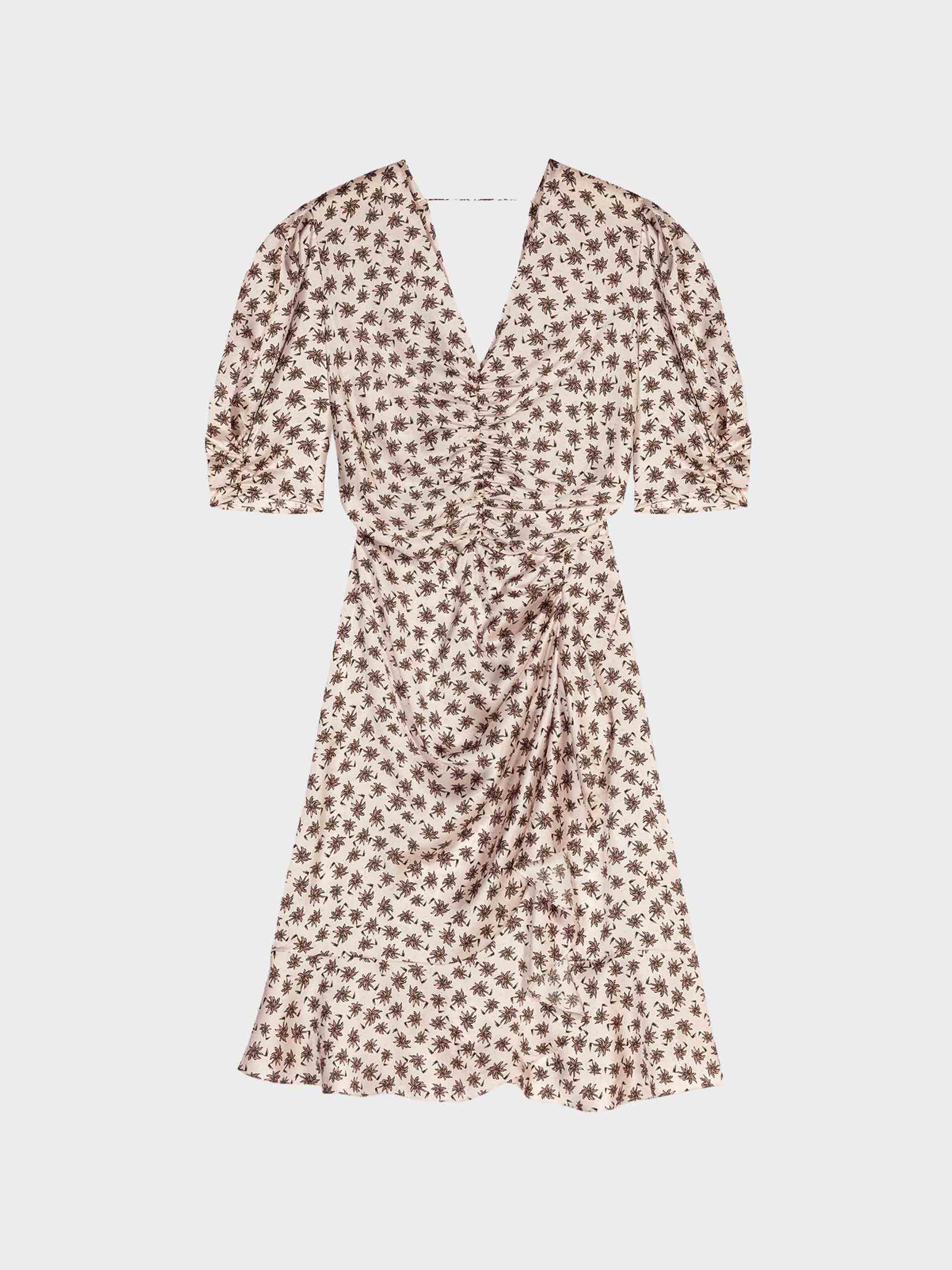 • This palm-tree print dress adopts draping, ruffles and endless feminine details. It features a V neckline, short puff sleeves and a delicate satiny material.