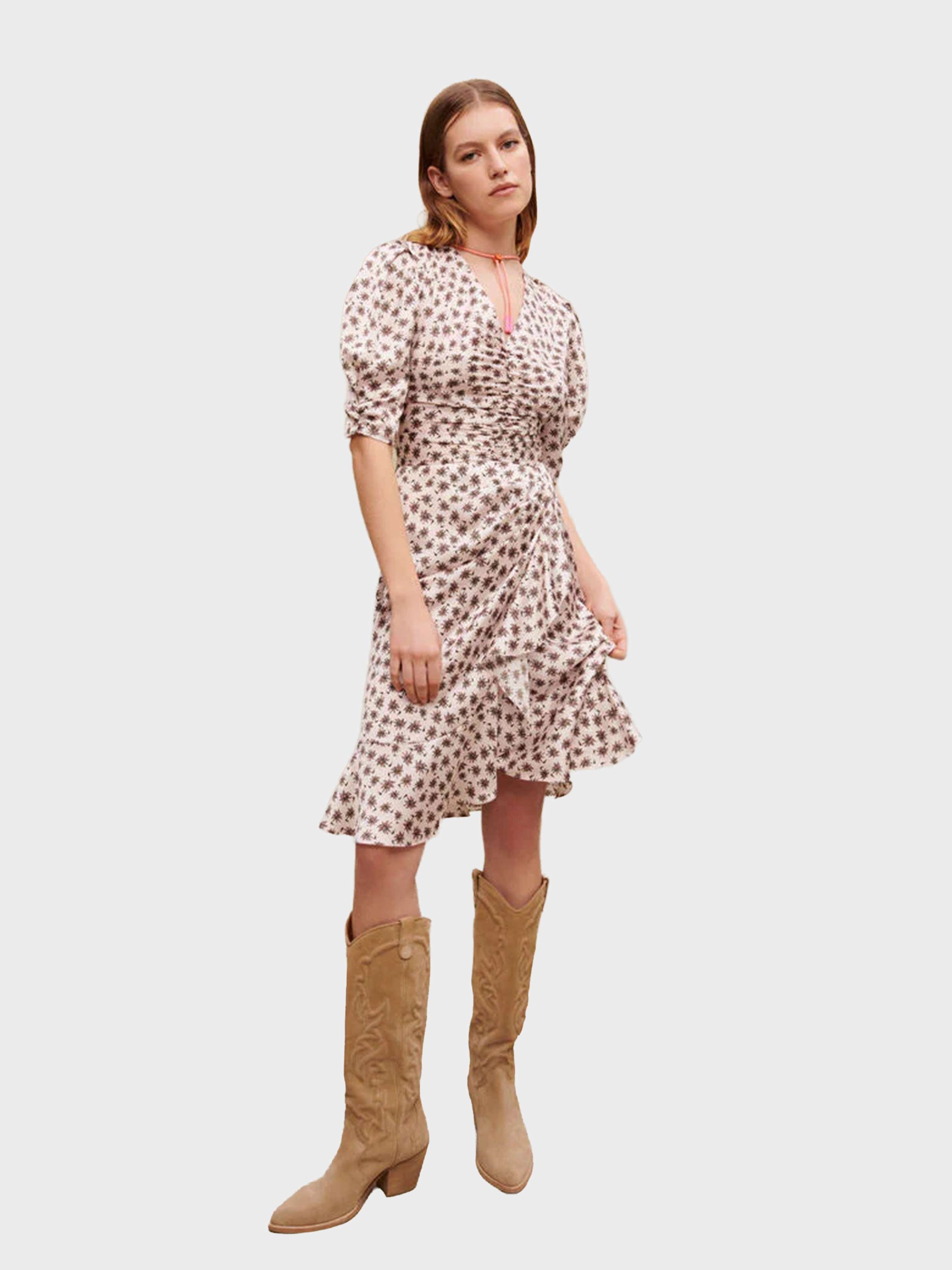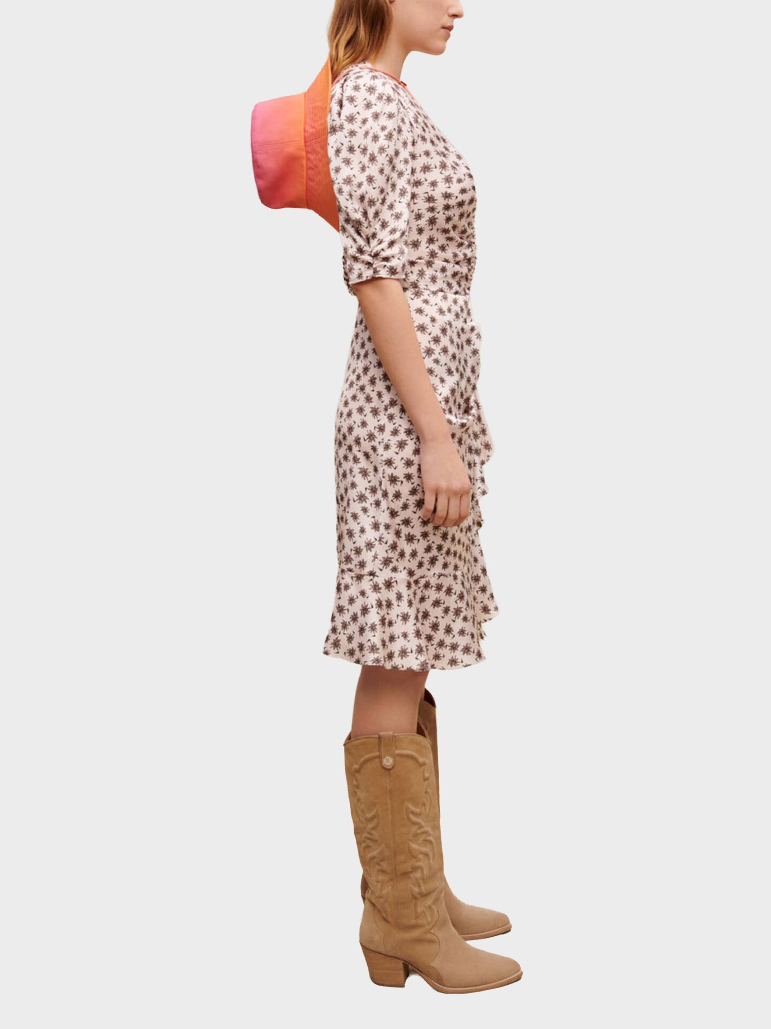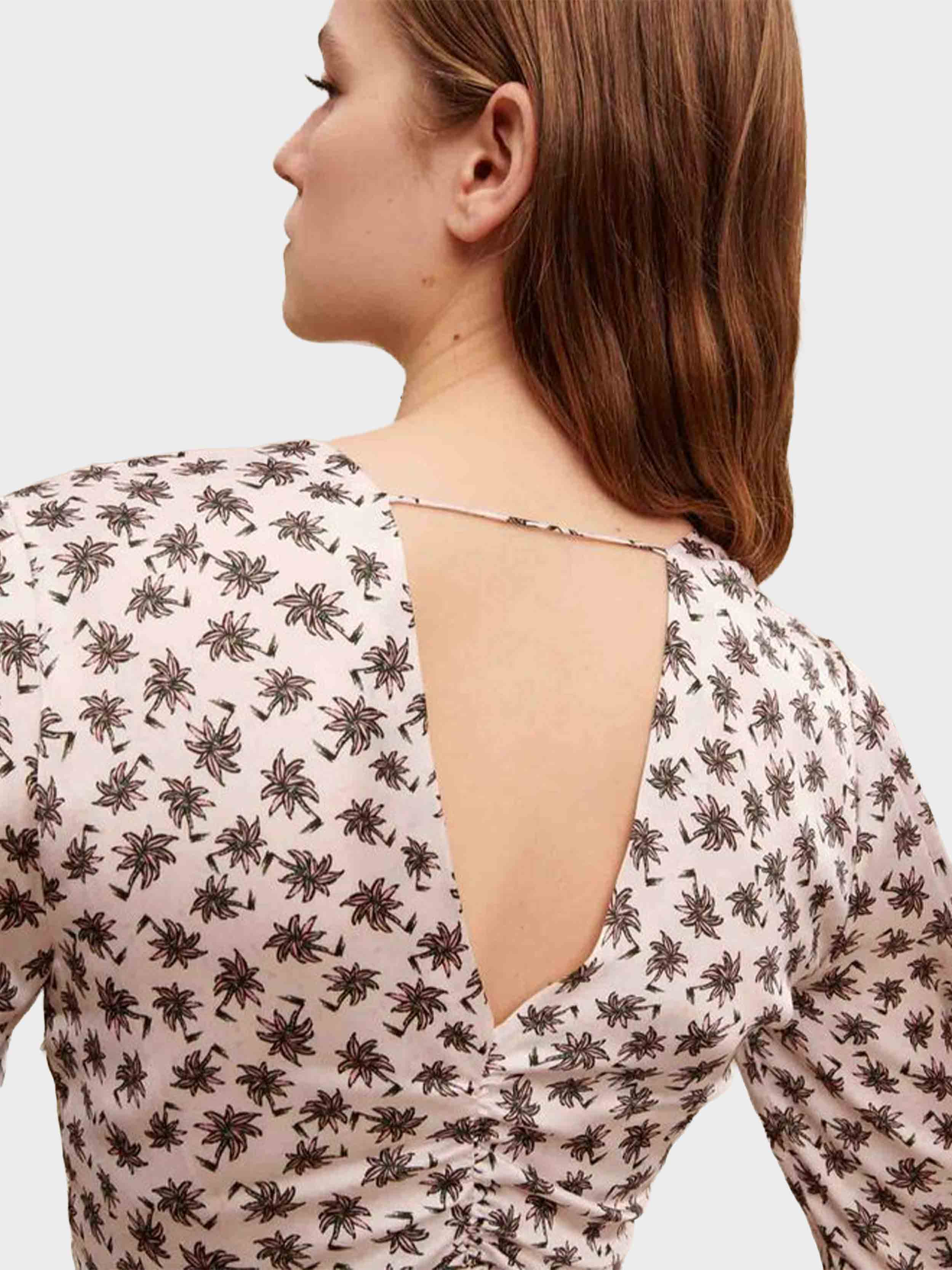 • This palm-tree print dress adopts draping, ruffles and endless feminine details. It features a V neckline, short puff sleeves and a delicate satiny material.