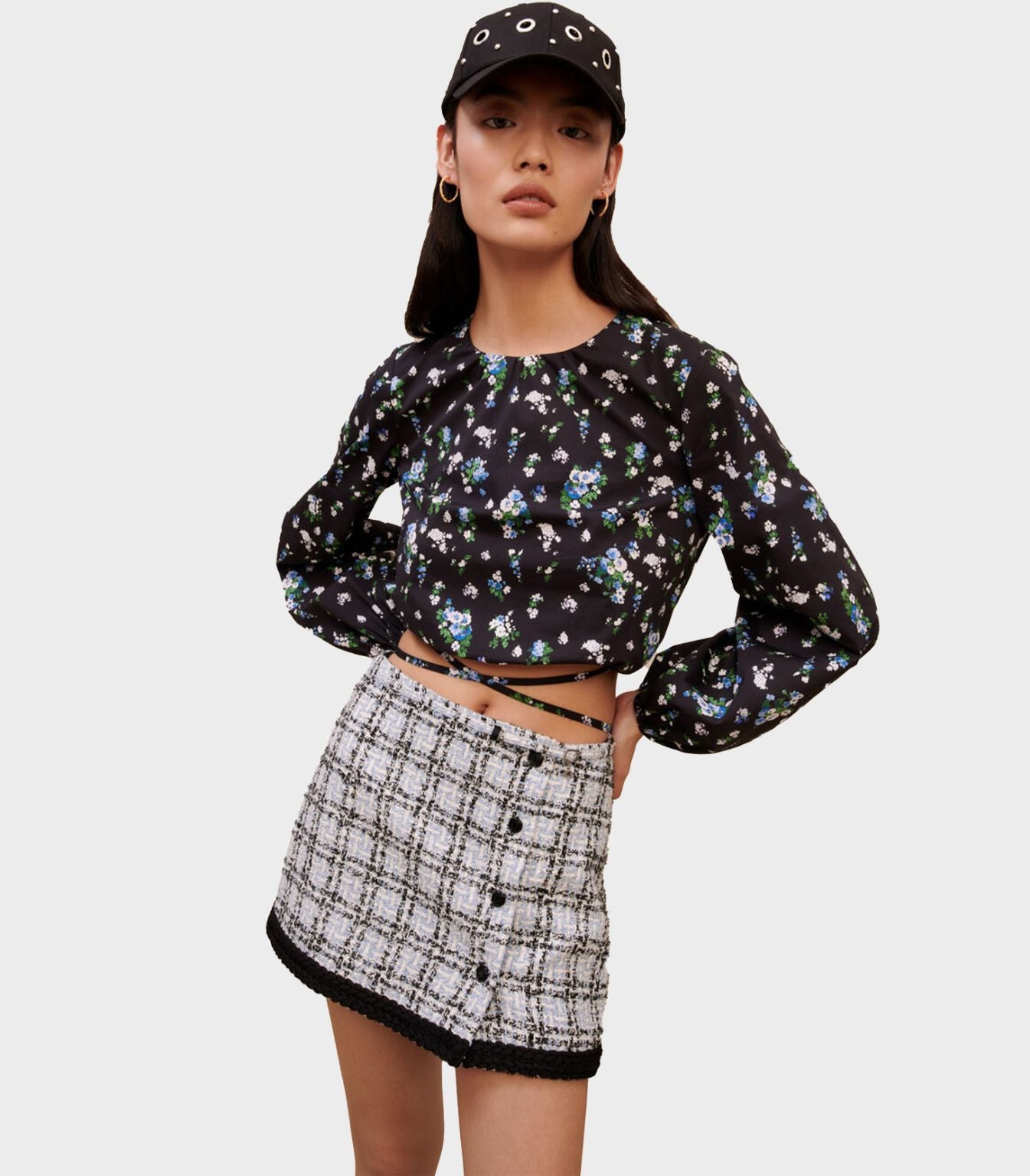 • This floral-print top features slightly loose long sleeves that are tighter at the cuffs. The tie on the hem can be fastened at the front or back, whichever you prefer.