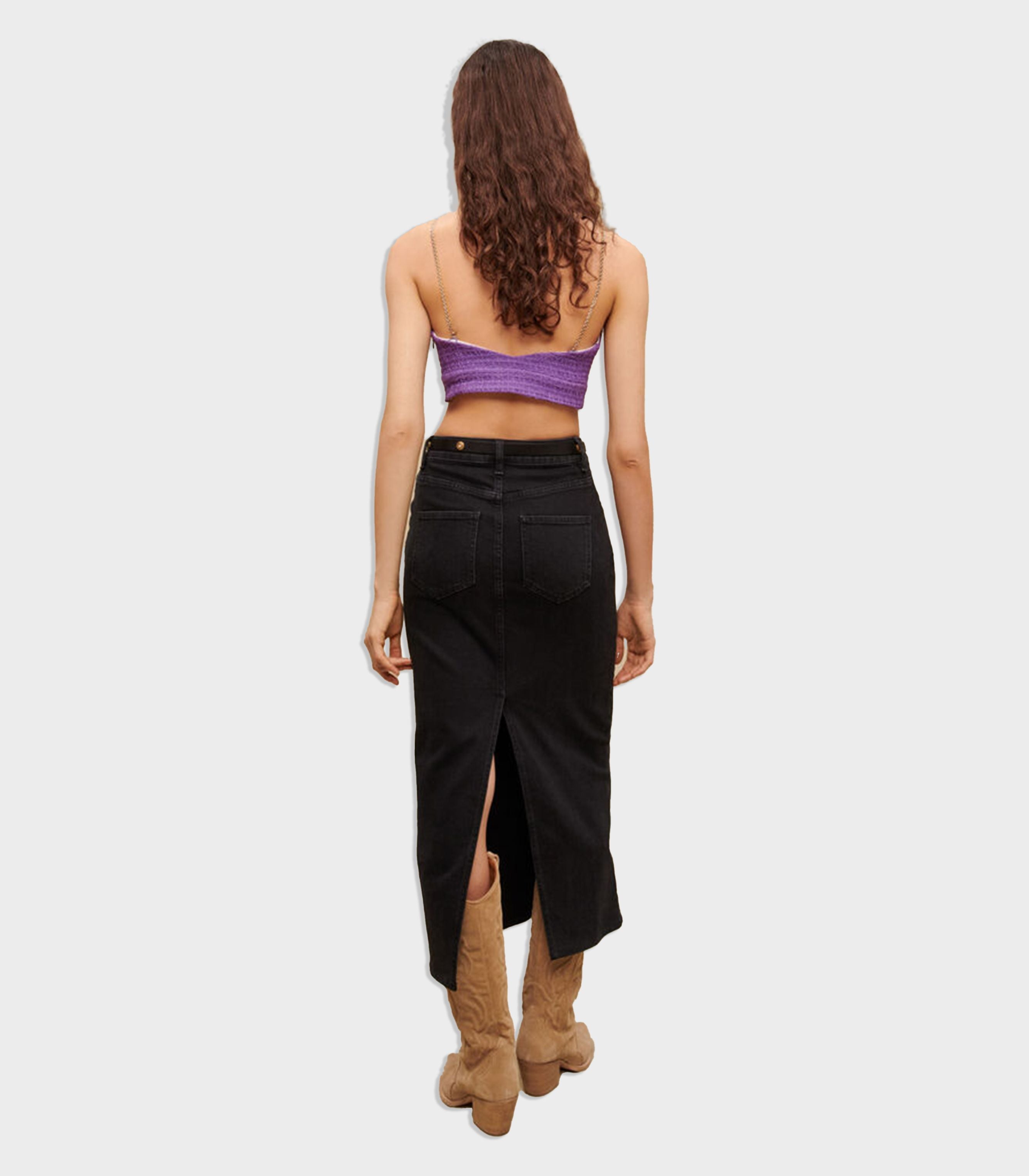 • Maje revisits tweed in a bold way on this bra-style top. Its plunging neckline highlights the metallic chain straps. For a pretty look, play with volume by slipping it under an oversized shirt, and pairing it with the matching skirt.