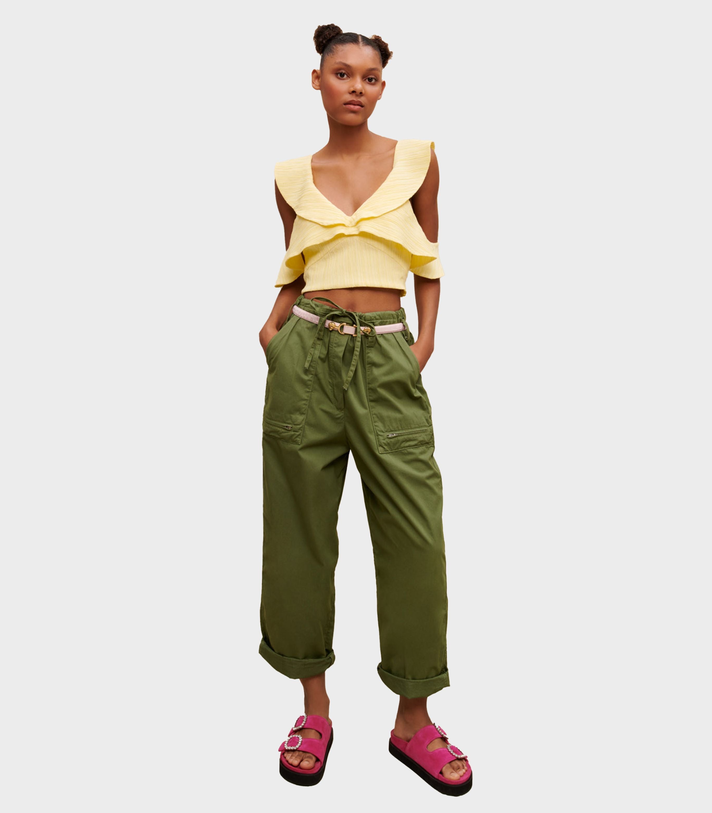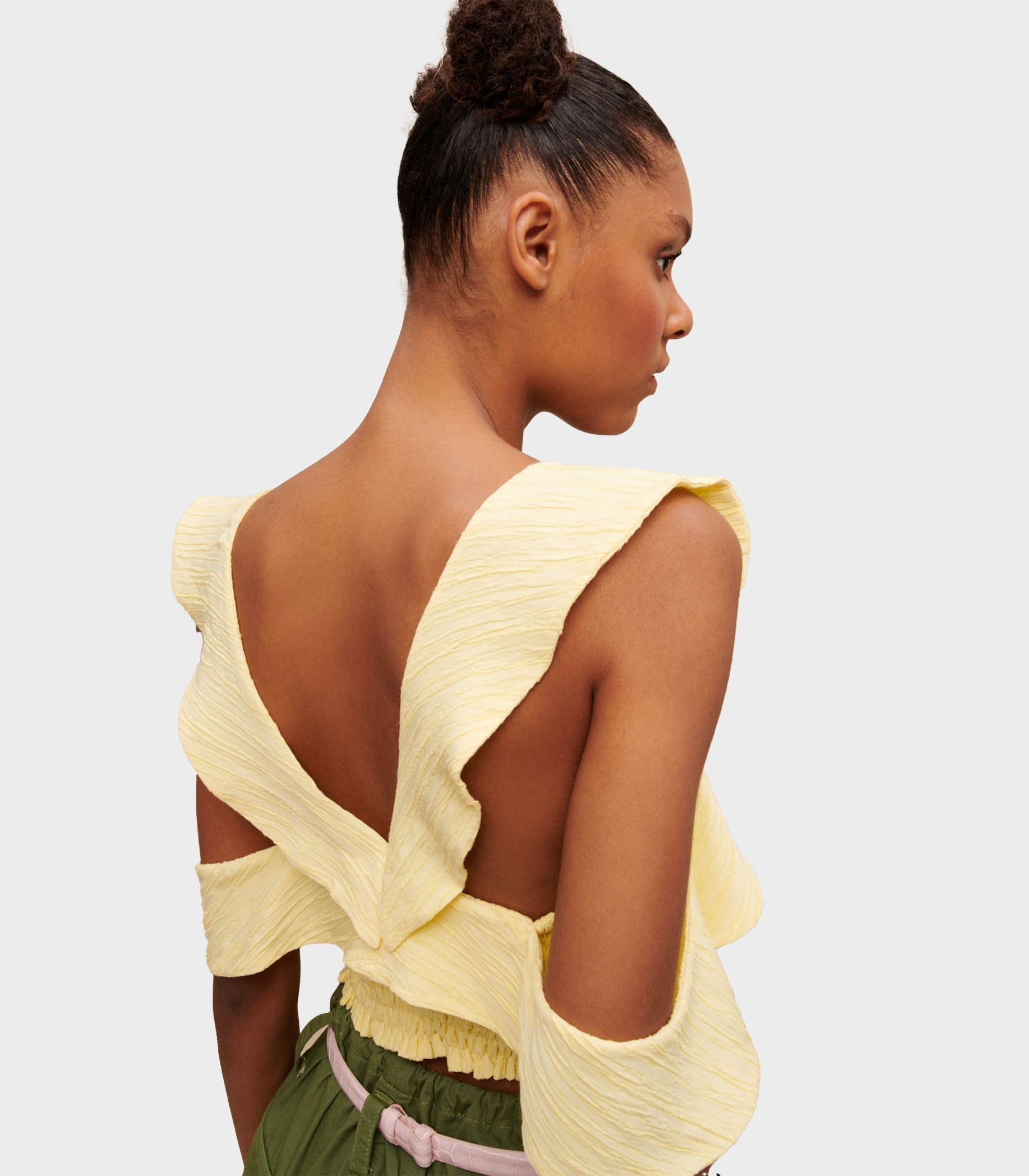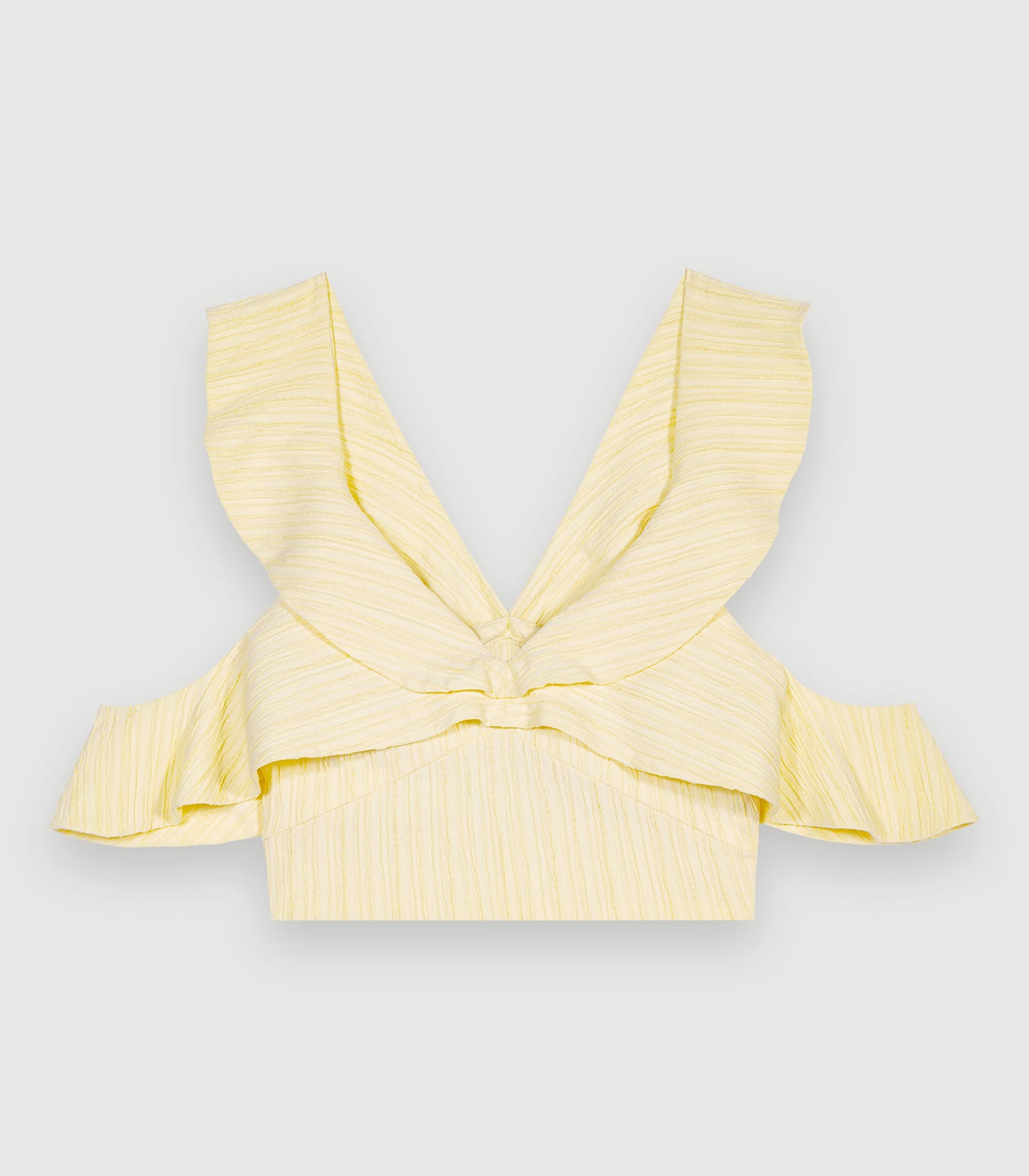 • This crop-top made from a bright yellow shade of crepe fabric has a lovely interplay of volumes for stylish summer silhouettes.