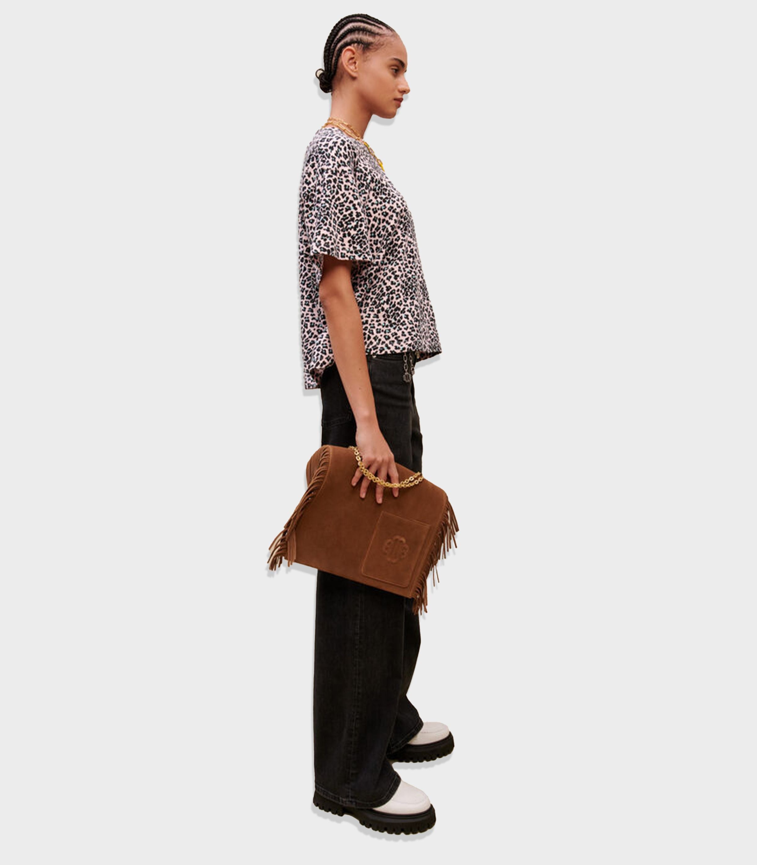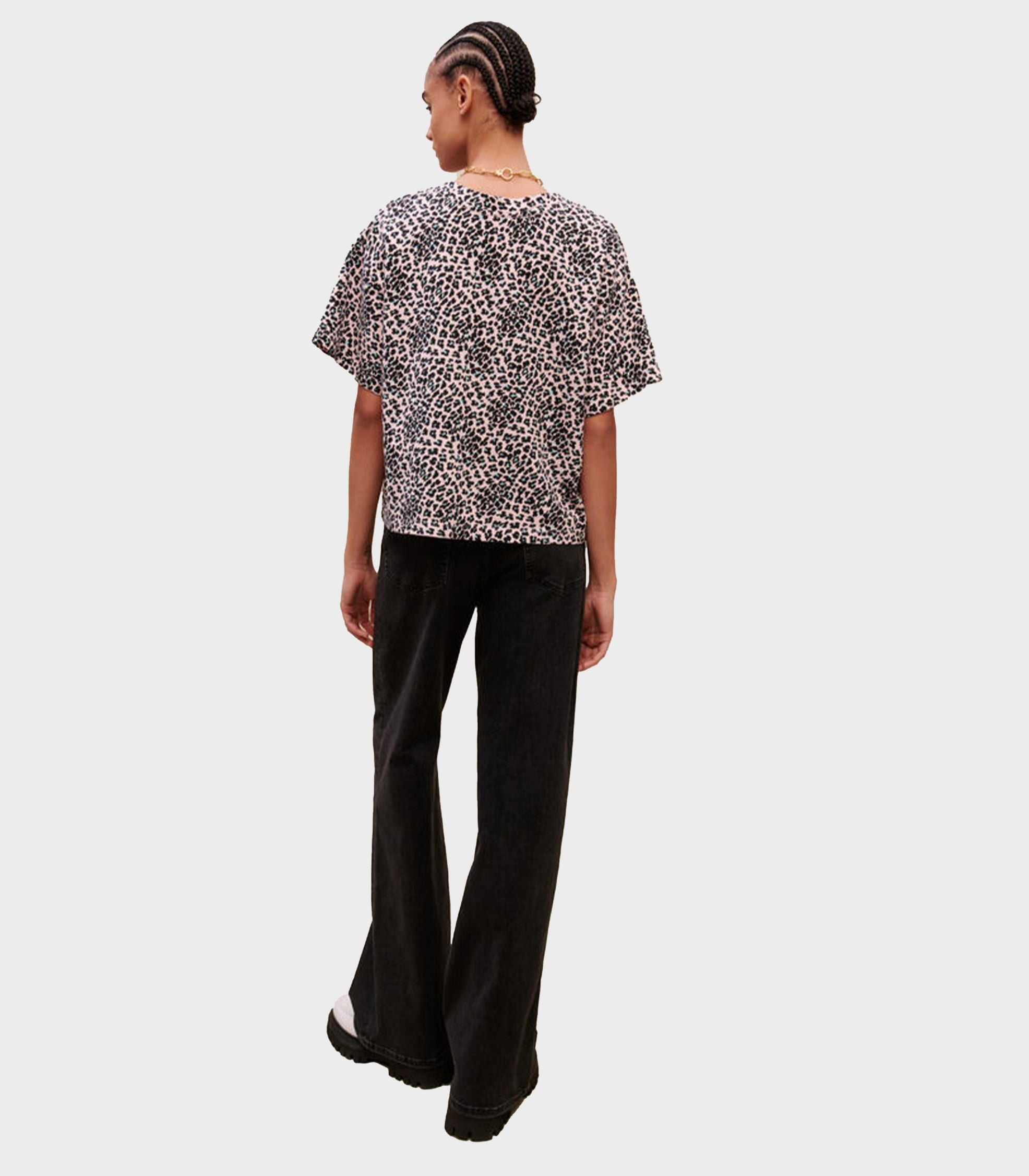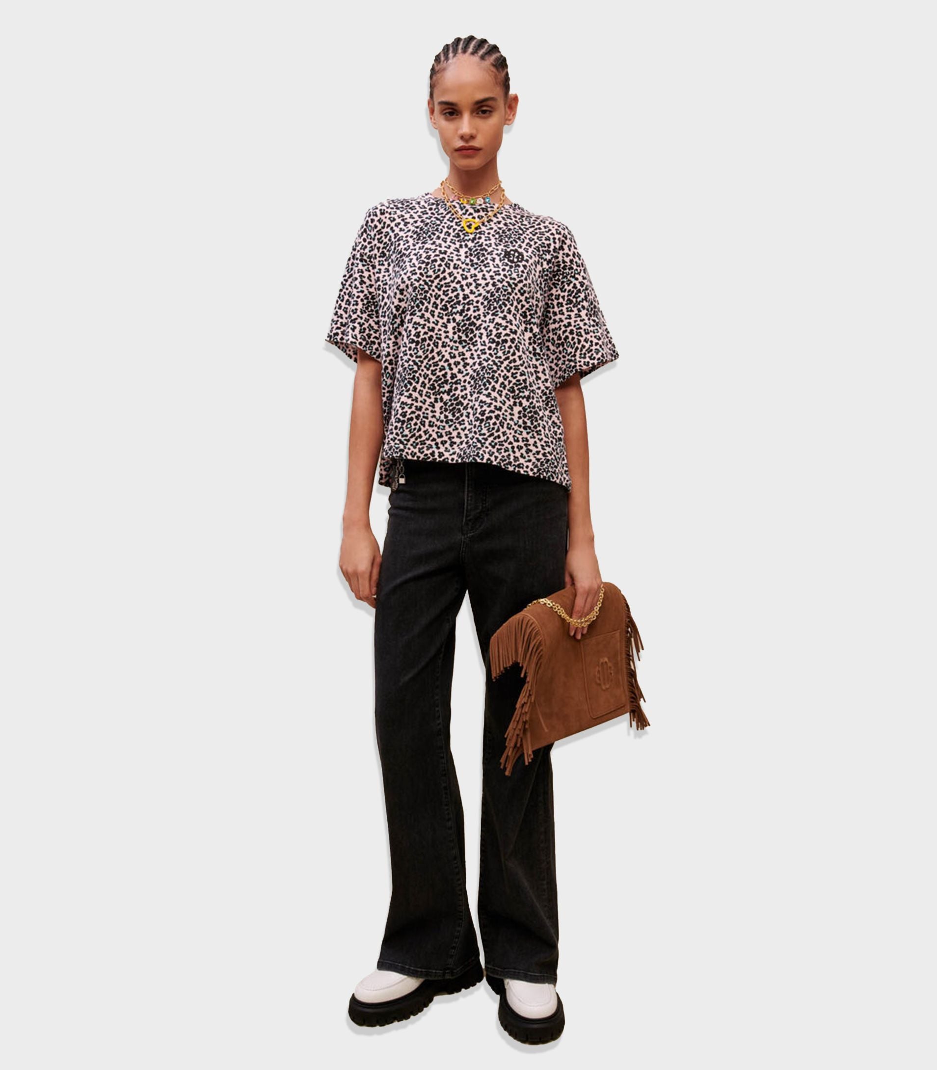 • This 100% cotton T-shirt adopts a pink leopard print this season. Short sleeves, round neckline, Maje Clover detailing on the chest and a slightly oversized cut... It is perfect for everyday wear.