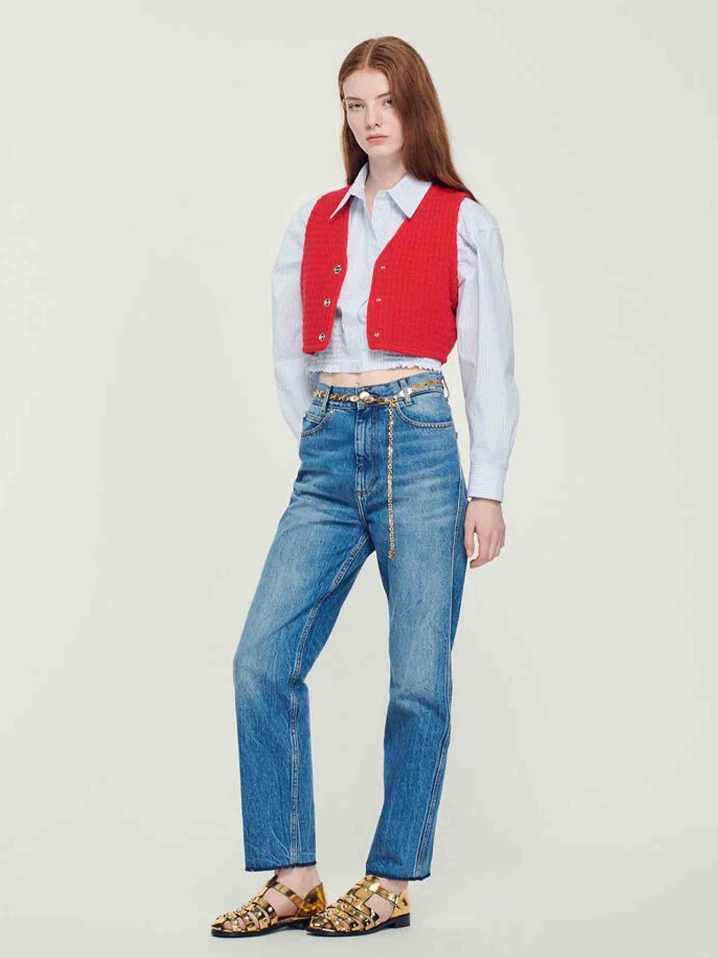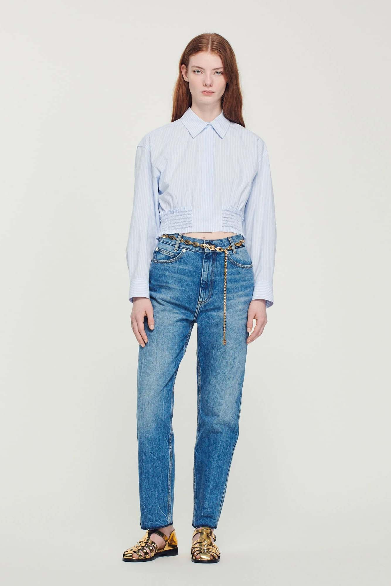 • Cropped shirt in striped poplin featuring a wide smocked waistband, a button fastening, and long sleeves. • Sandro Women's poplin shirt• Long sleeves • Button fastening • Striped print • Smocked hem < The model is 5'10" tall and wears a size 1 FR / 4 US