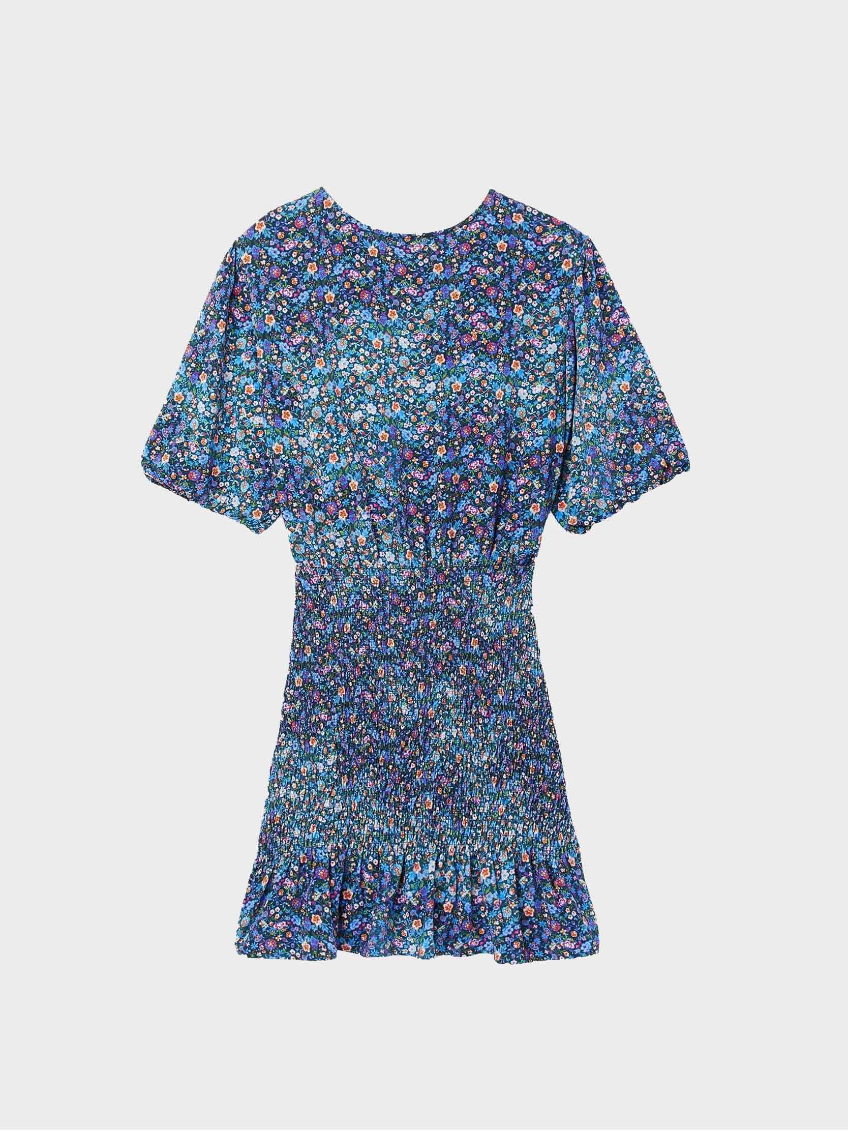 • Short dress with a round neck, short elasticated sleeves, a smocked waist, ruffled skirt, and floral print.