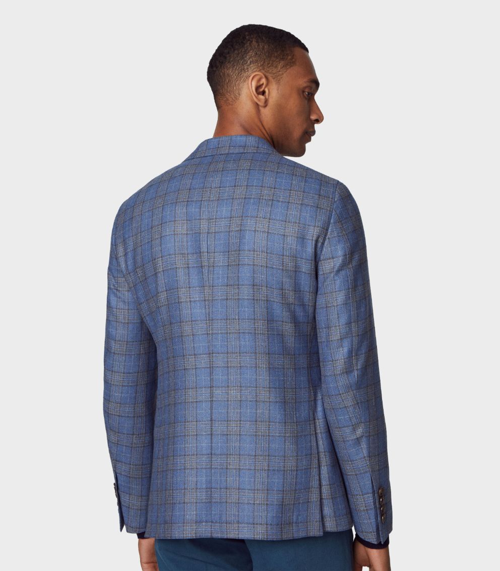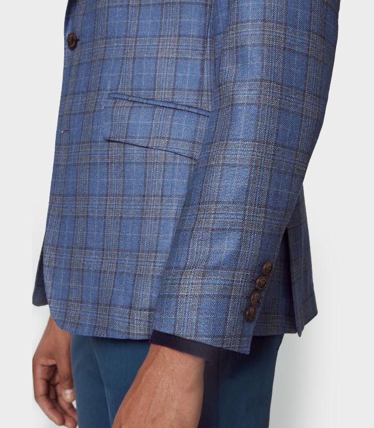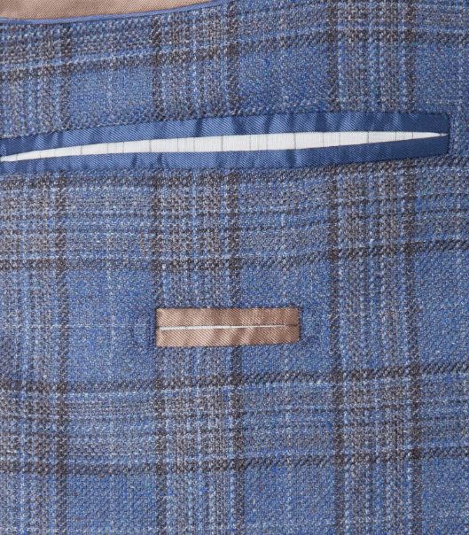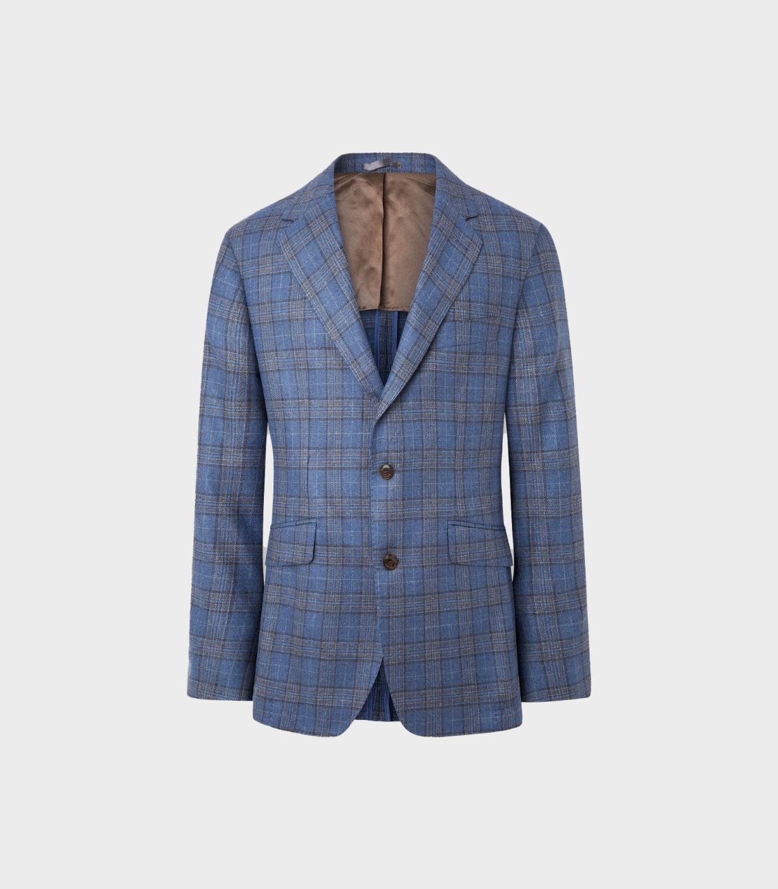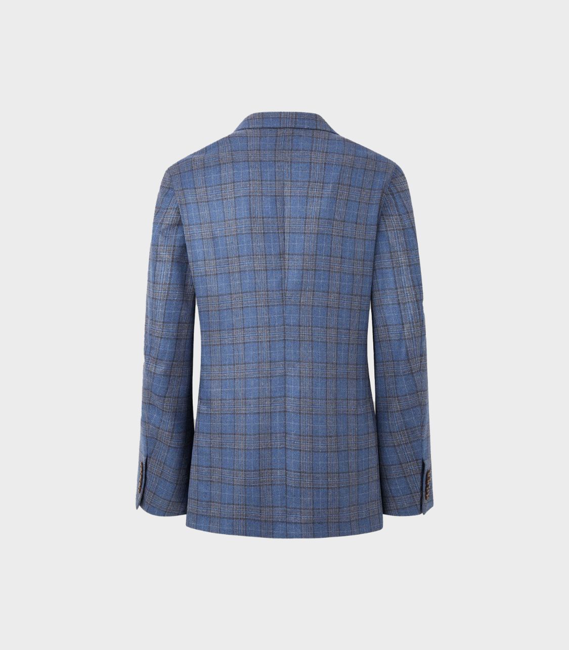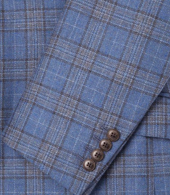 • This jacket in sky blue is crafted from a rich Italian wool-silk-linen blend, featuring a bold windowpane pattern. It offers single-breasted notch lapel styling with patch pockets and signature 2 x 2 working cuffs, complemented by genuine mother of pearl buttons. A lightweight and comfortable summer jacket.