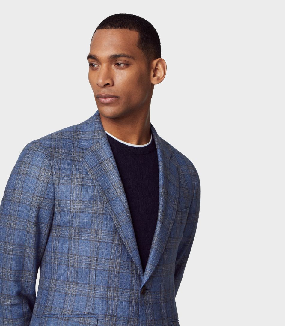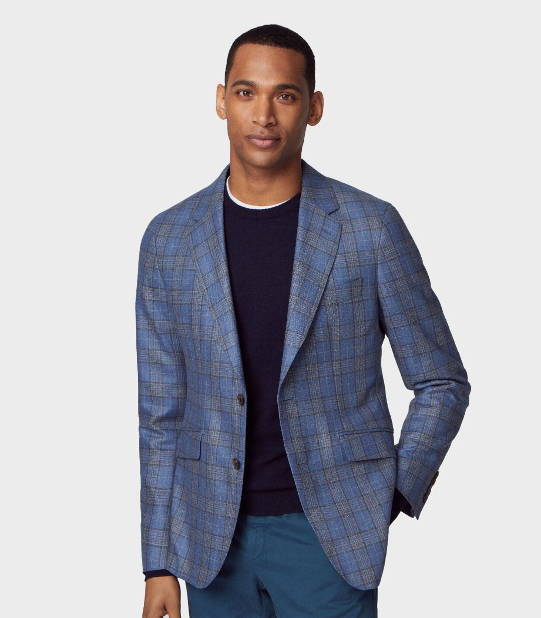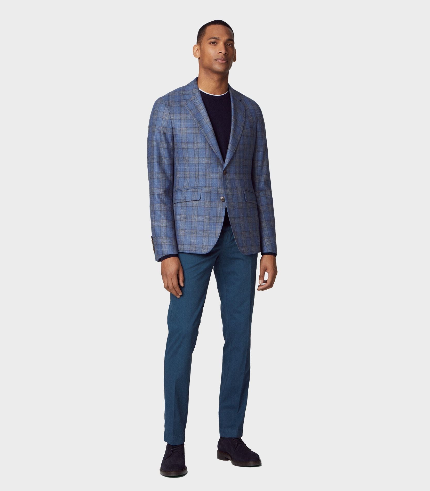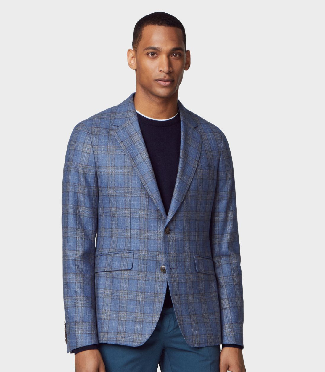 • This jacket in sky blue is crafted from a rich Italian wool-silk-linen blend, featuring a bold windowpane pattern. It offers single-breasted notch lapel styling with patch pockets and signature 2 x 2 working cuffs, complemented by genuine mother of pearl buttons. A lightweight and comfortable summer jacket.