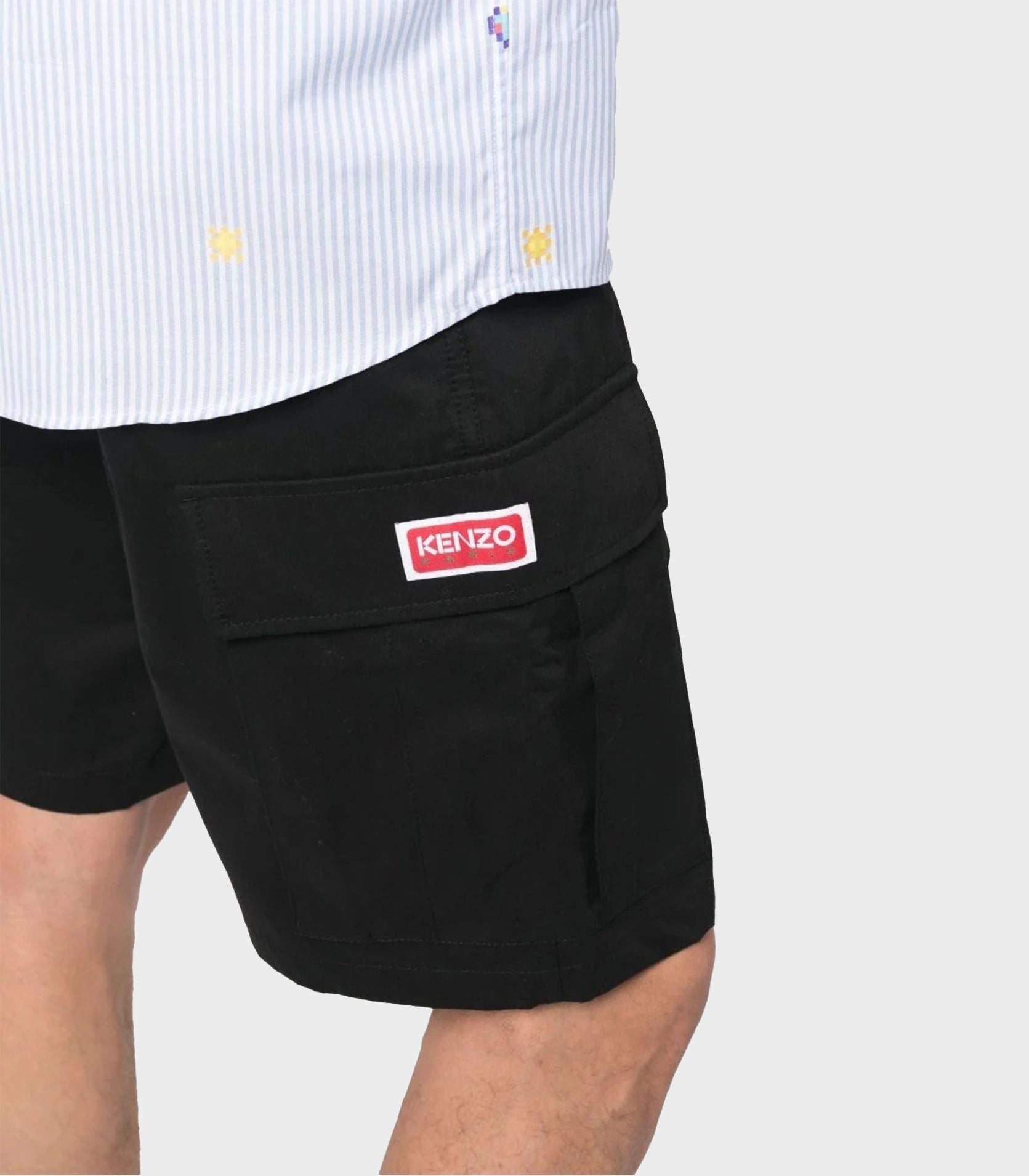 • logo-patch cotton Bermuda shorts from KENZO featuring black, cotton, logo patch to the side, front button and zip fastening, knee-length, two side slit pockets, two side flap pockets and two rear flap pockets.