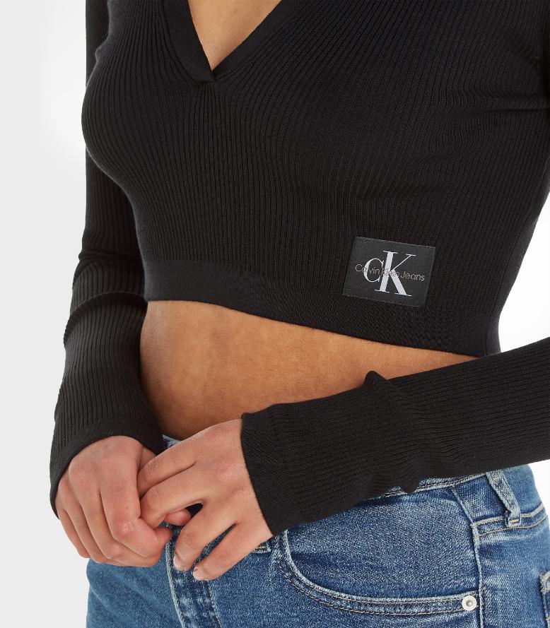 Calvin klein jeans - label tight crop v-neck sweater , xs , ck black , style j20j221969