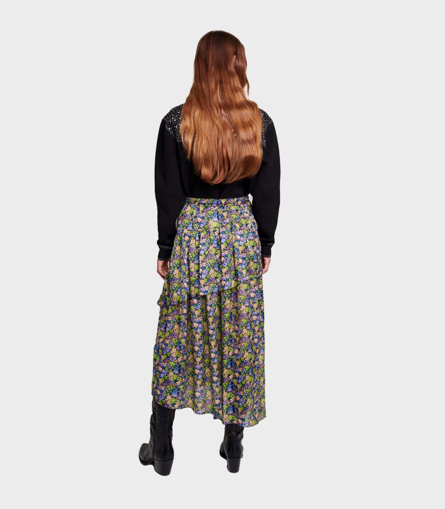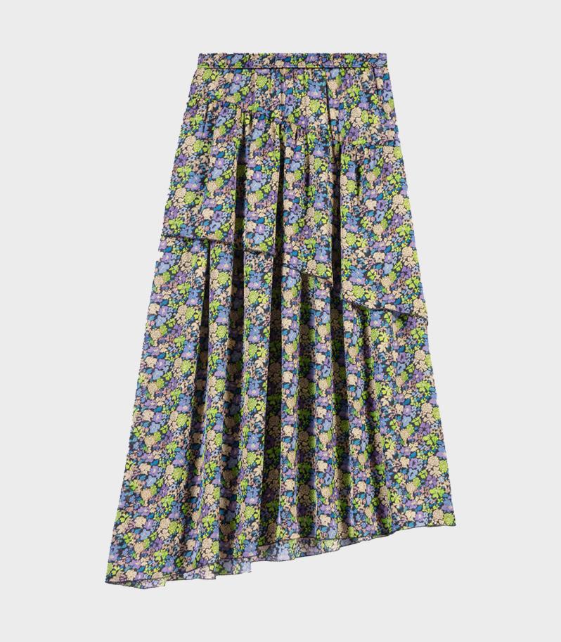 • The key print of the season is featured on this long, satin skirt with a perfect drape. With an elasticated waistband, it features a short ruffle at the top for a light, airy silhouette.