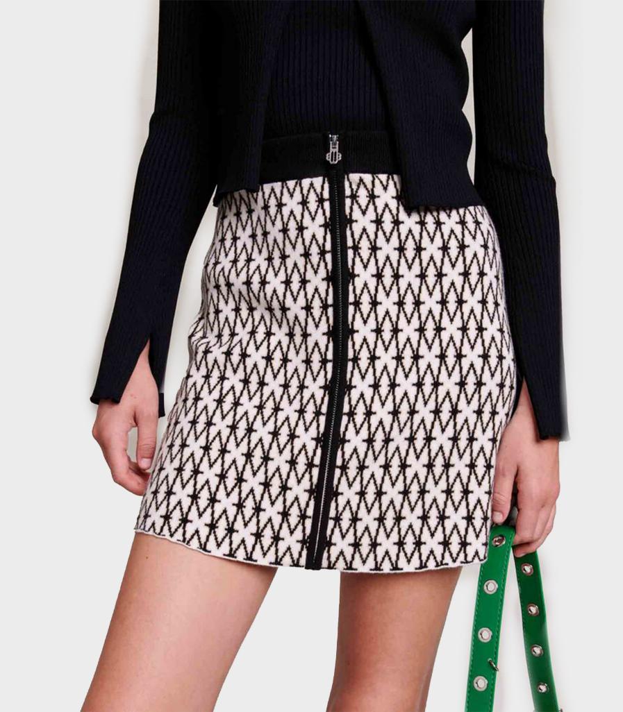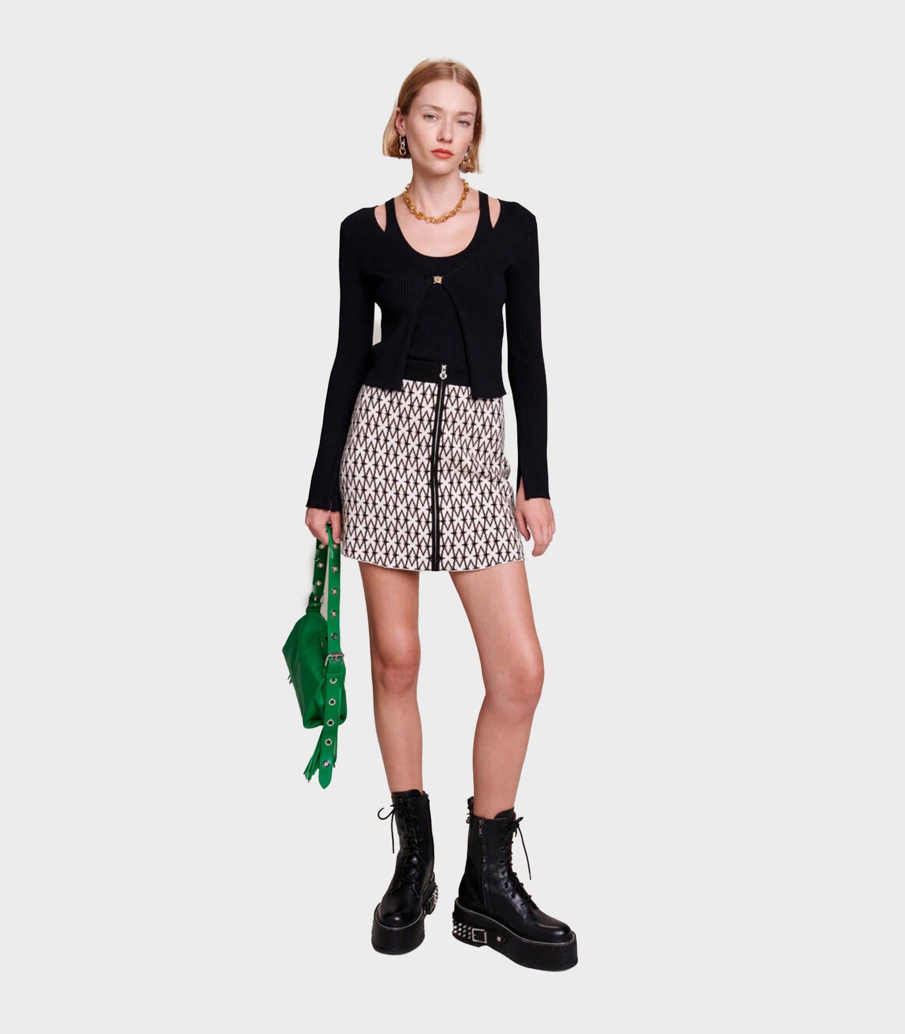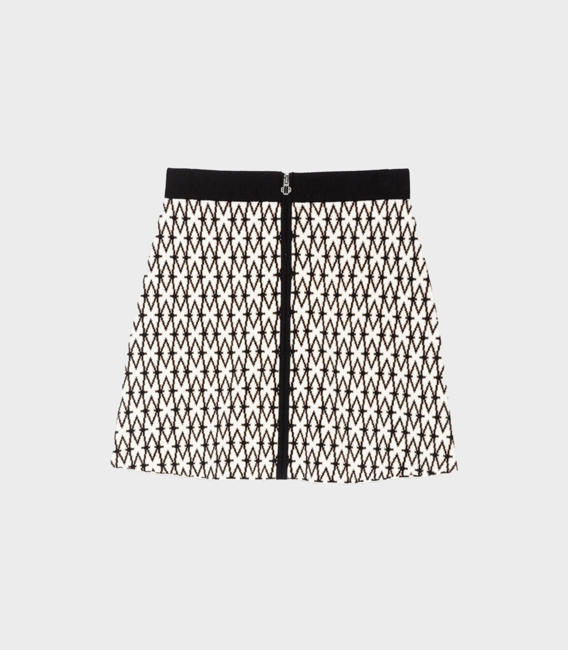 • For the new collection, the studio pays tribute to British elegance. Tailored fit and chic details, a retro and sexy rereading of classic items. This short, warp knit miniskirt endows an elegant silhouette. With a ribbed and elasticated waist, it features a black and white, jacquard monogrammed M and contrasting zip fastening with Clover pull-tab. Perfect for daytime or office wear, it goes with everything. Pair it with a top and some ankle boots for a chic and casual look.