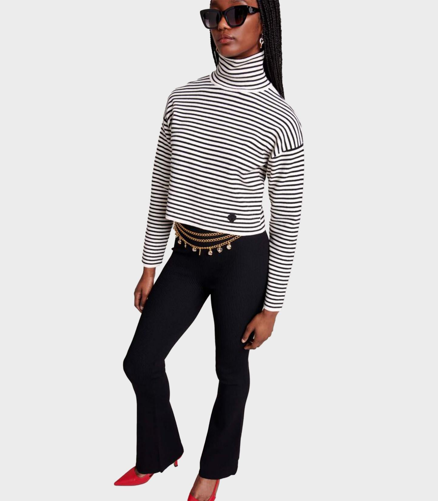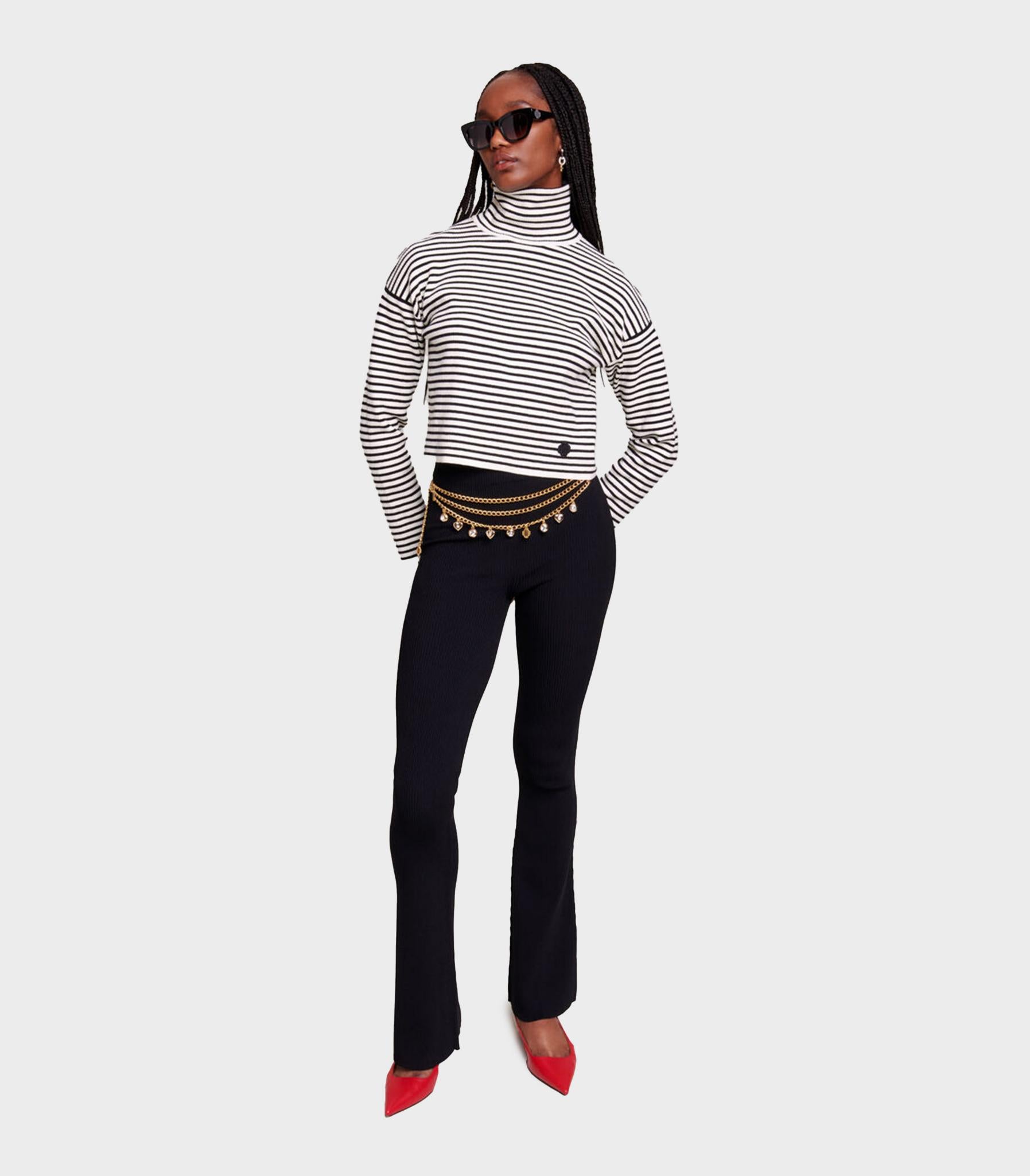 • These ribbed knit trousers have a streamlined shape with a slight flare at the bottom and hug the figure. With an elasticated waist, they fall perfectly and create a sleek silhouette. For a two-tone look, you can add a striped turtleneck jumper and accessorise with a pair of colourful heels and a tasselled belt.