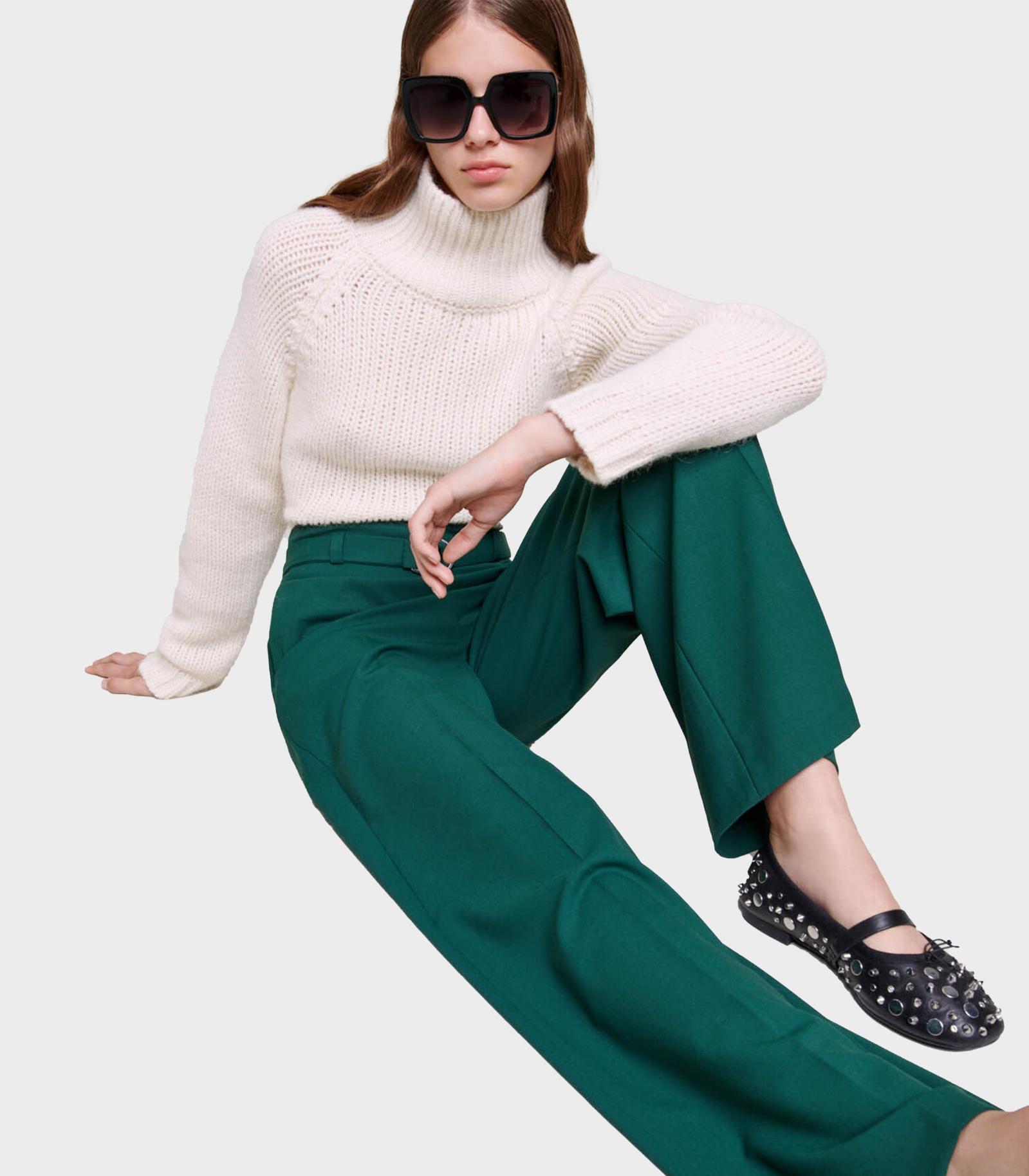 • English green is in this season, and these classic wide-leg suit trousers are made from a shimmering twill in this colour. Supremely chic, they feature a zip fastening, front creases and two pockets. With an oversize loose fit, their waist is accentuated by a belt with an adjustable buckle, creating a fluid, structured, alluring silhouette.