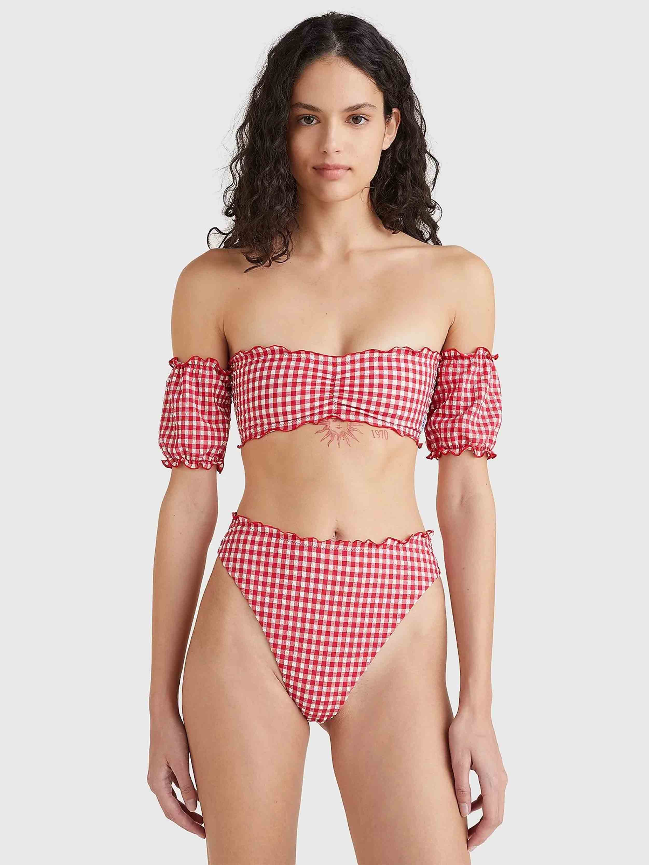 Tommy hilfiger - high leg cheeky bikini , m , primary red and white gingham , style uw0uw03392