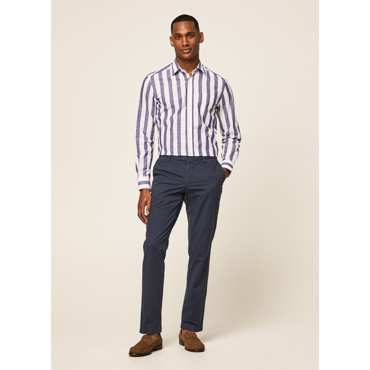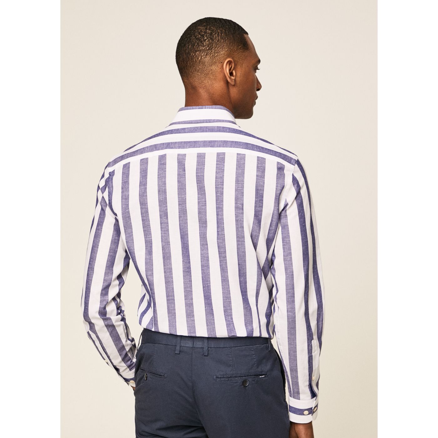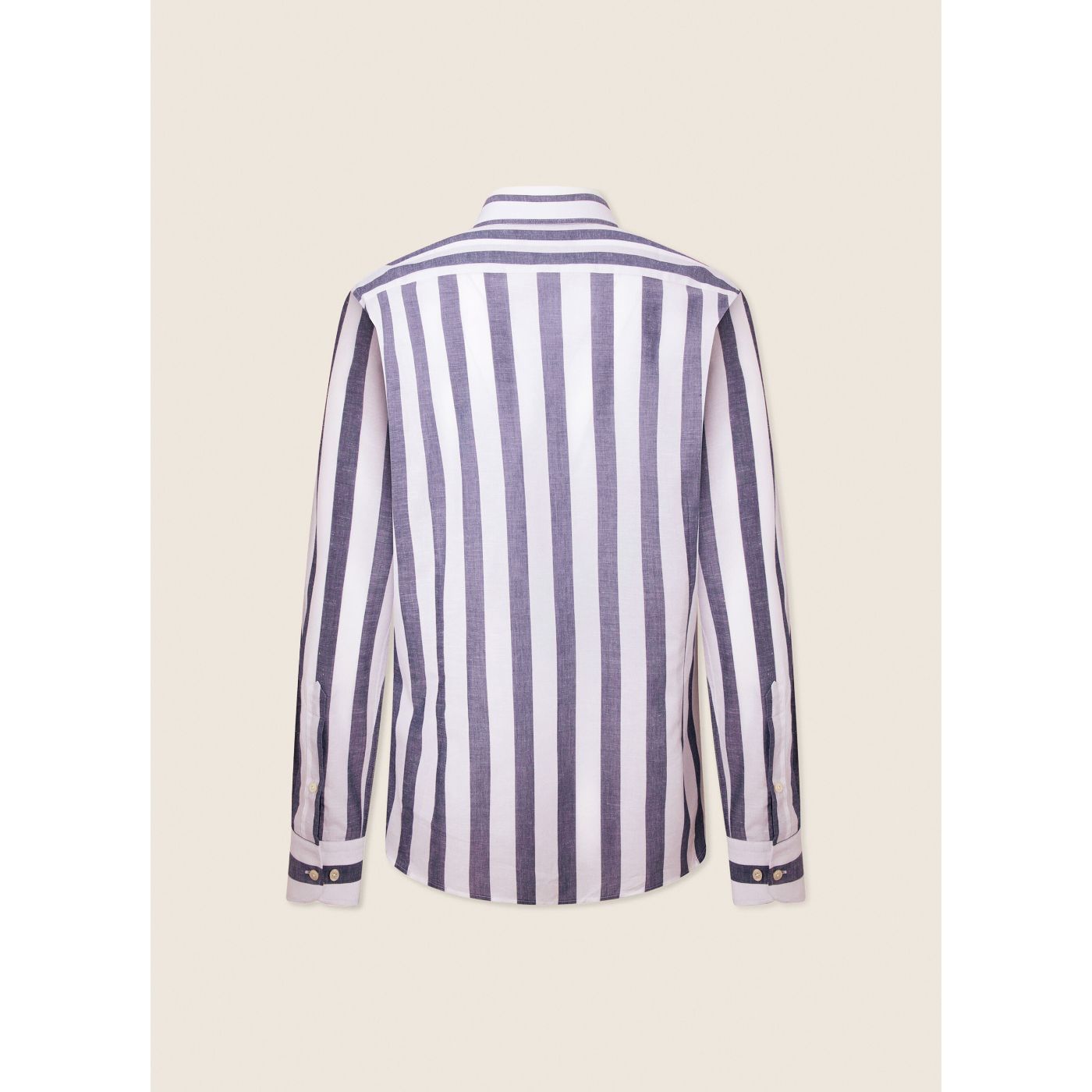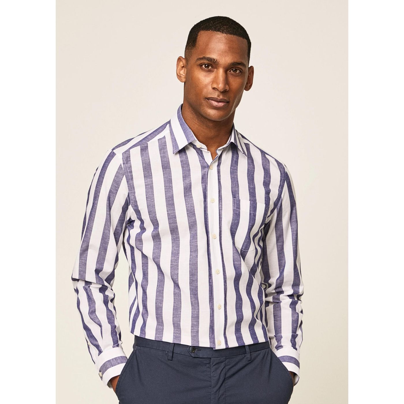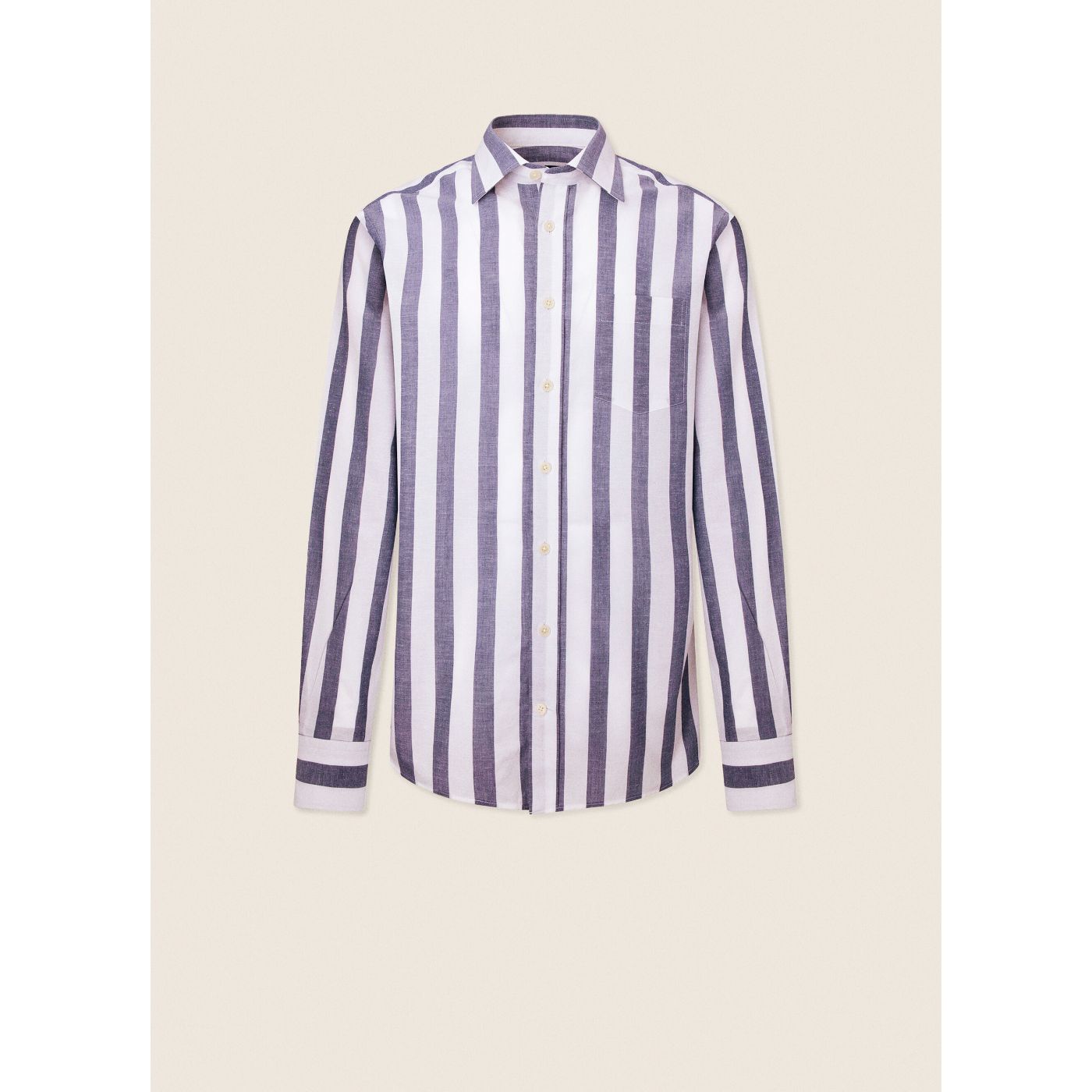 • Casual and timeless textured shirt with wide stripe print and cutaway collar. The pocket detail on the chest gives it a sophisticated look.