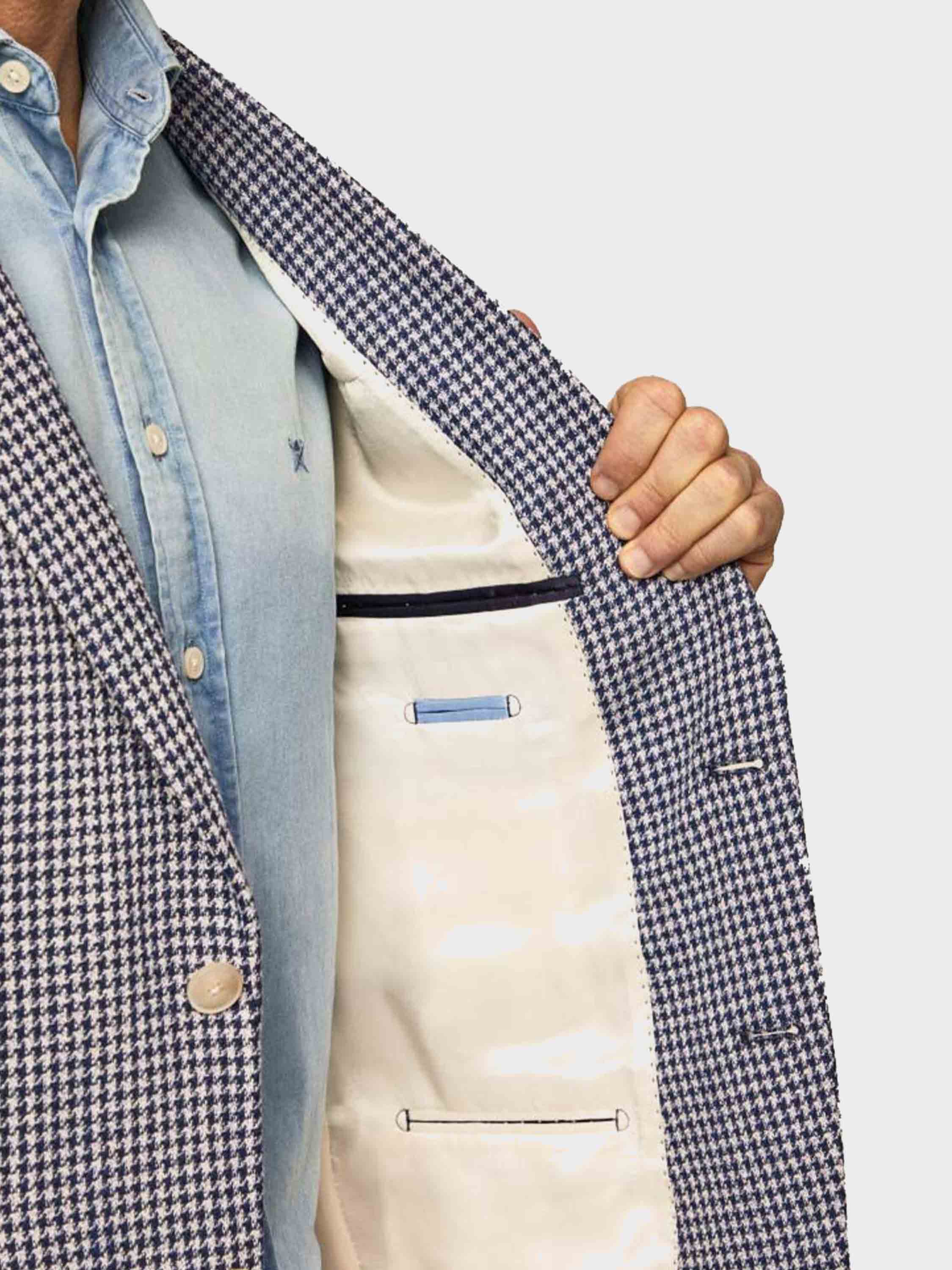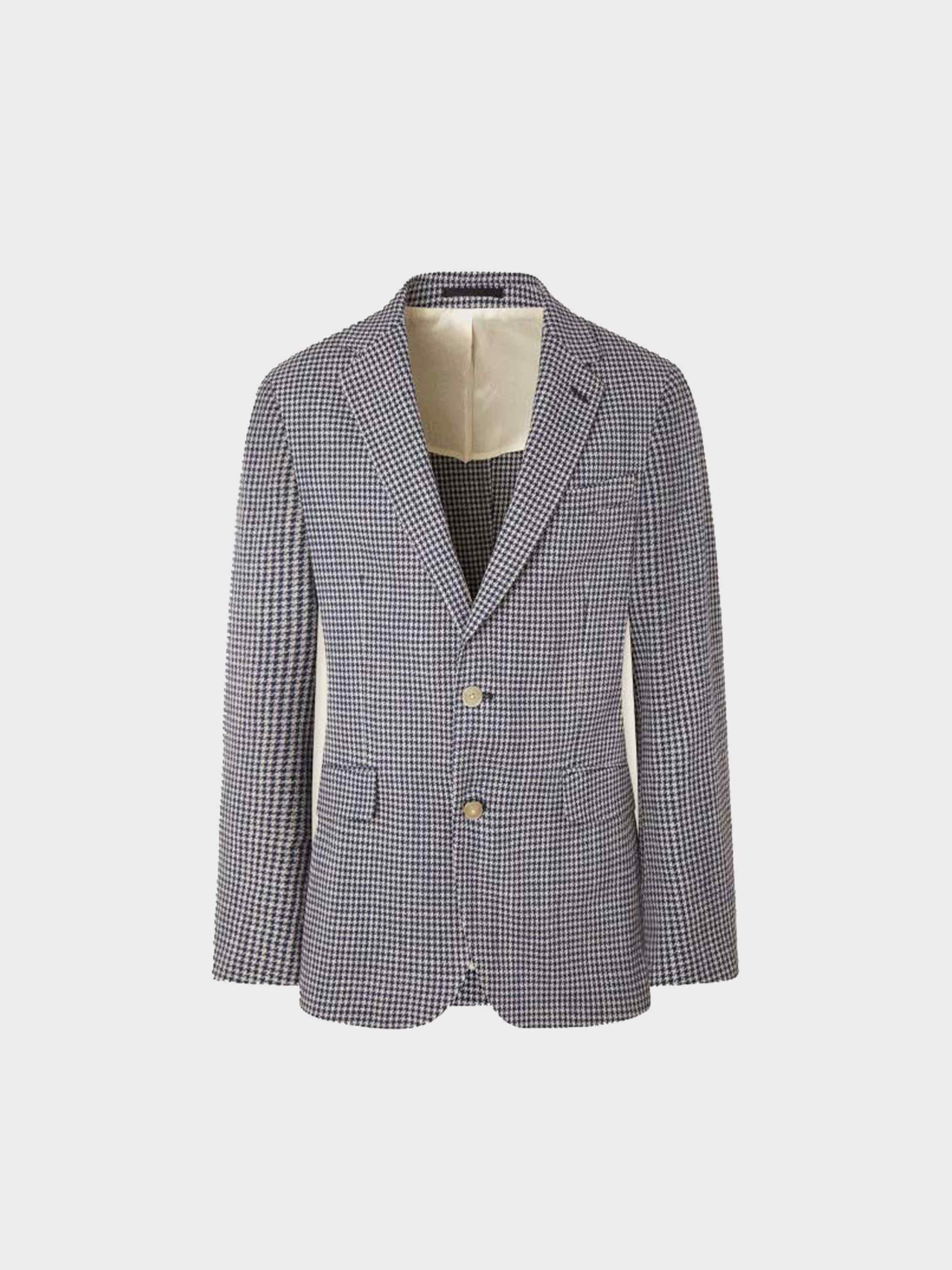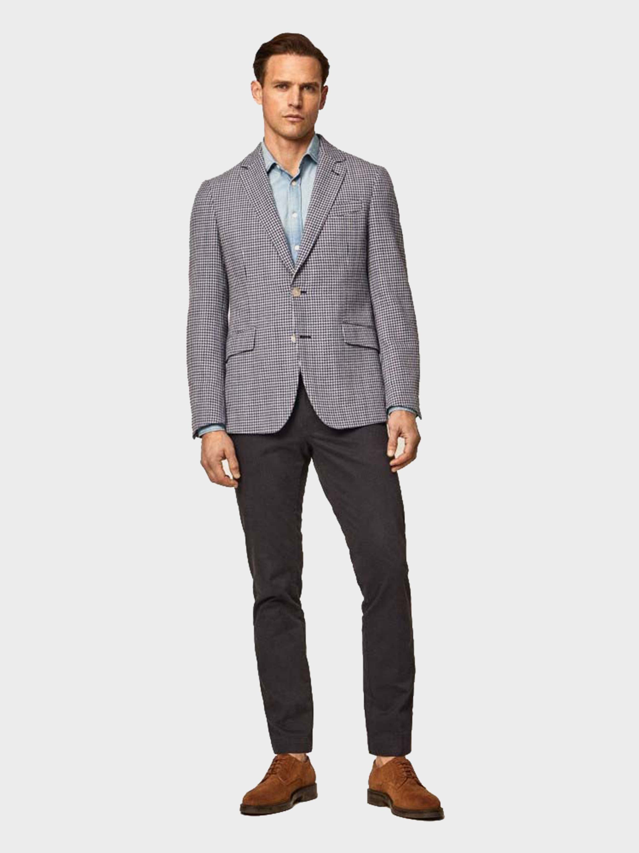 • The puppytooth fabric is a timeless classic that adds a lot of character to this nautical-style blazer. A more minimalist piece like our iconic chinos will be the perfect match for a casual look.