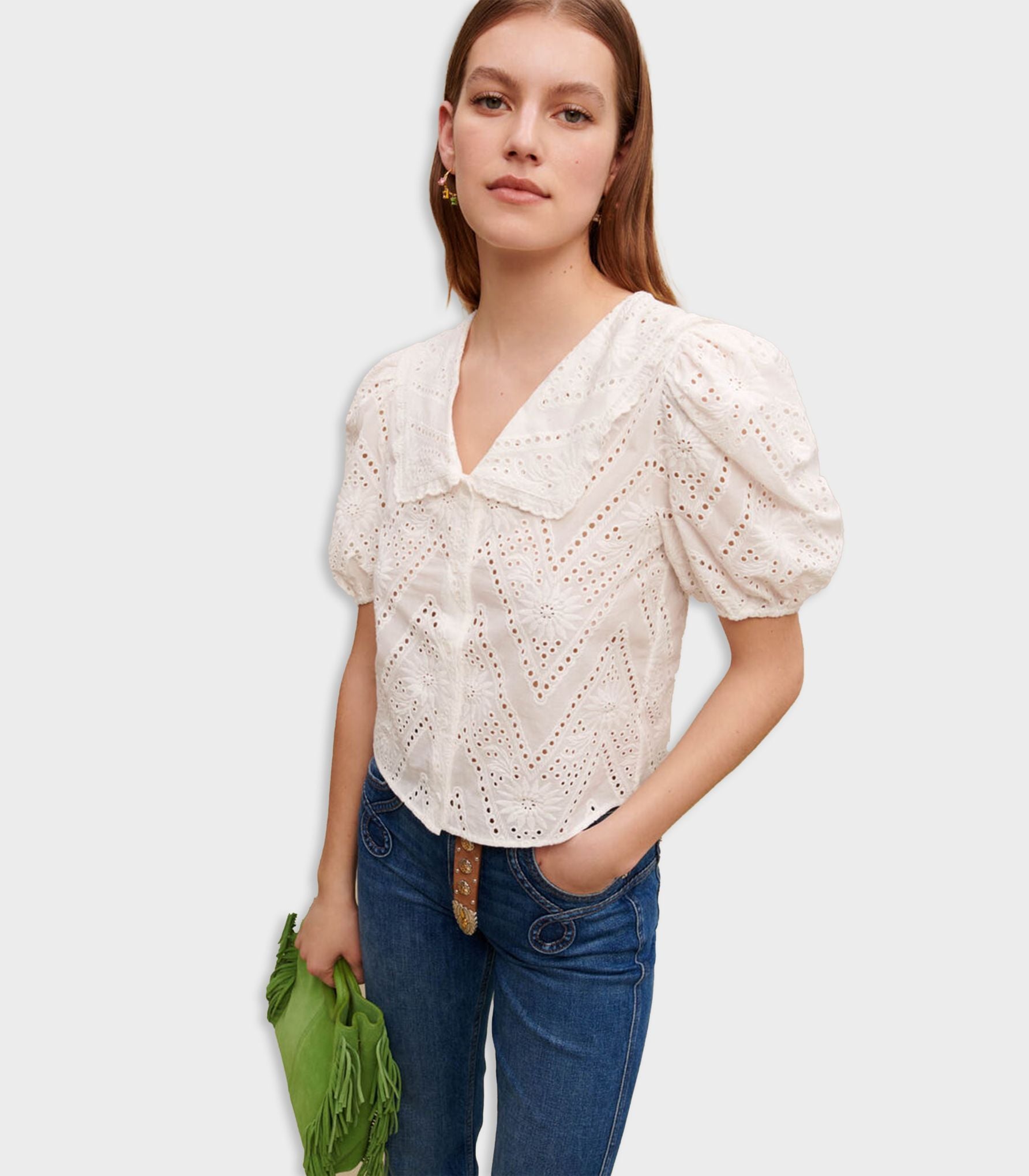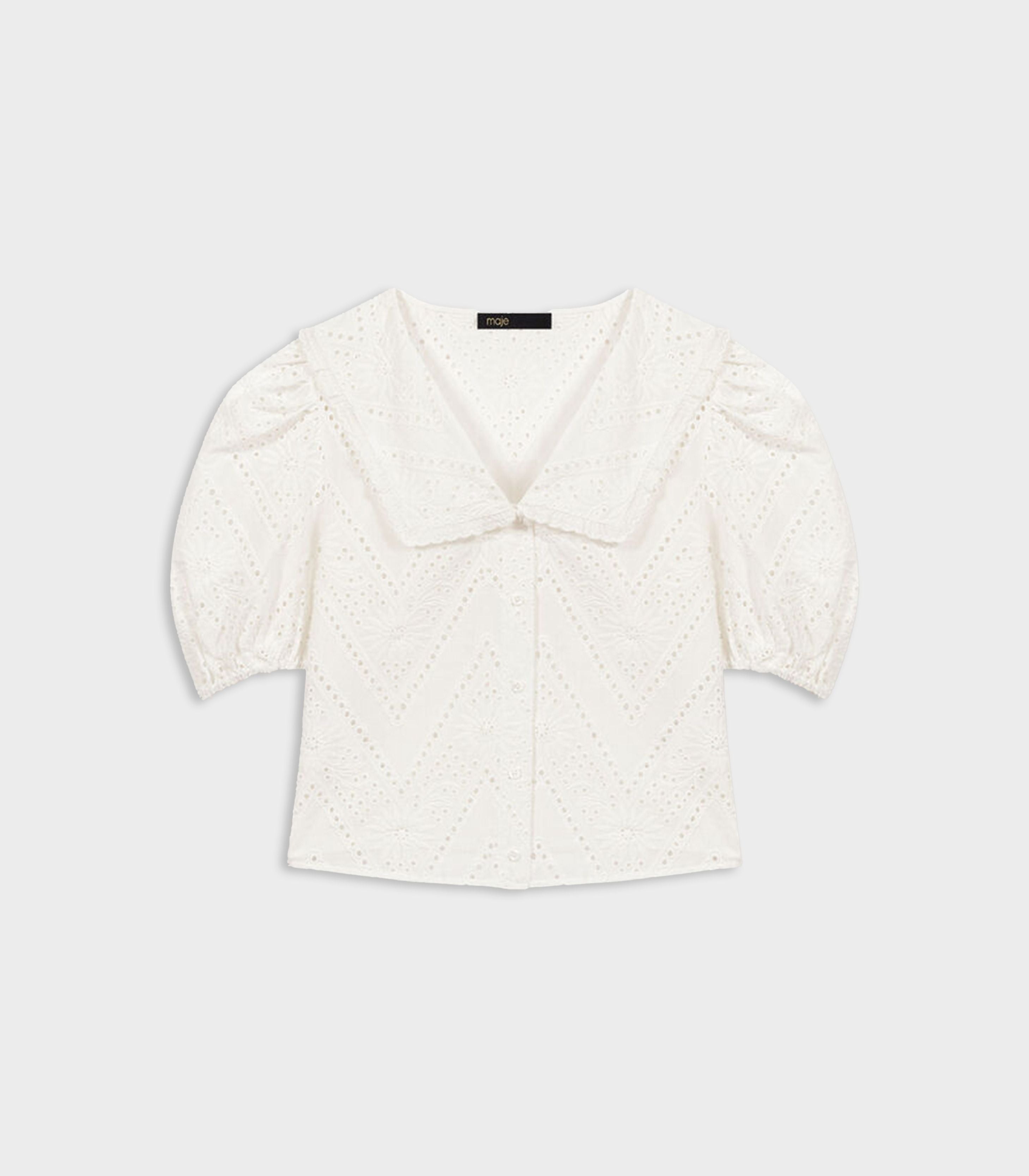 • Maje has given the embroidered shirt a modern makeover with this cropped version. Pair it with denim or a floaty skirt to play with contrasts. It features short sleeves with a tighter hem, a button placket, and a wide collar with ruffled trim.
