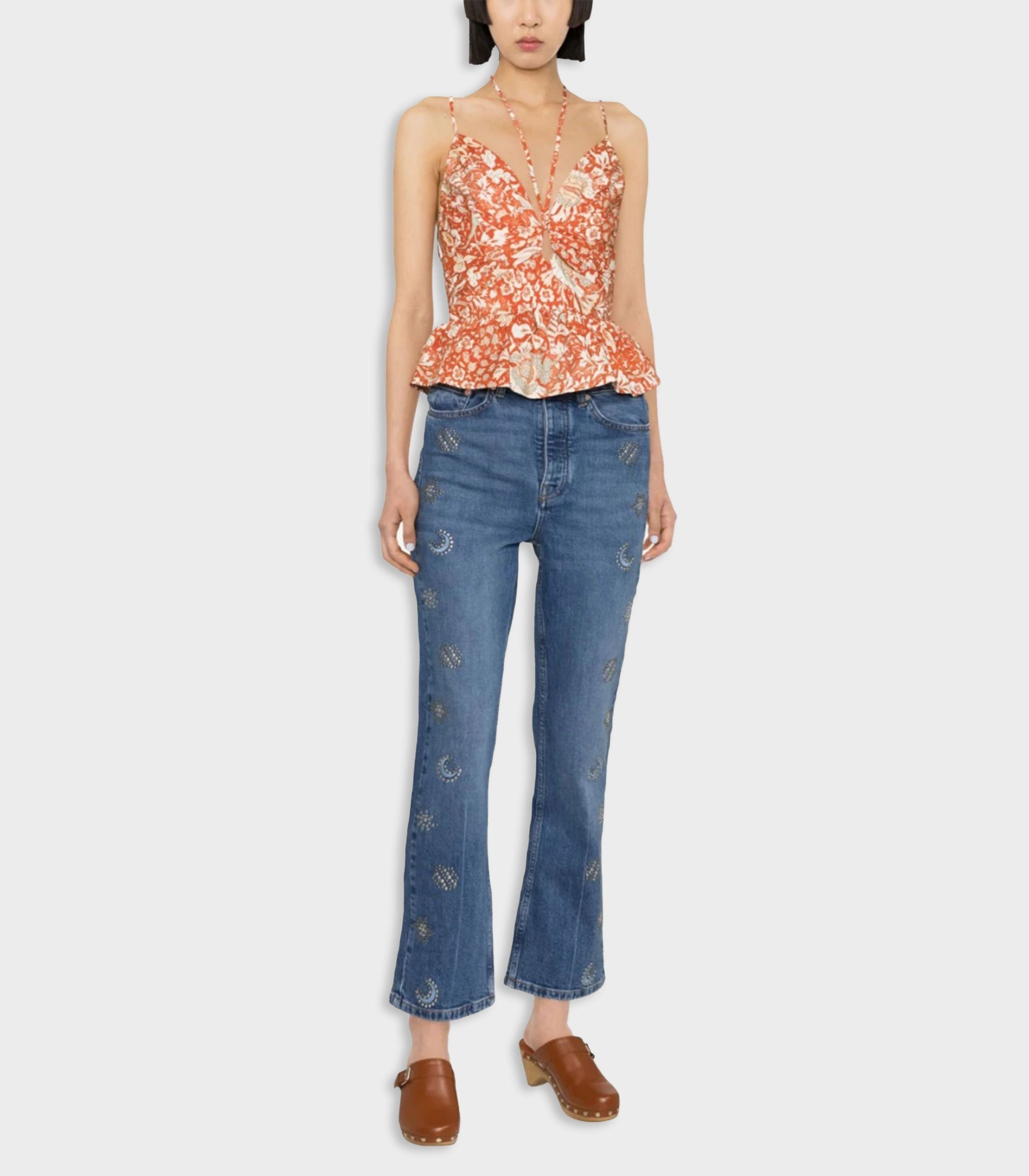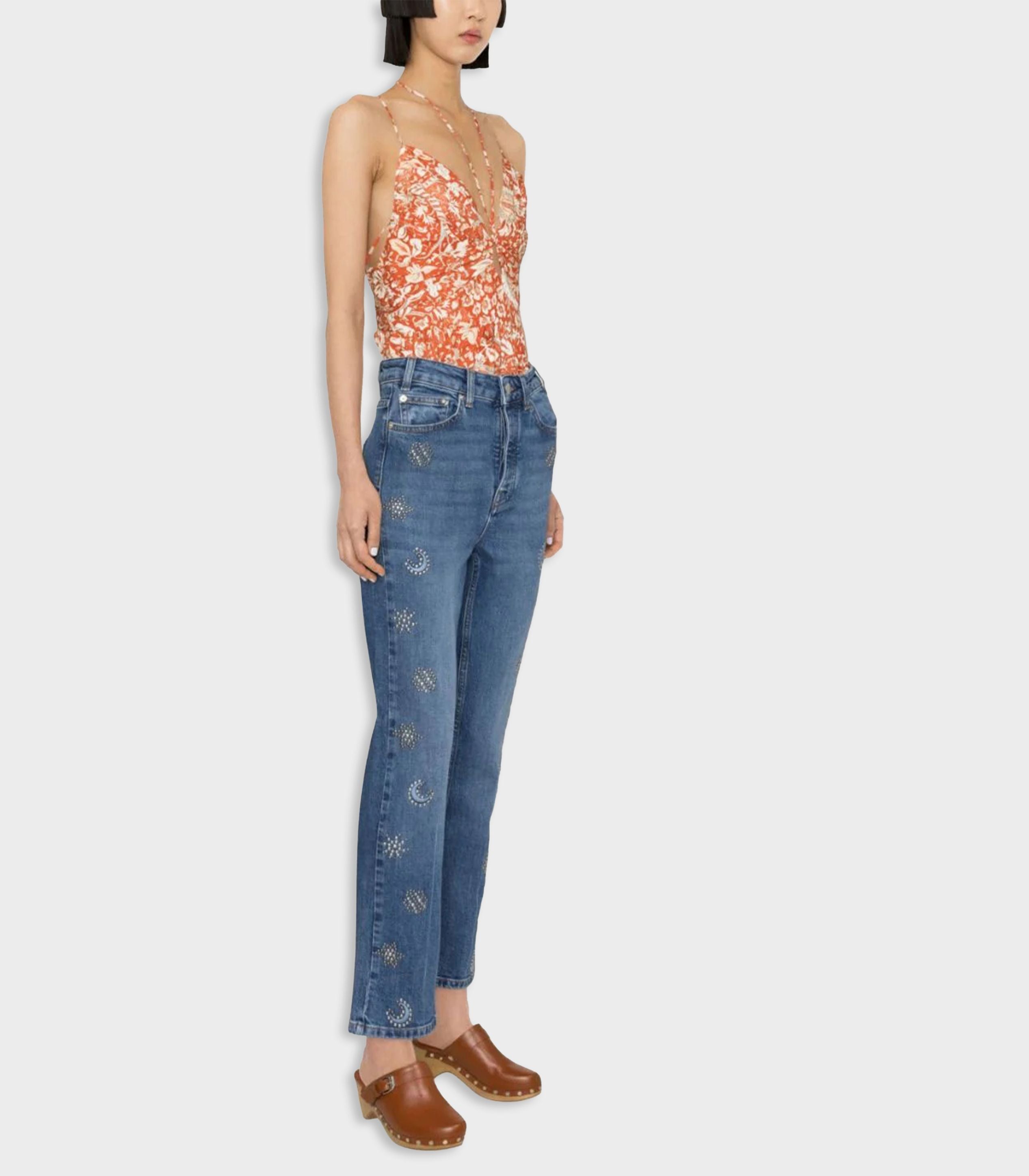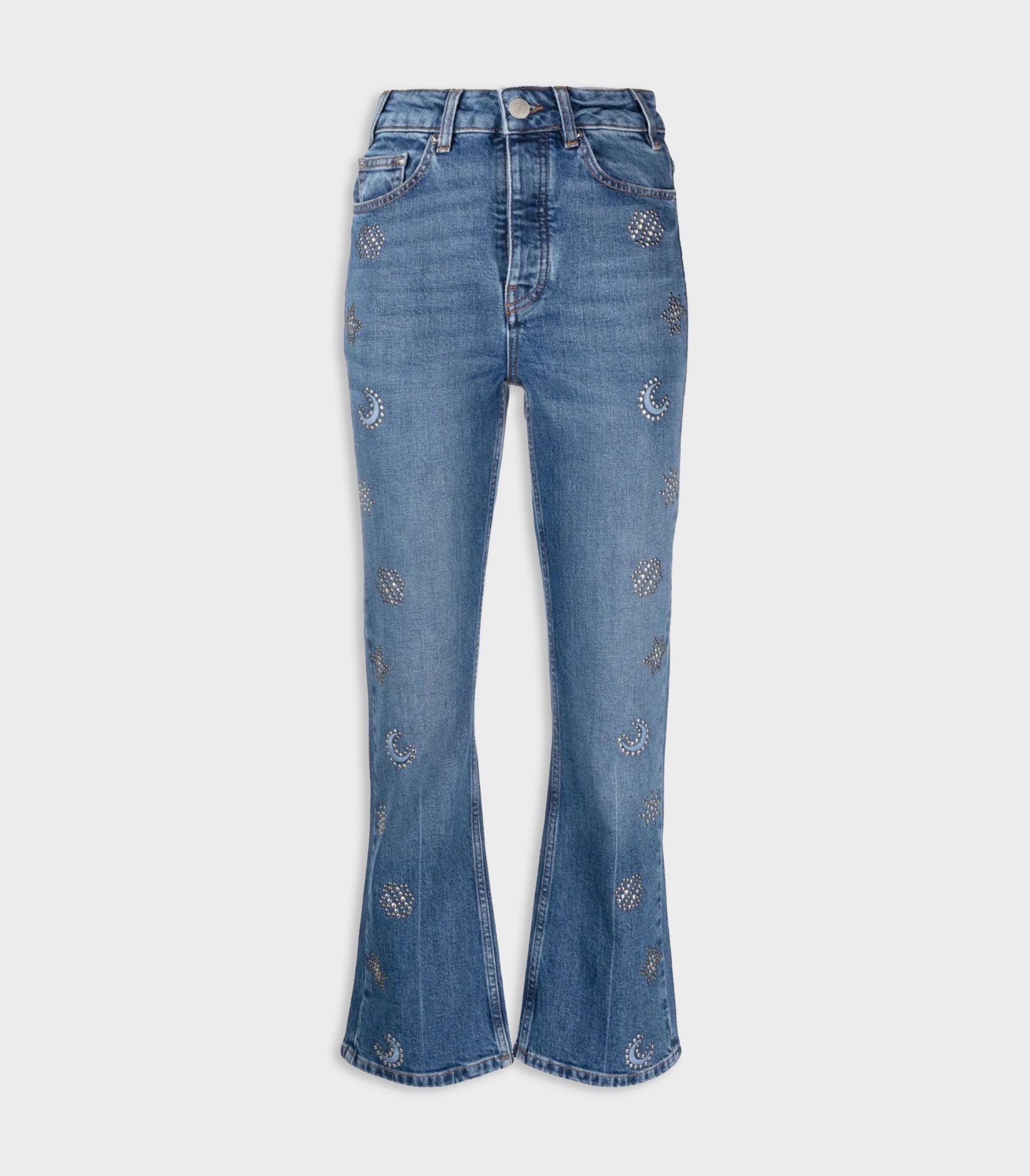 • Embellished with sparkling crystals forming moons and stars, these faded denim jeans will add some sparkle to both your casual and dressier looks. The slightly flared cut on the lower leg softens the silhouette. They have a button fastening.