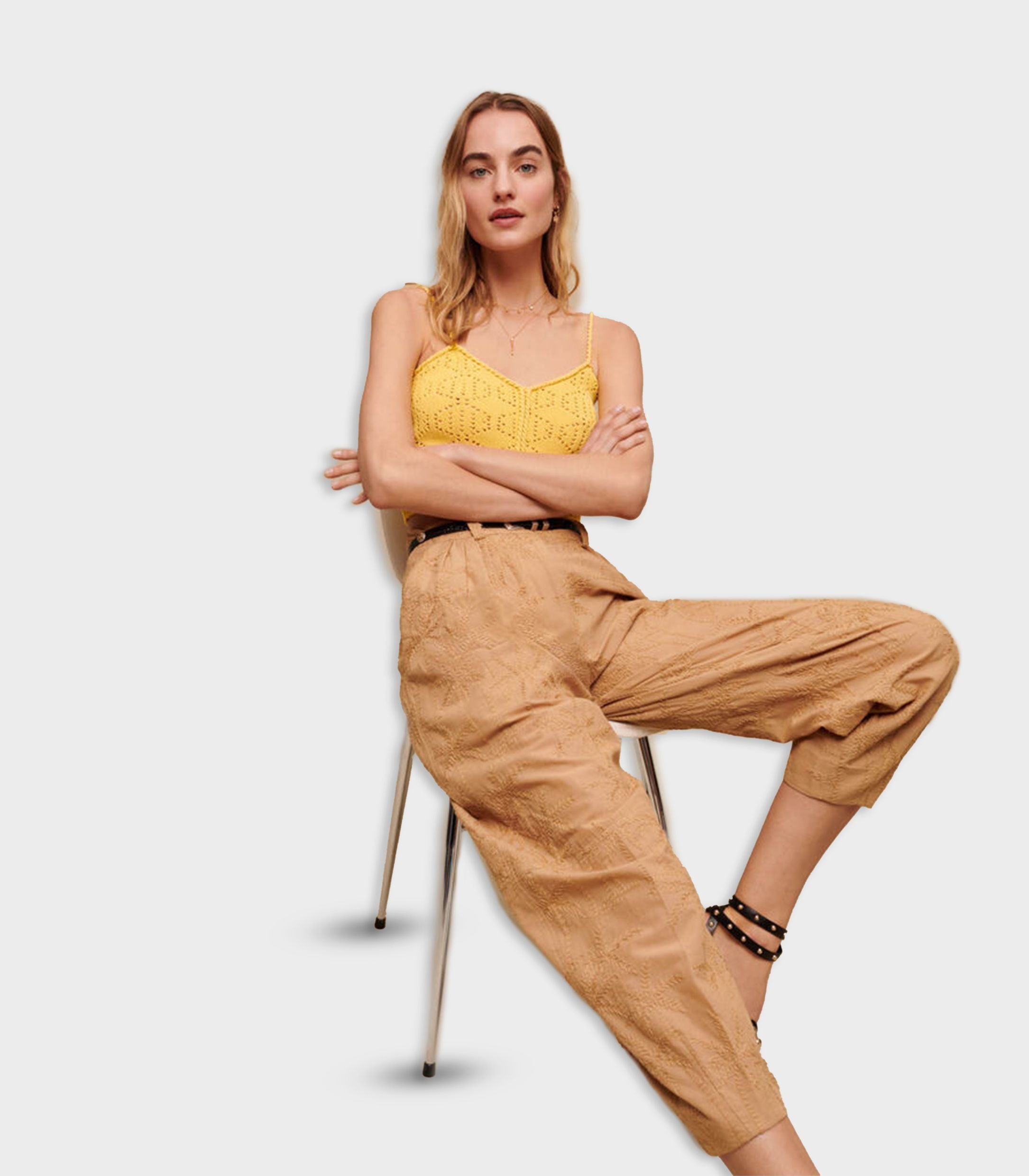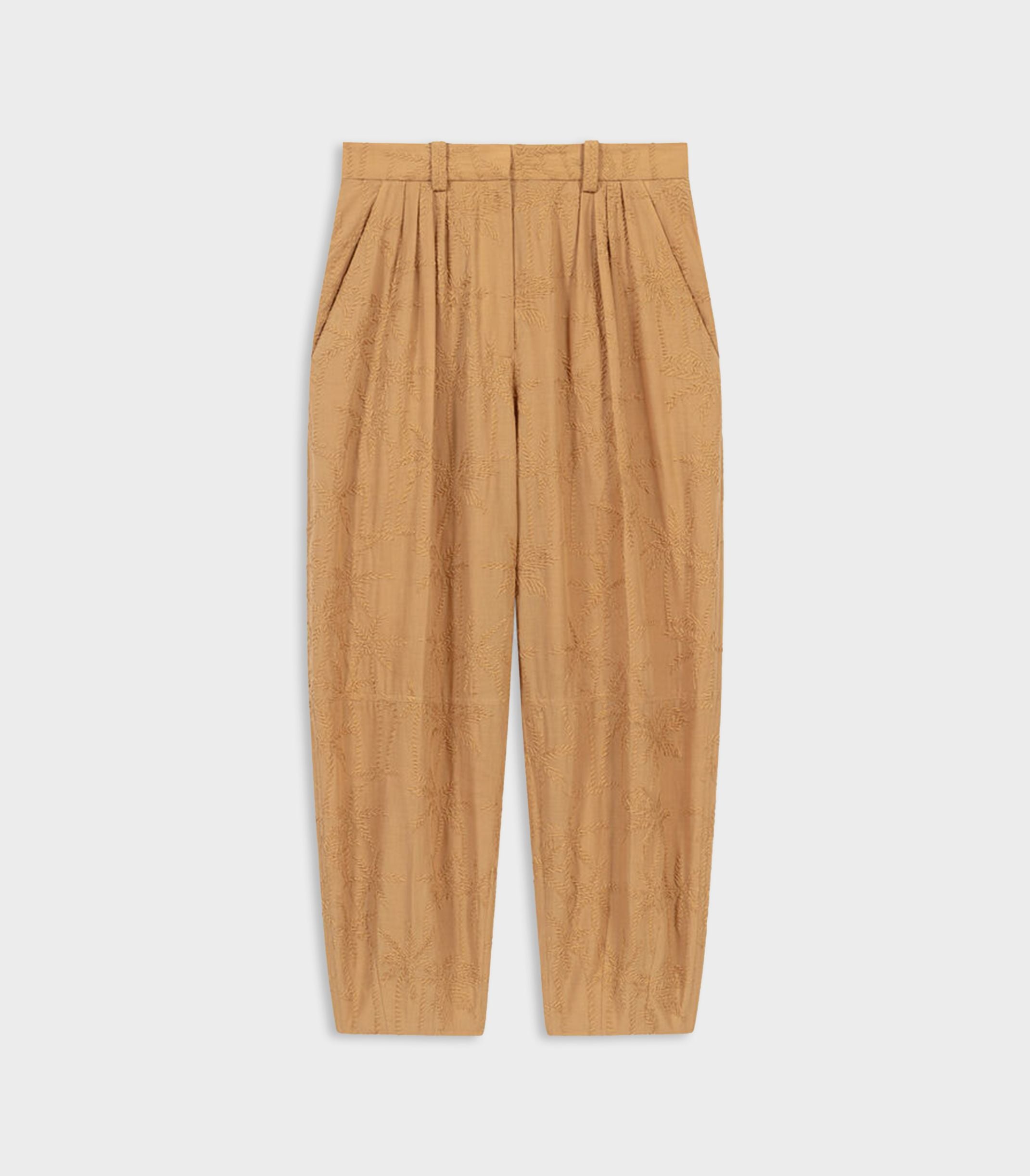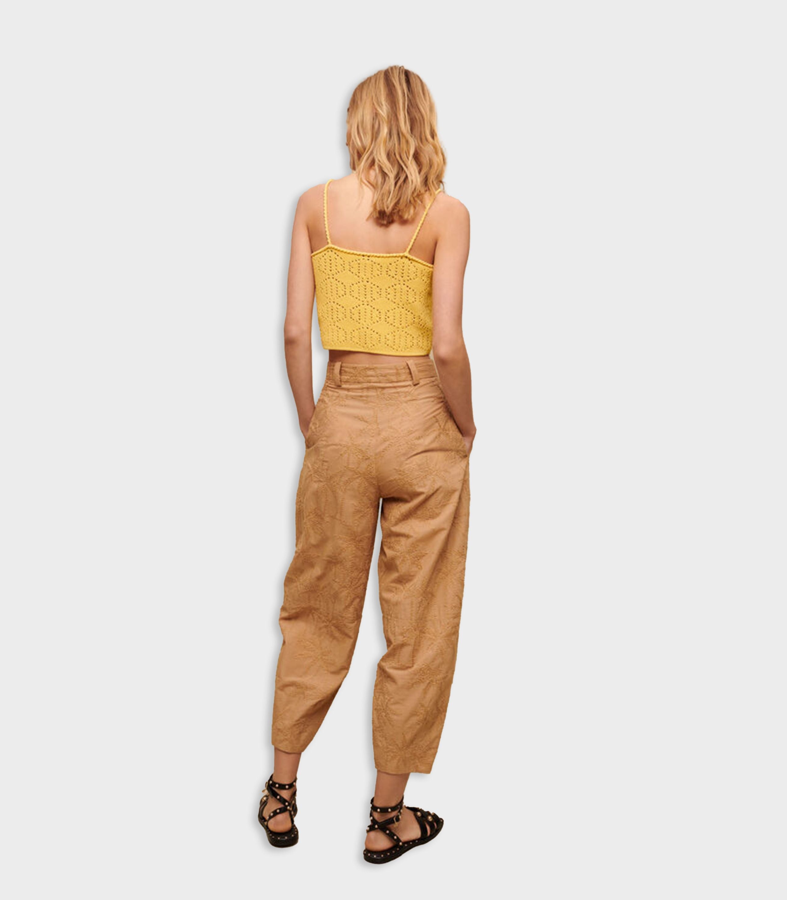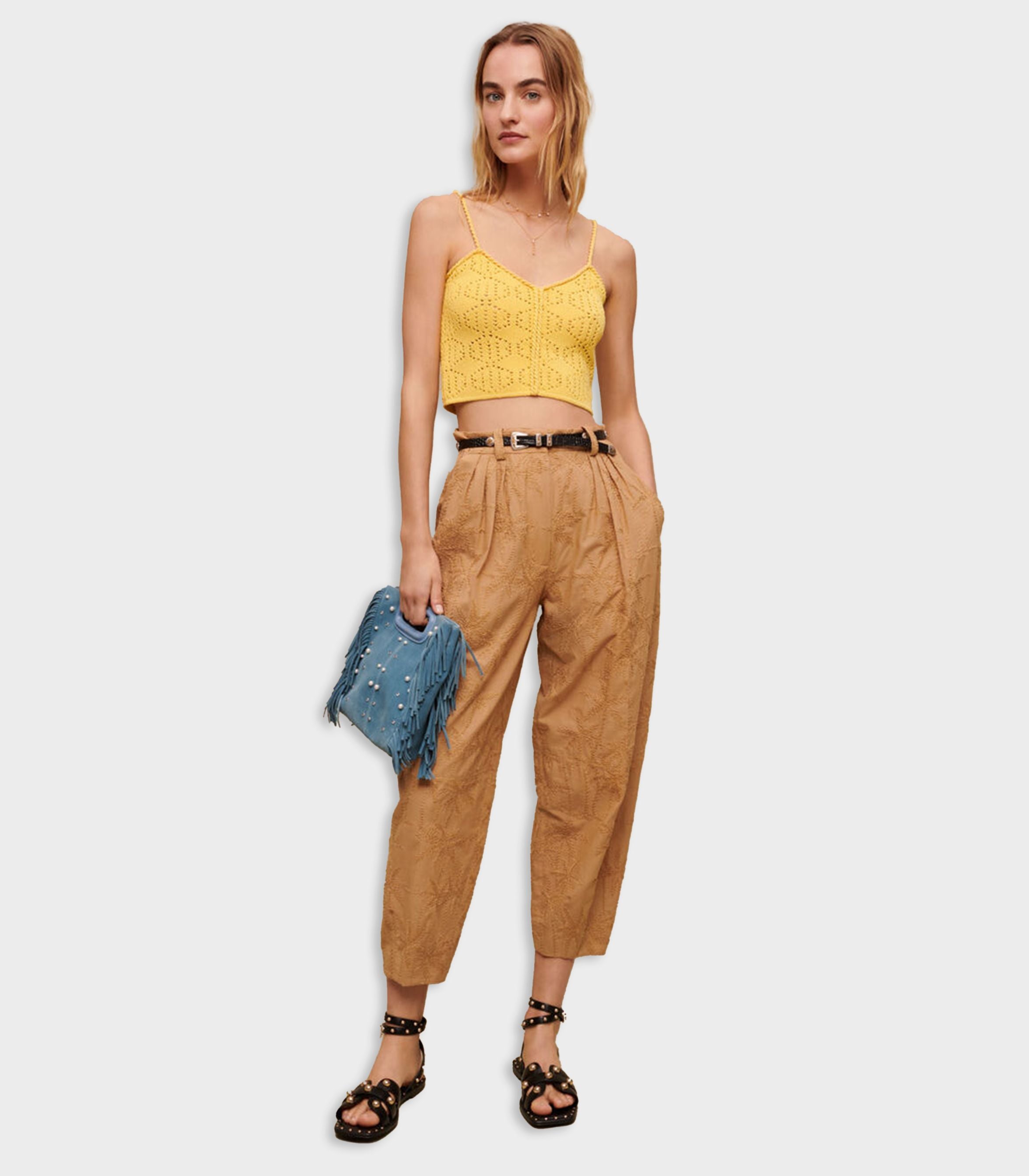 • The new Maje collection is packed with lightweight summer looks that play with volumes. These cotton trousers with darts adopt the season’s must-have carrot cut. Pair them with a crop top and belt with a buckle to stylishly define the waist.