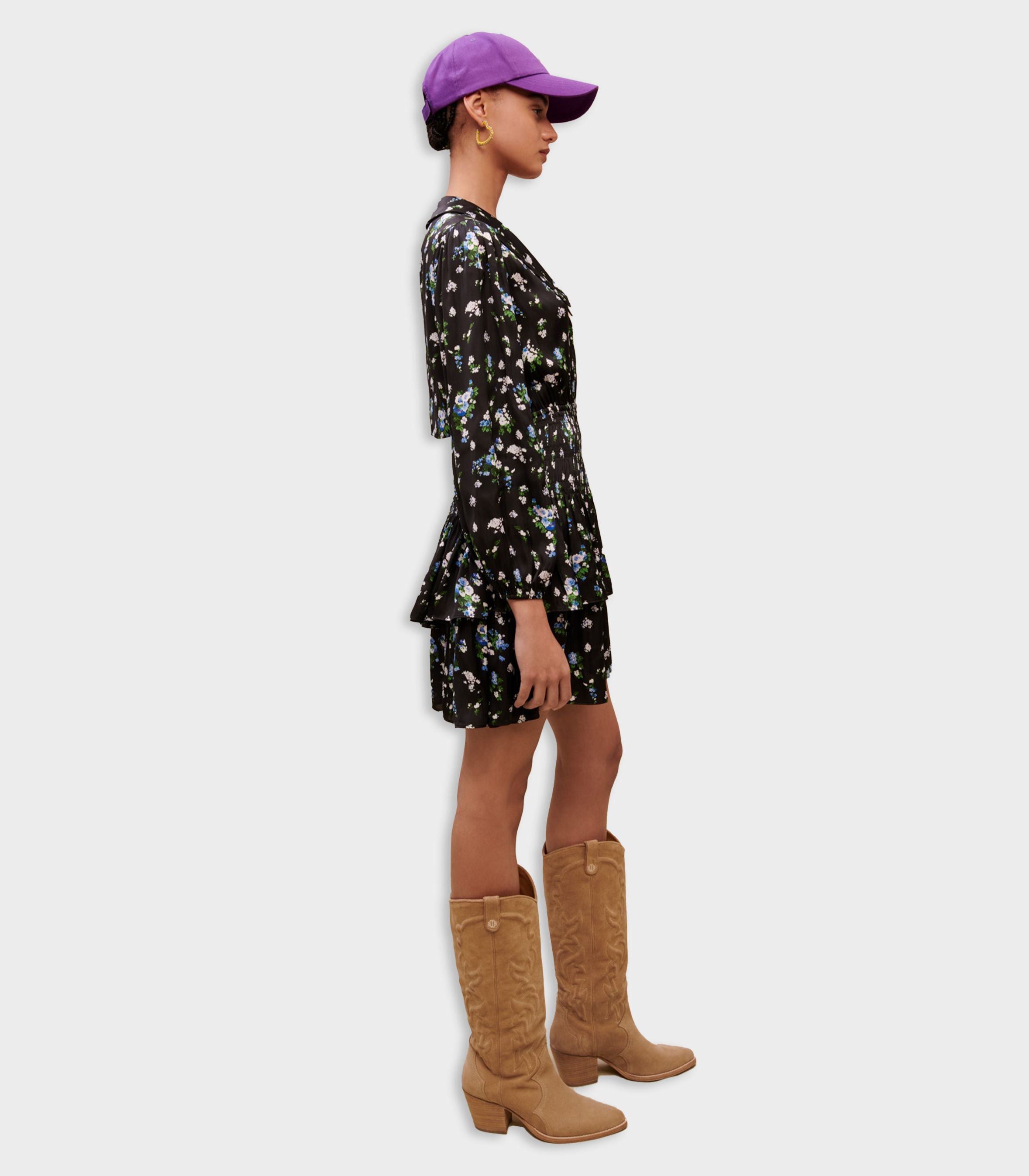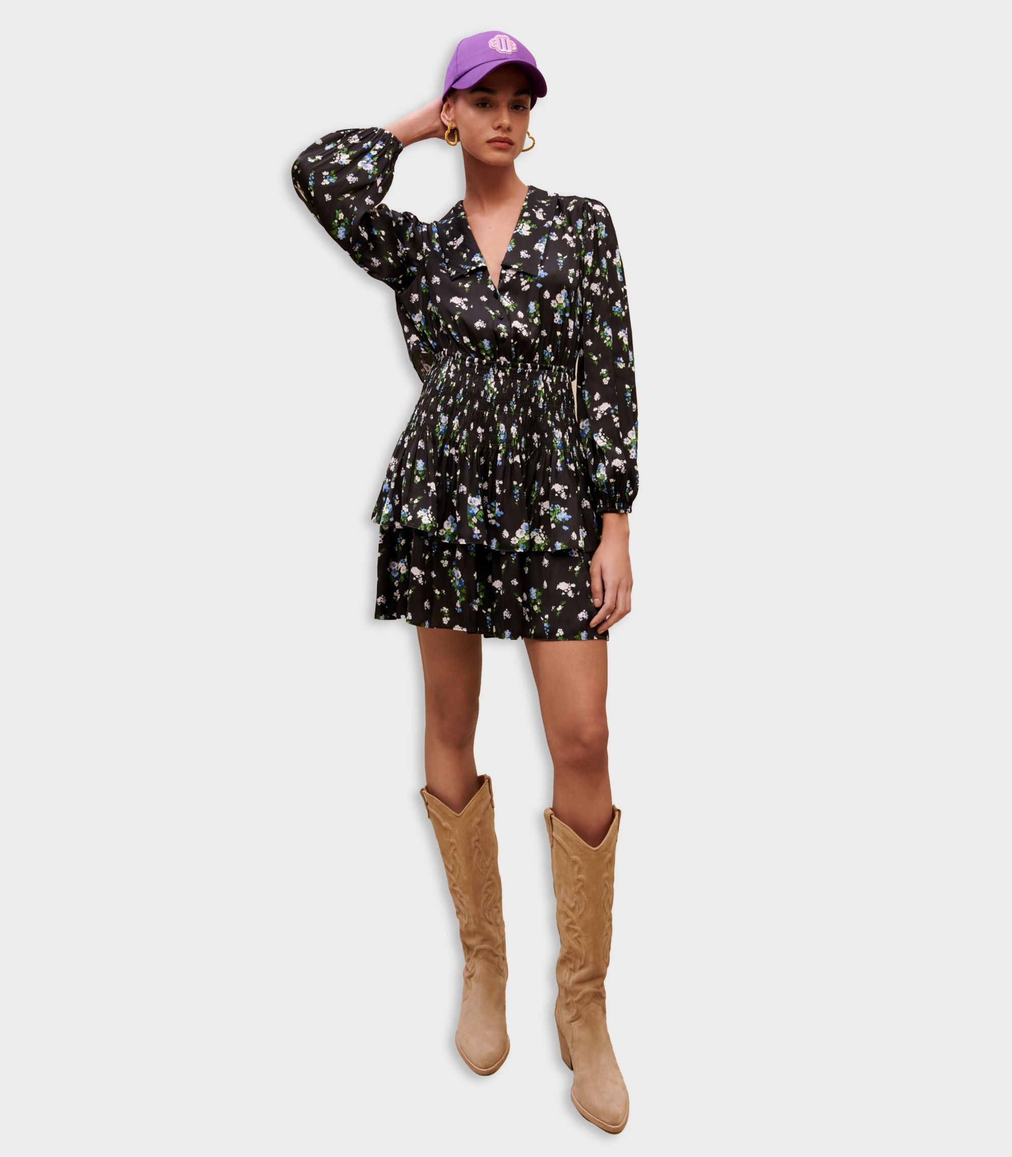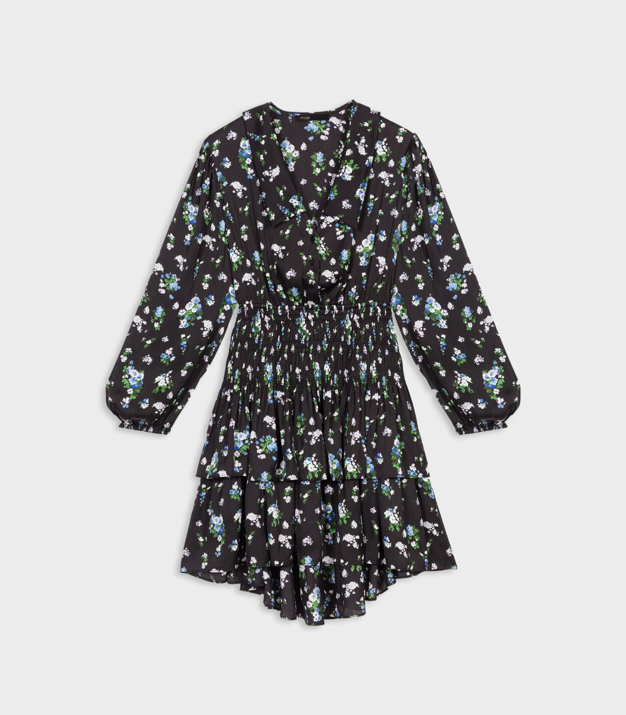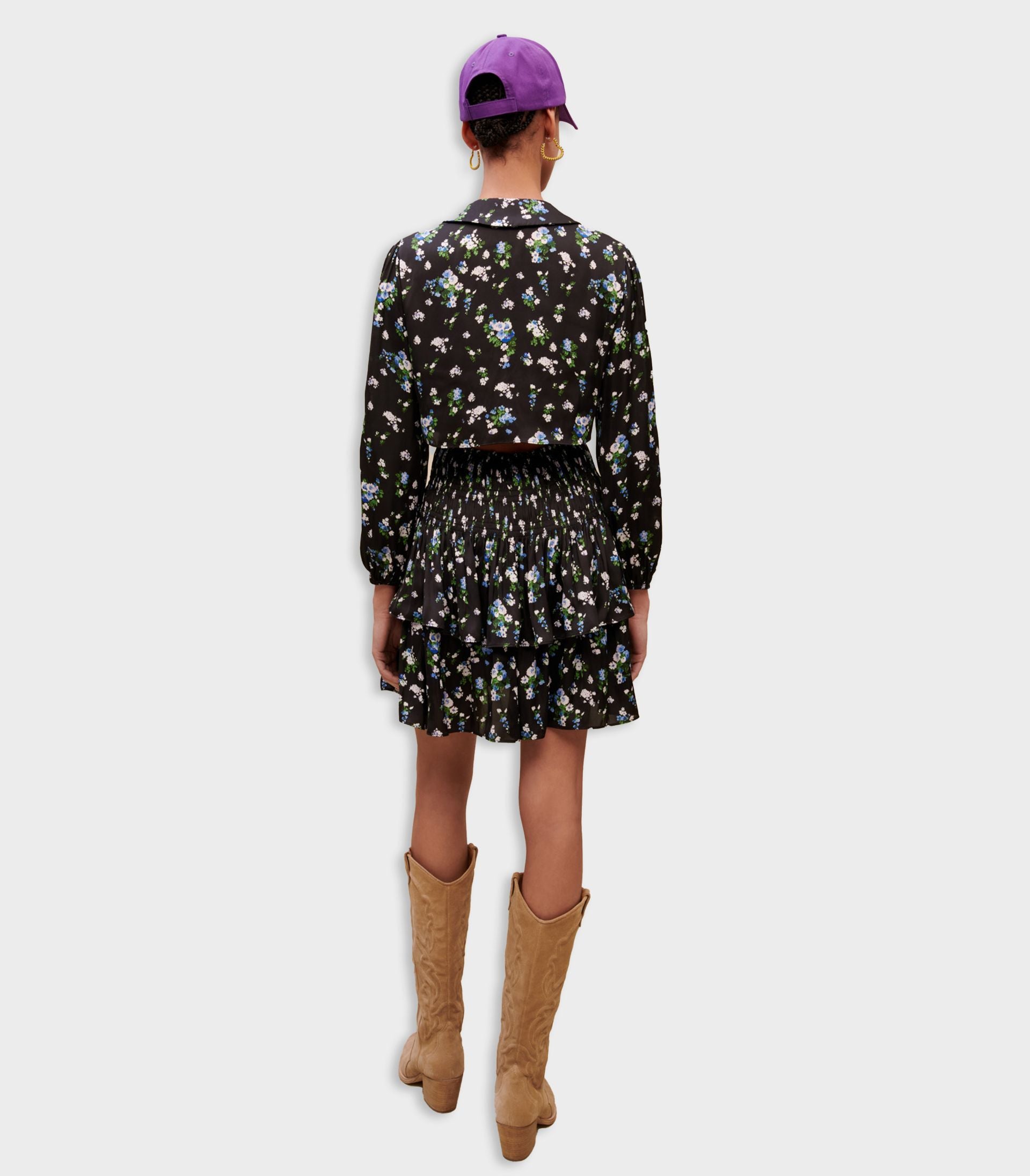 This piece extremely feminine: smocks at the waist, ruffles on the sleeves and skirt, V neckline and shirt collar. Perfect for a day at the office.