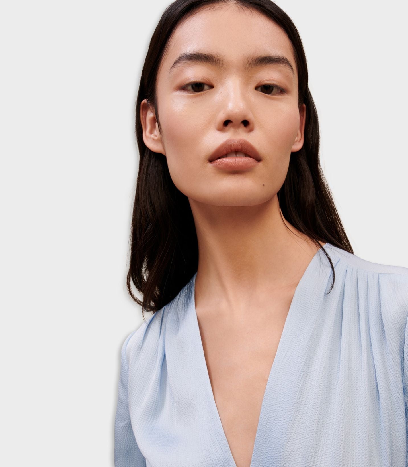 • This dress updates the little dress we love in a soft pastel blue colour. It is designed to show off your figure: plunging v neckline, 3/4-length sleeves and elasticated waistband. Feminine and comfortable! It is shorter at the front and slightly longer at the back to show off its asymmetric cut. Perfect for a day at the office.