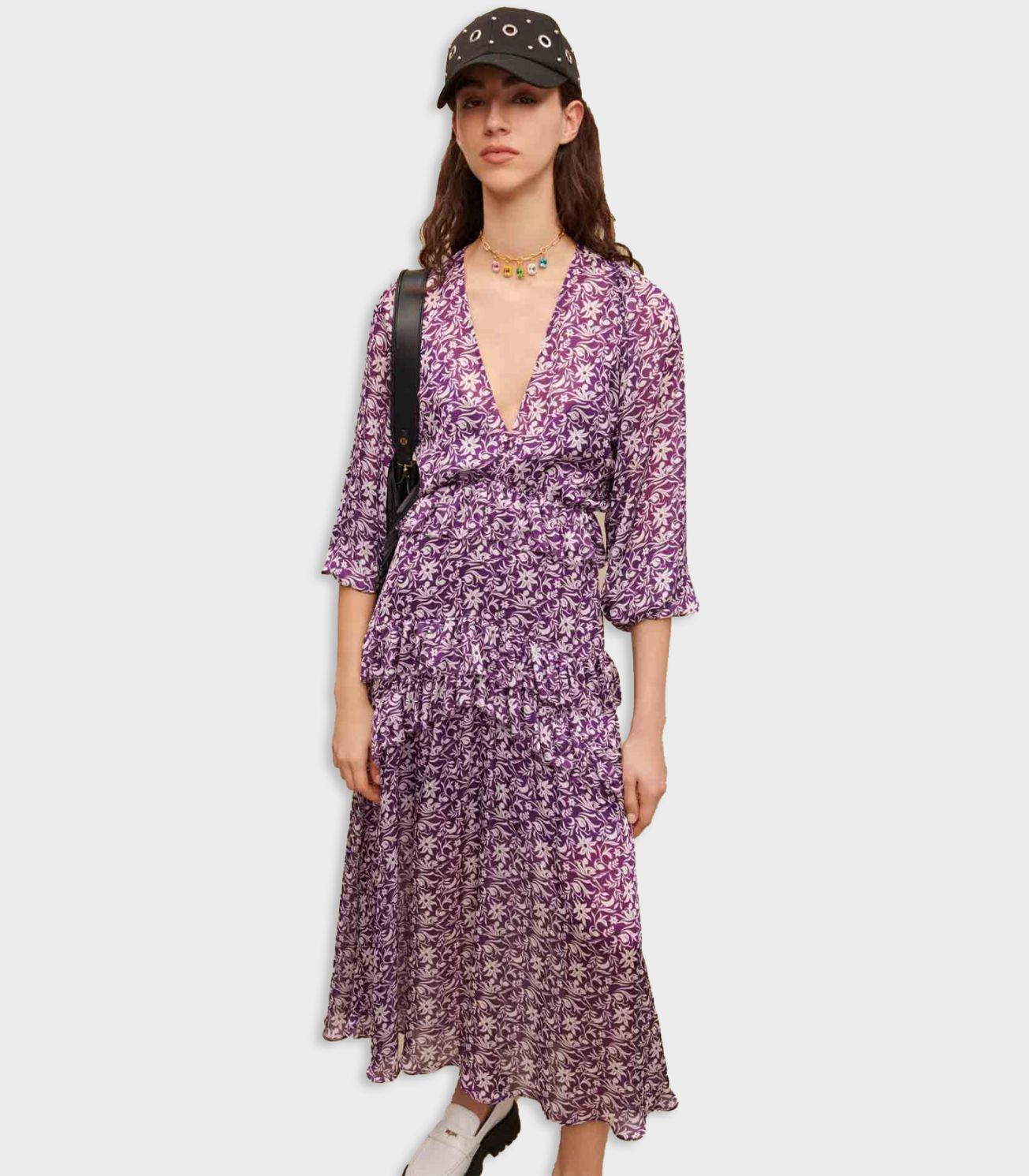 • Adopt this slinky, flowing dress for a lightweight, boho look. It features a V neckline and flared 3/4-length sleeves and is decorated with a floral print and ruffles at the hips.