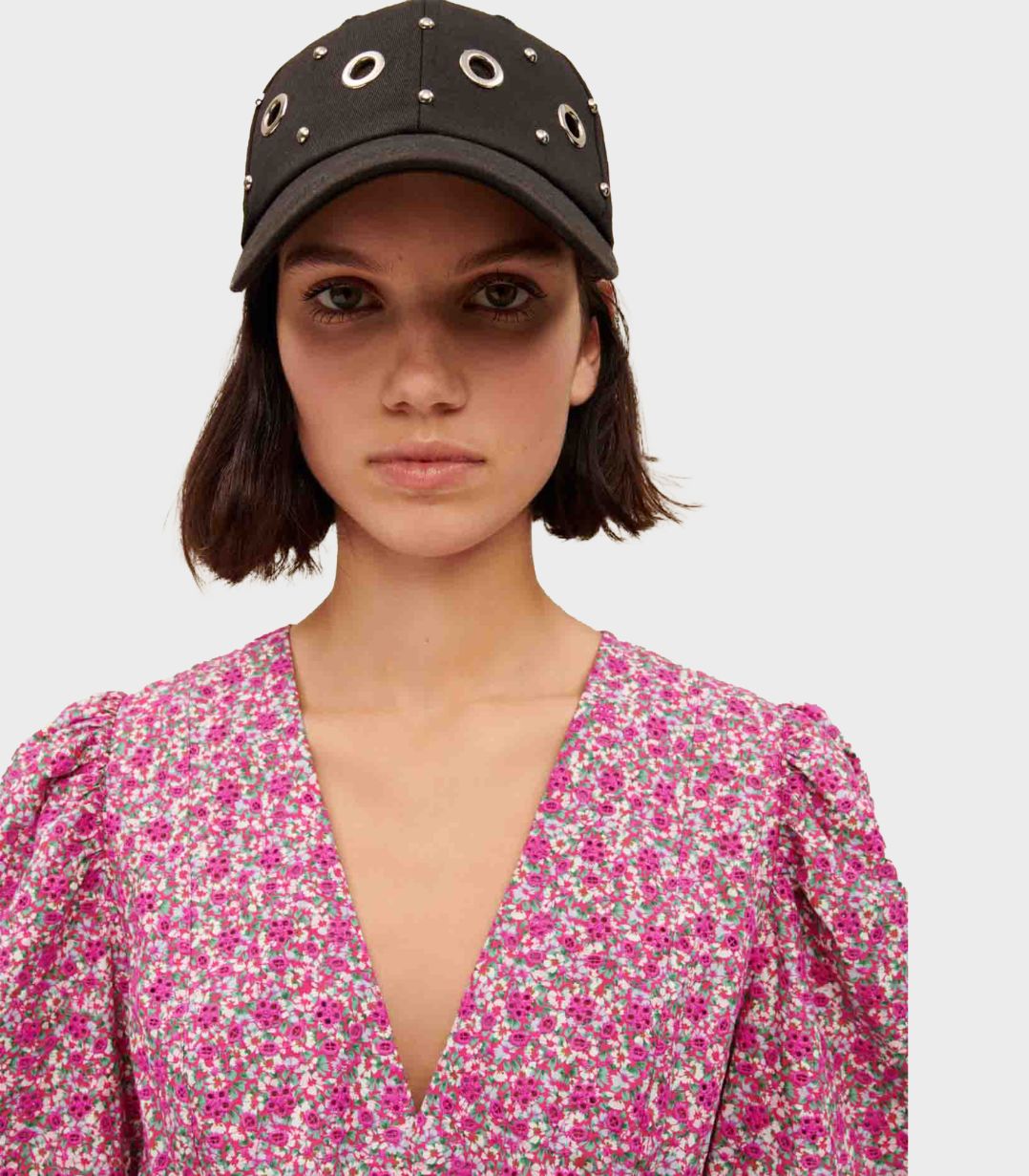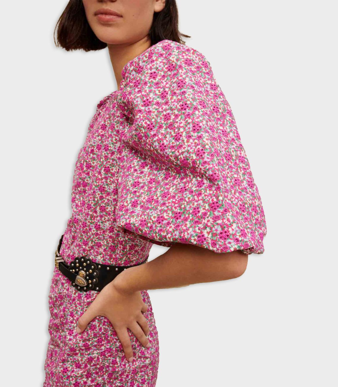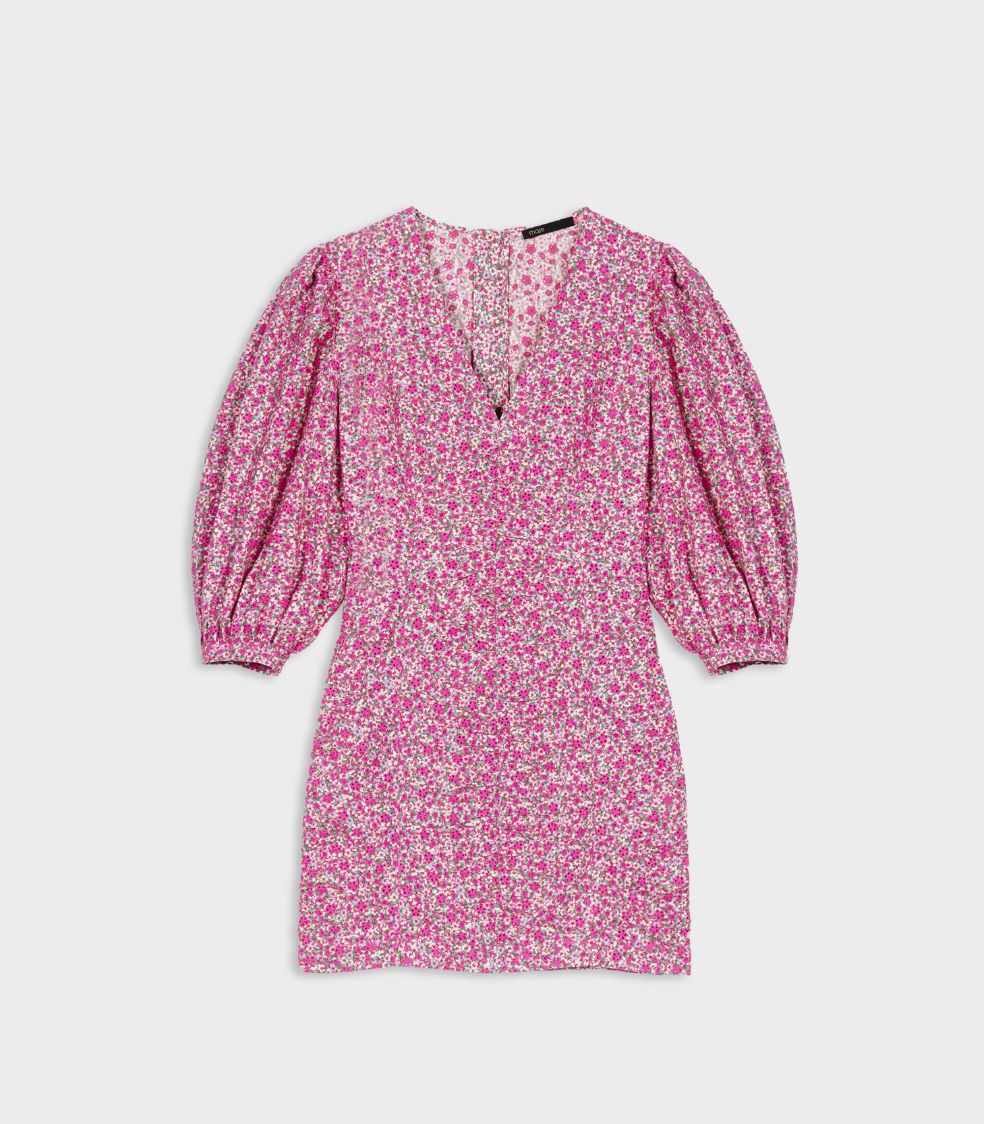 • The Maje studio has designed a fresh and sparkling floral print for the new season. This short dress with its feminine lines has a V neckline and voluminous, delicately gathered three-quarter length sleeves.