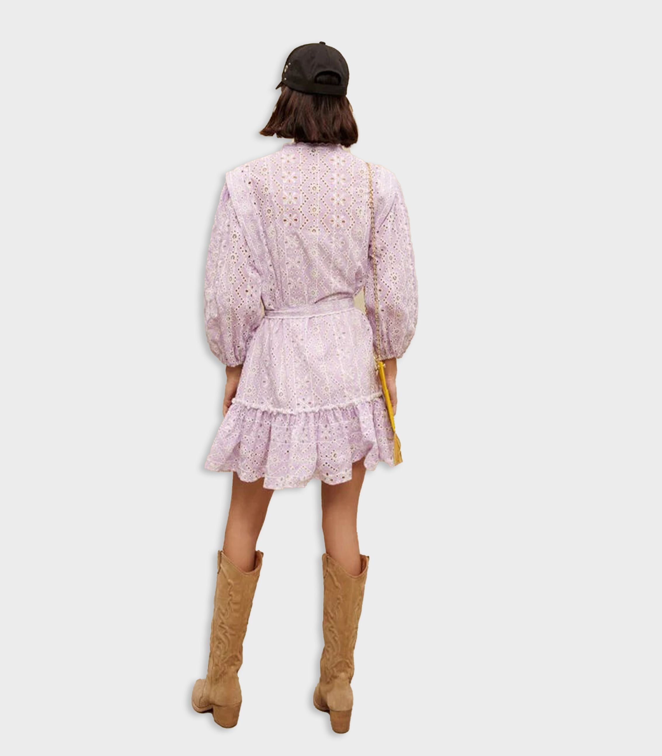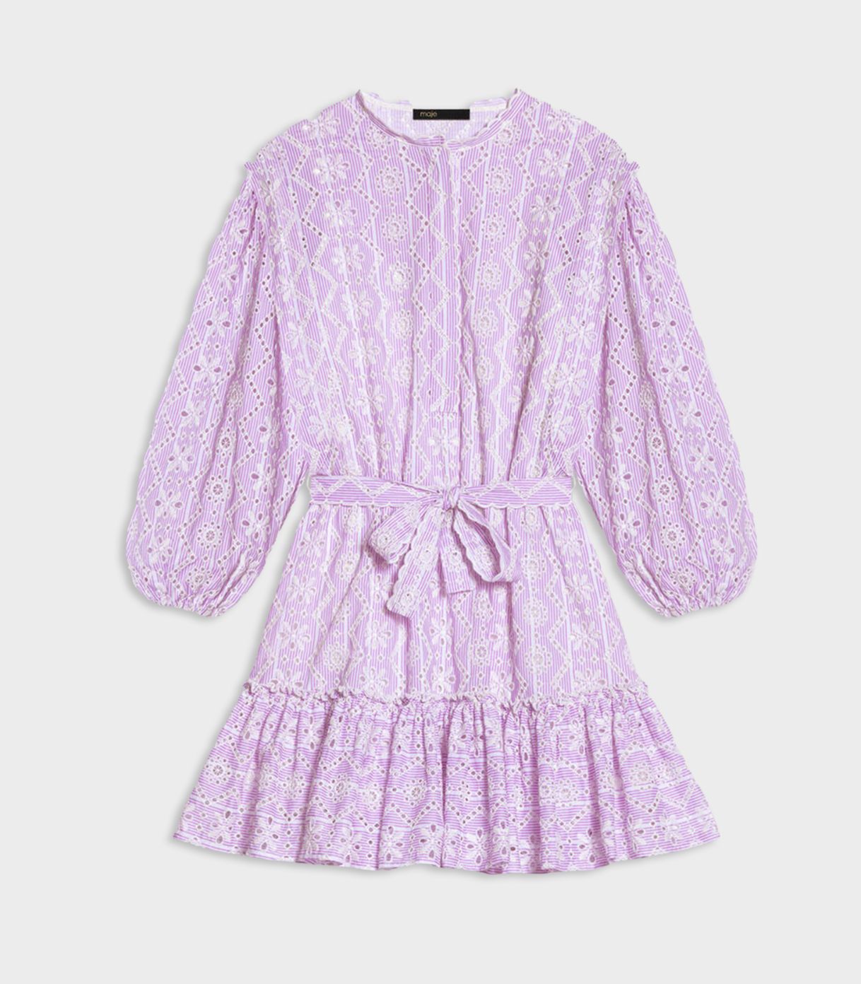 • Summer at Maje will be romantic in this pastel dress embellished with openwork contrasting floral embroidery. Featuring a V neckline, long sleeves and a ruffled hem, this mini dress promises delicate summer looks. Pair it with boots for a little contrast.