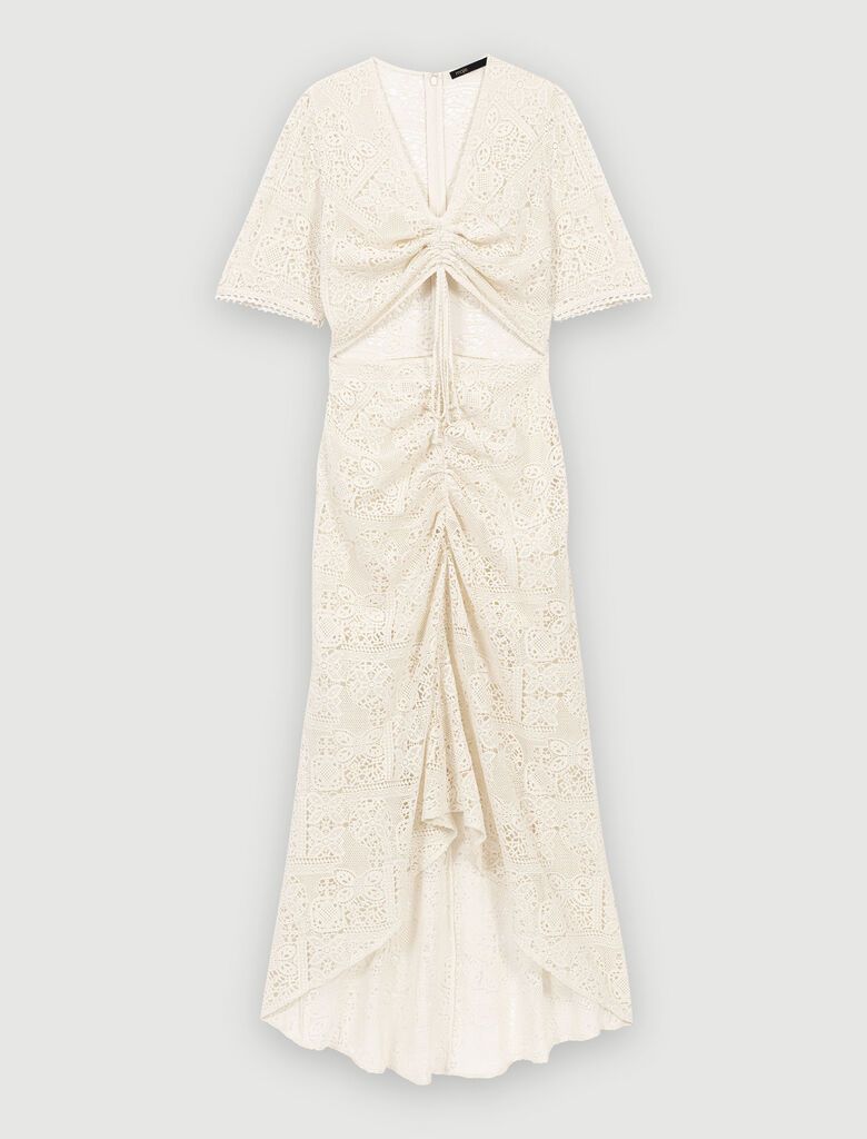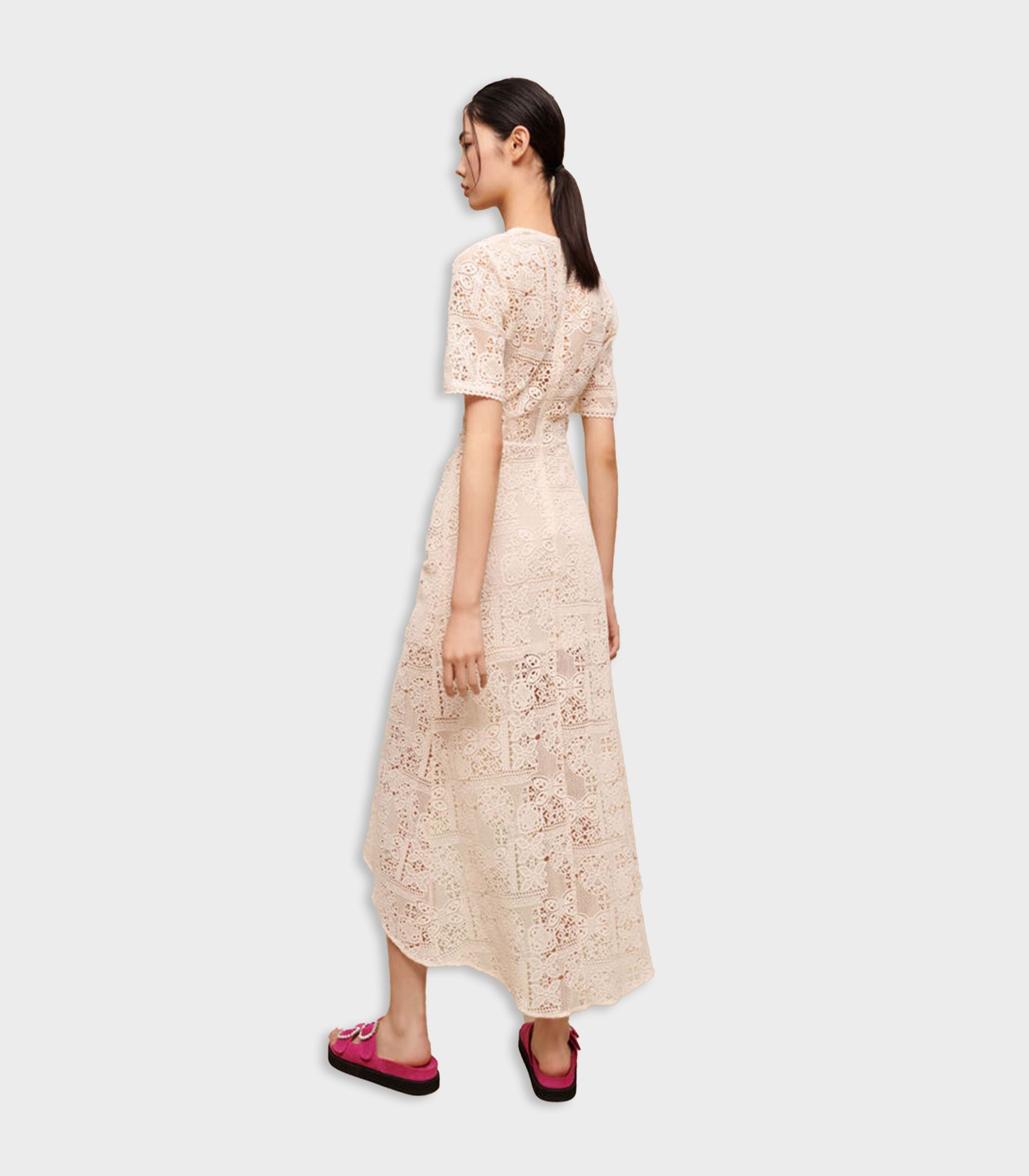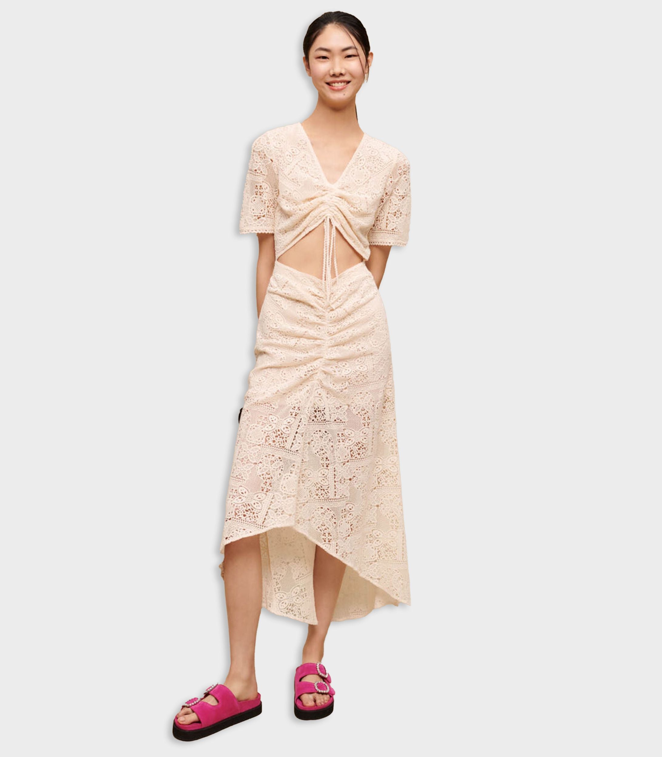 • This mid-length crochet dress features transparent motifs. It gives the illusion of being a top and skirt, for the perfect trompe l’oeil effect.