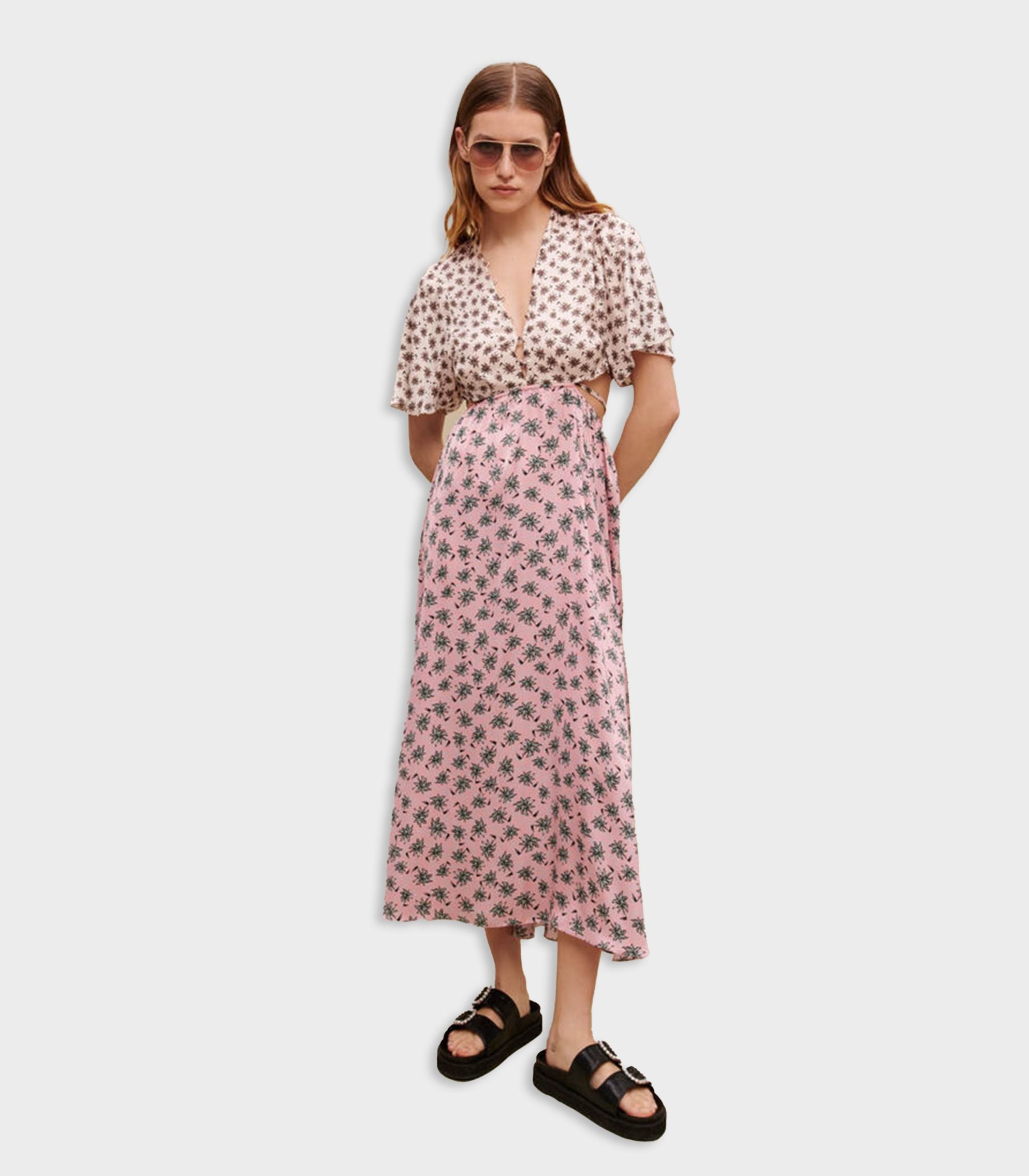 • This dress adopts two contrasting prints, bold cut-outs on the sides, short ruffled sleeves and a plunging neckline. It is made from a lightweight slinky material and embraces feminine details. It is one of the key styles in the collection.