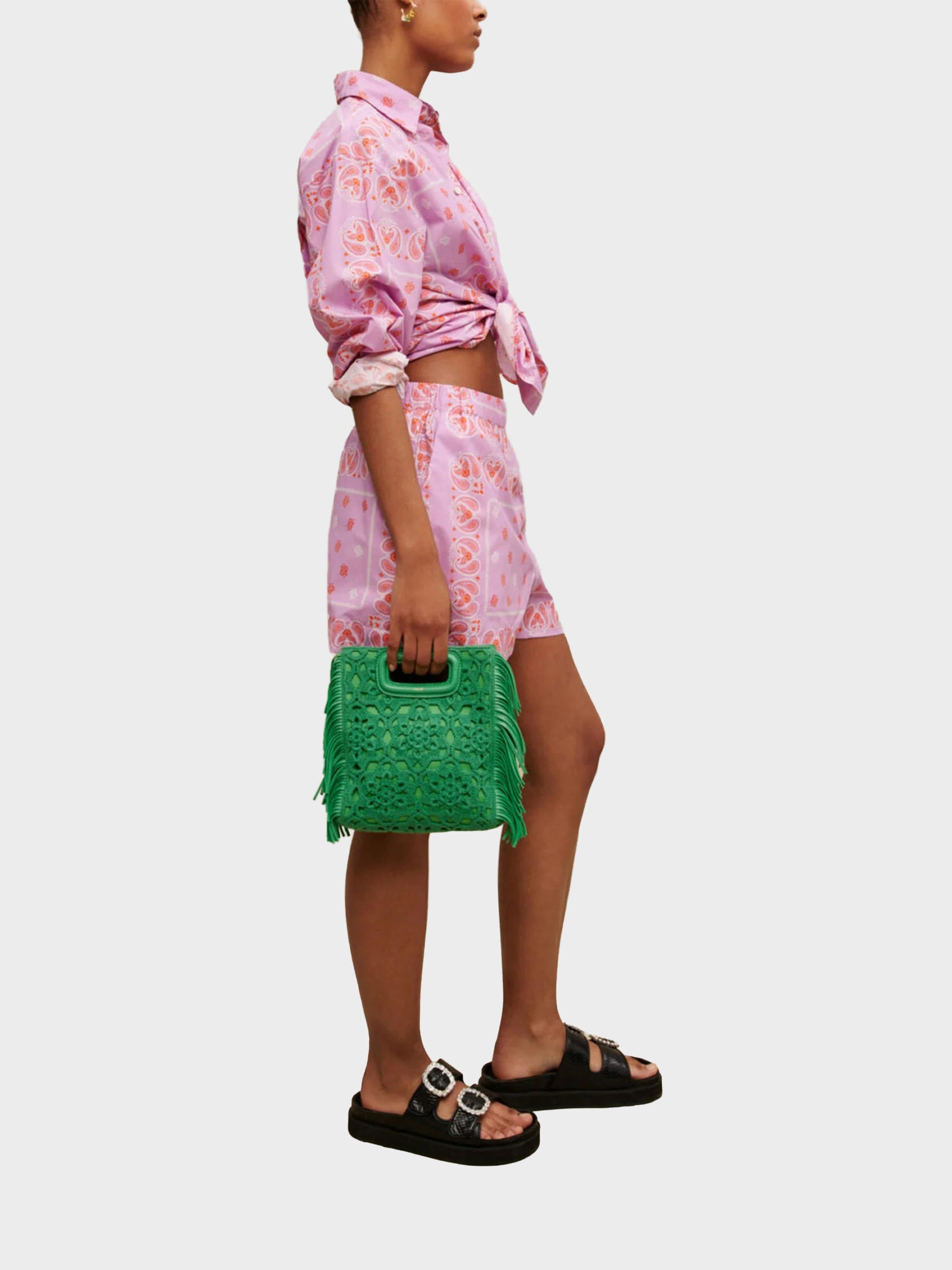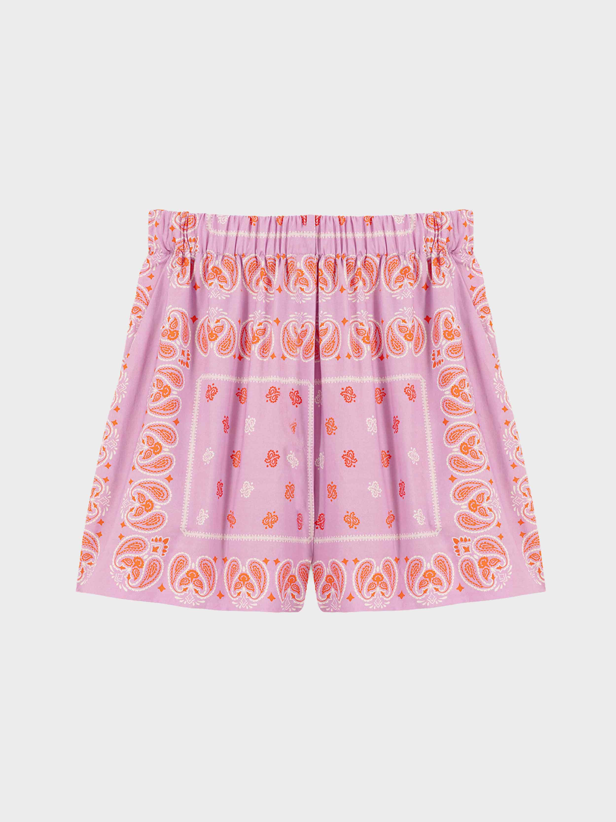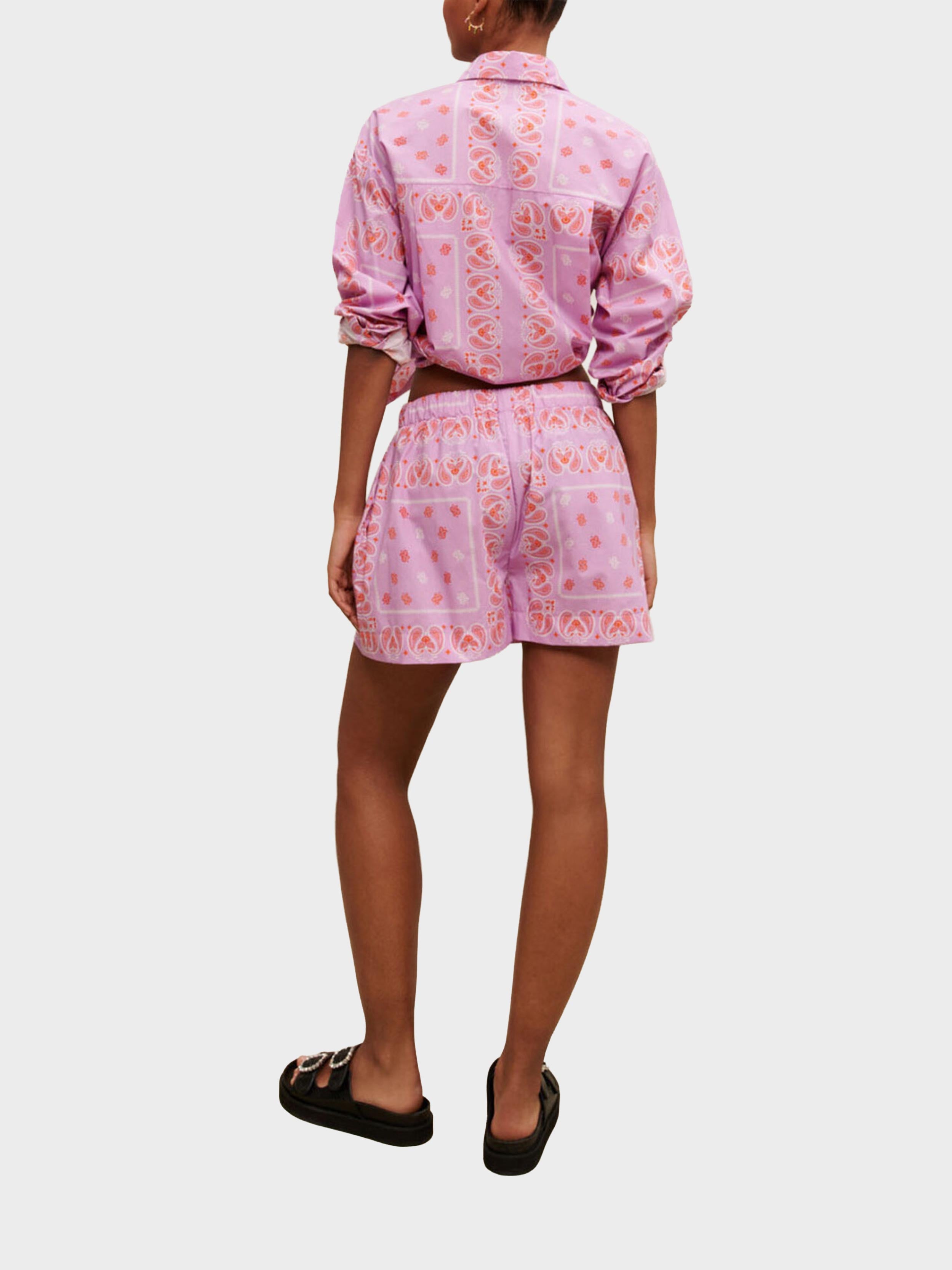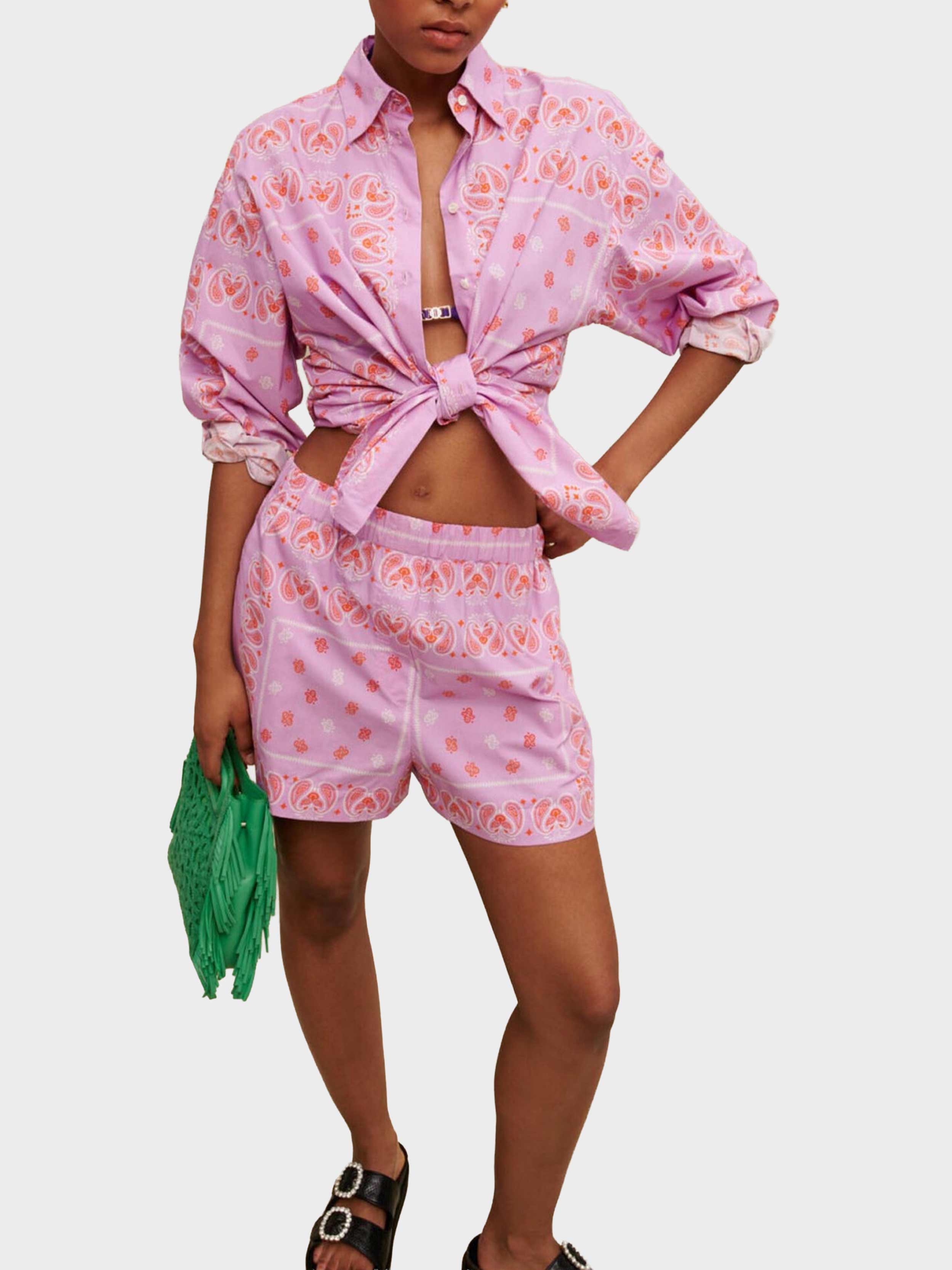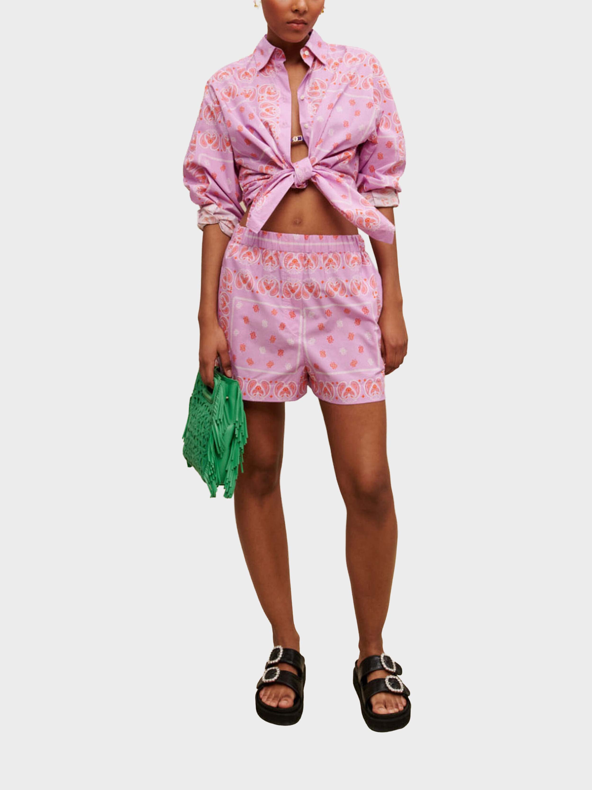 • The essential bandana print appears in orange on these lightweight cotton shorts, which you can wear with the matching shirt. They have an elasticated waist and will go with all your summer looks. Slip them on over swimwear and wear them with the matching shirt for a paisley total look. Accentuate your summer look by adding statement accessories, such as a fringed signature bag, rhinestone sandals, or handcrafted jewellery from the collaboration between Maje and éliou.