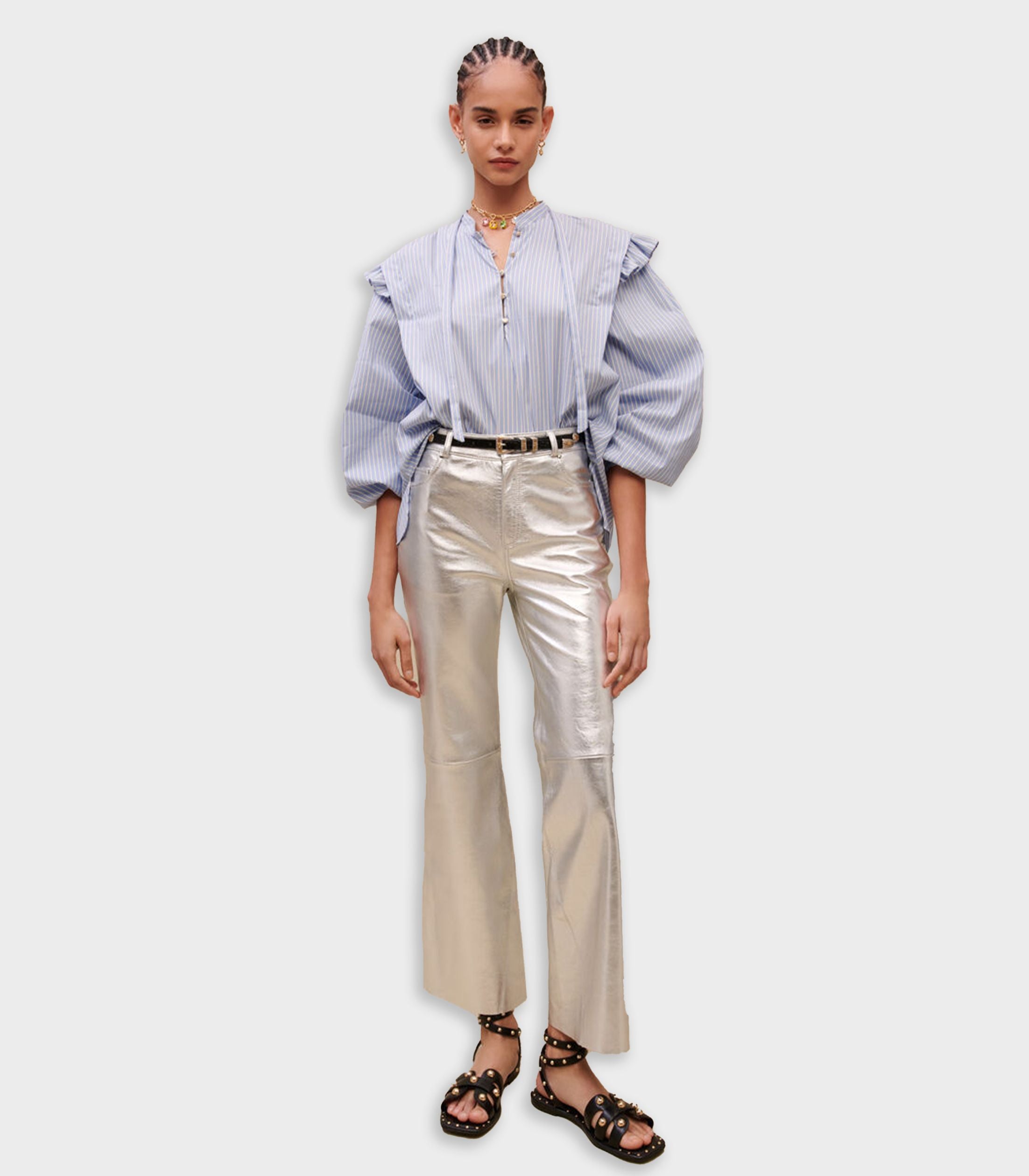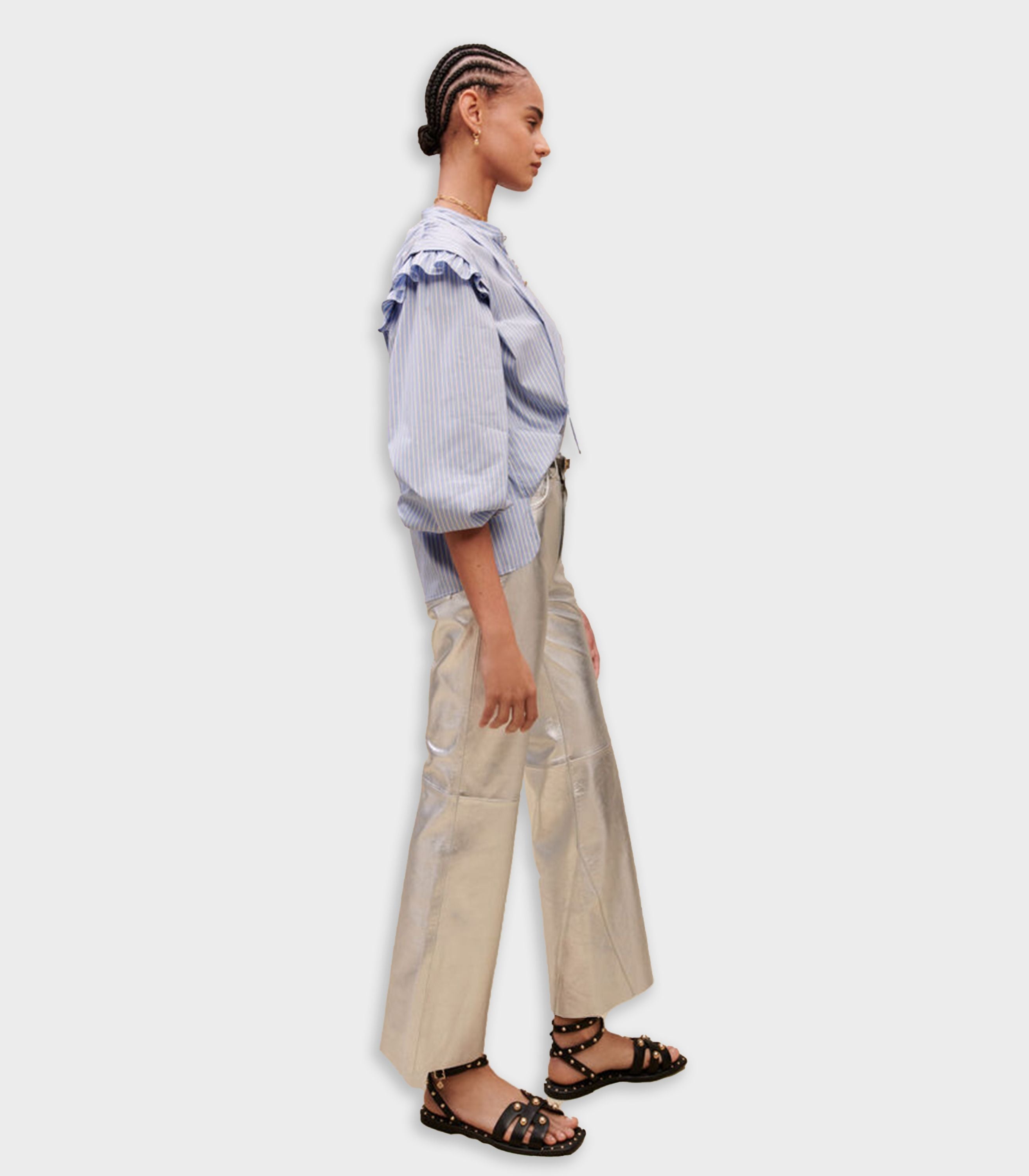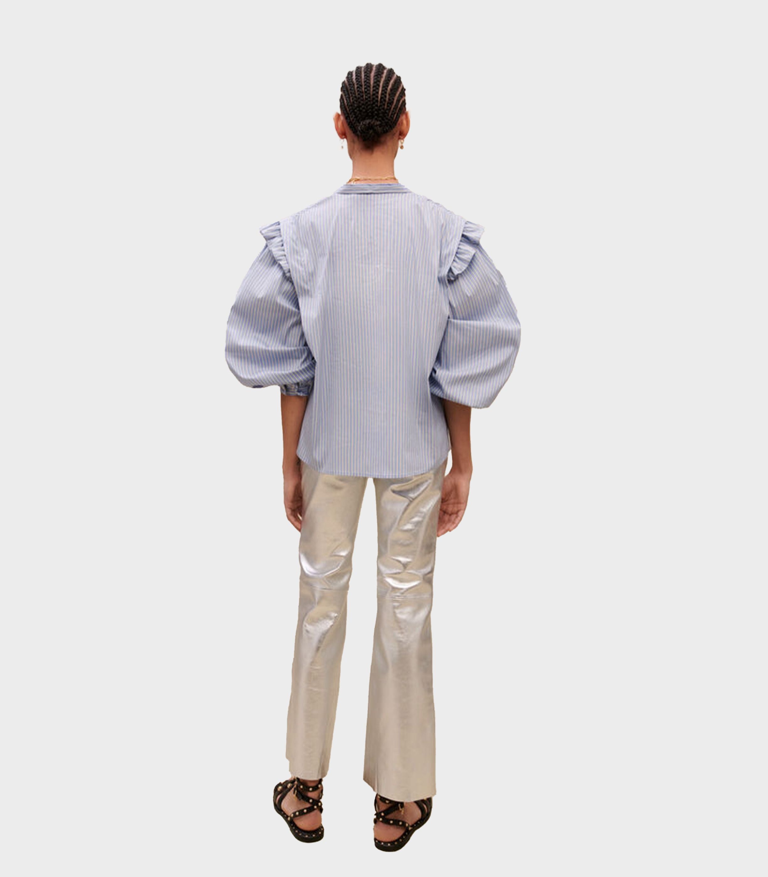 • This blue blouse is a very elegant, modern style. The shoulders are elevated by various details: ruffles, volume, gathers... It is tighter at the cuffs and features two ties at the neck. Perfect for a day at the office.