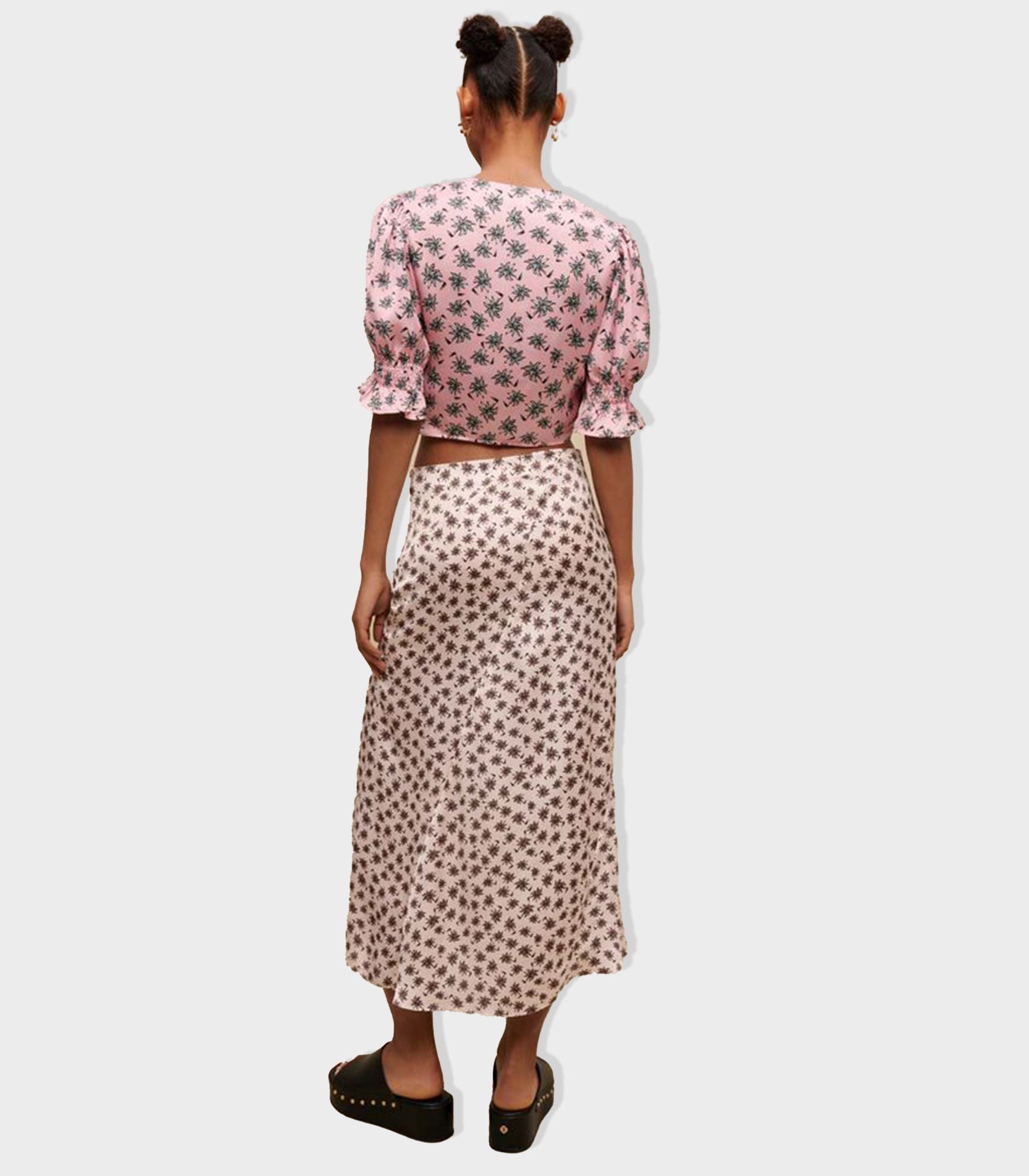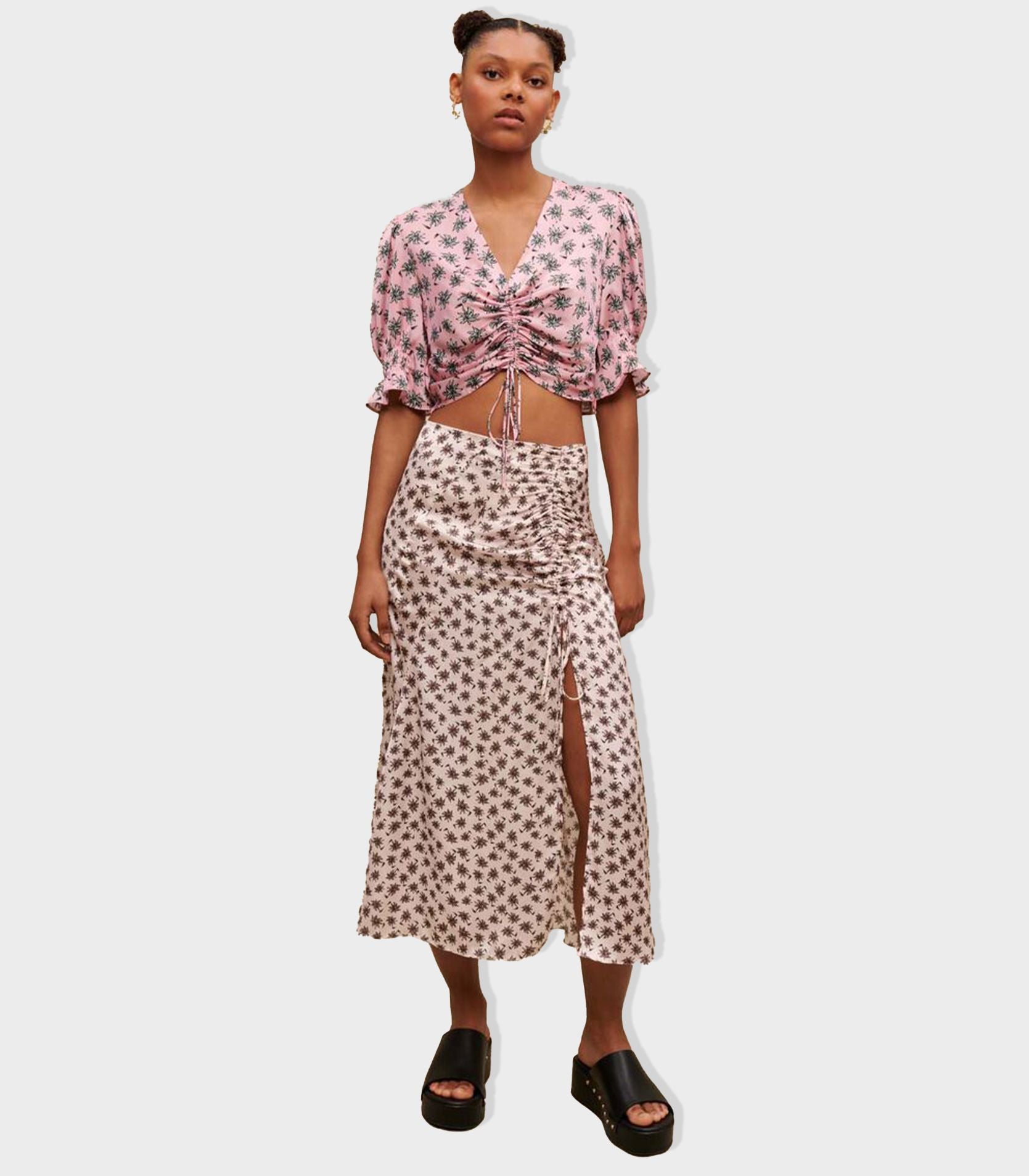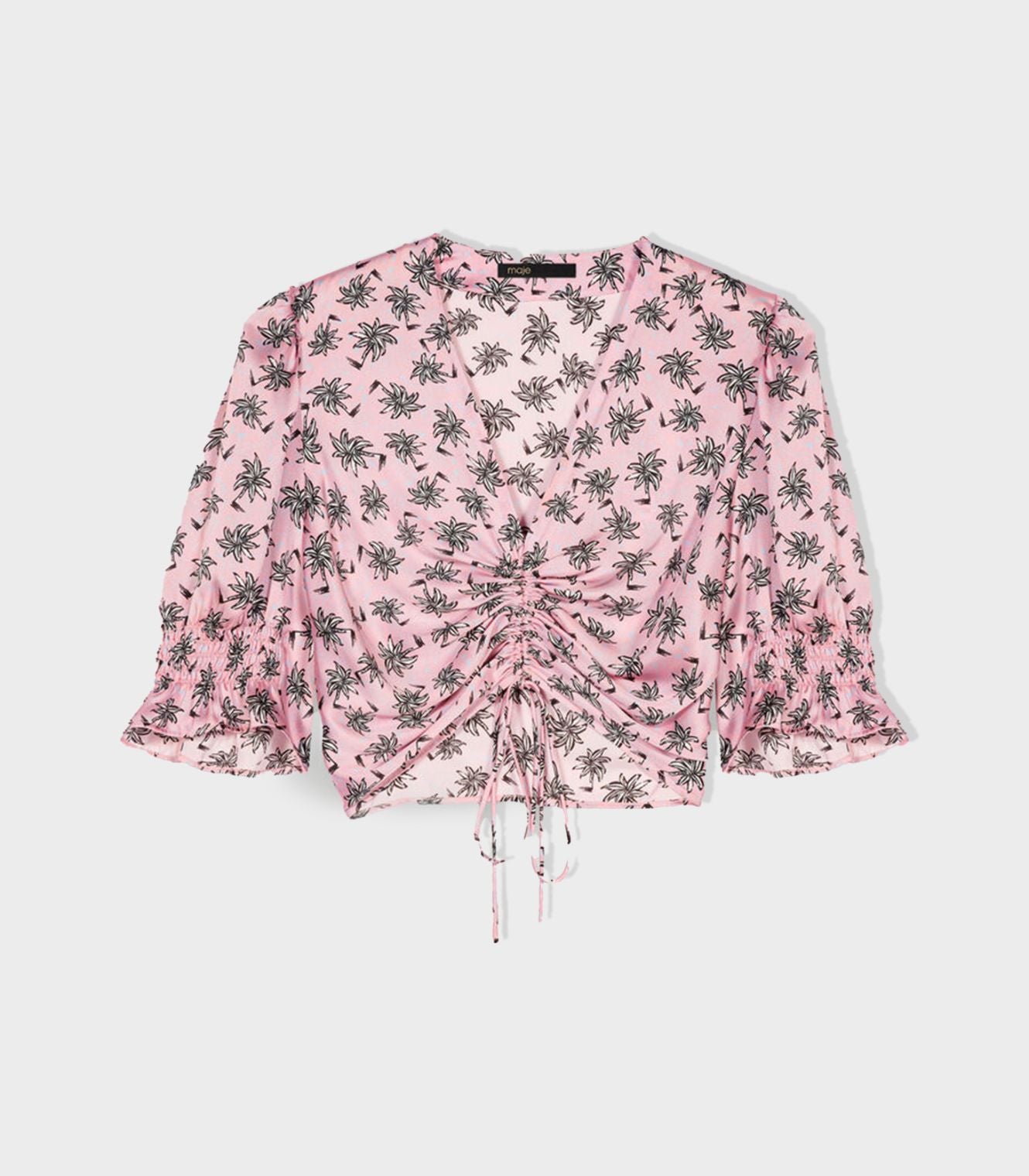 • Lightweight and satiny, this cropped top with drawstring ties features a draped V neckline and short, flared sleeves with gathers. Decorated with one of the season's key prints - palm trees - it can be worn as a contrasting total look with the matching skirt.
