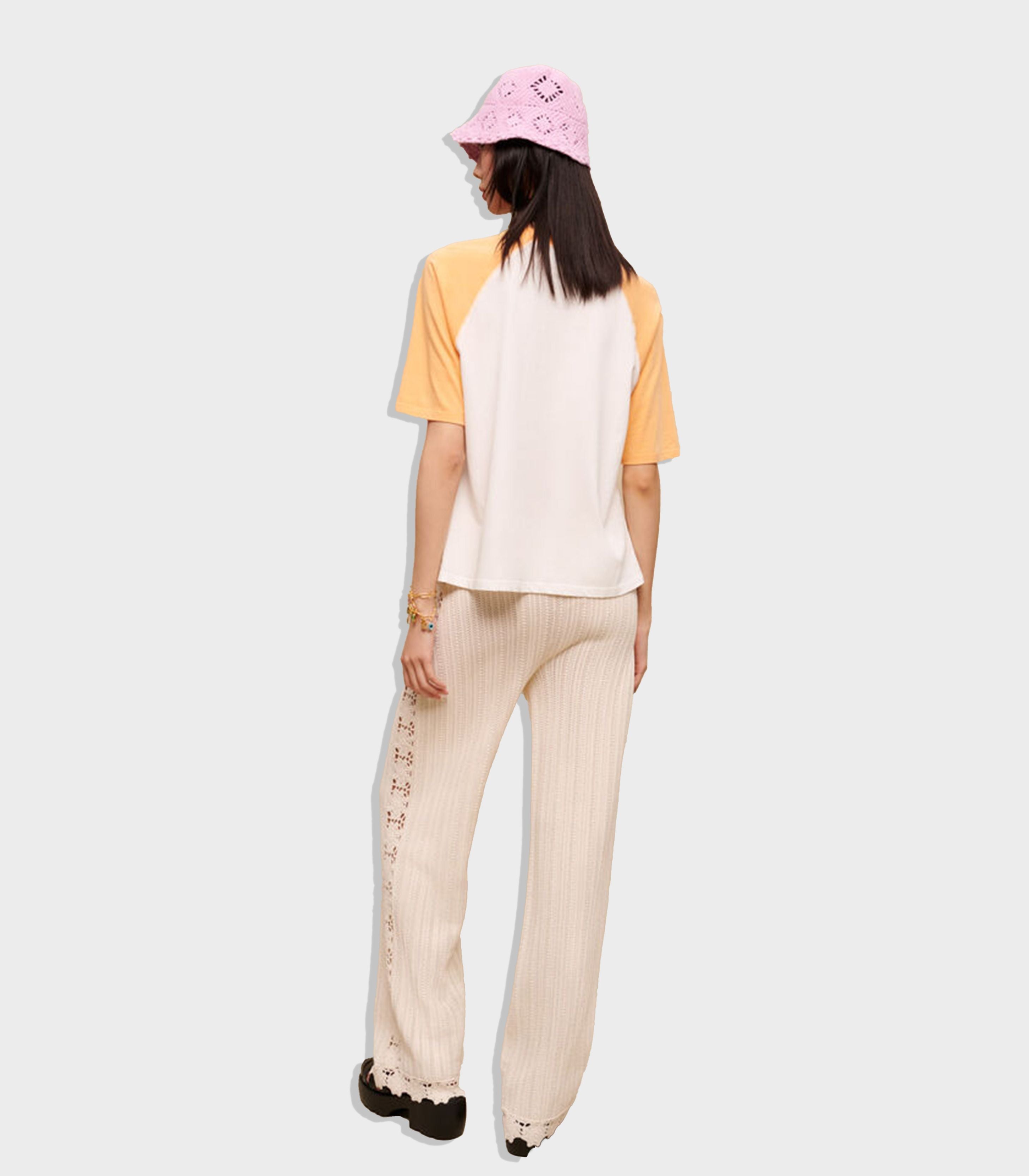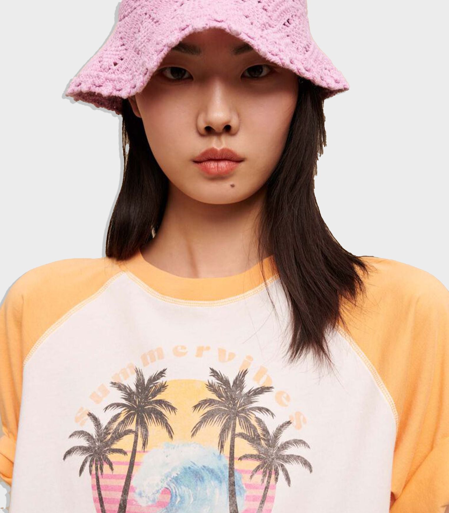 • This T-shirt with contrasting short sleeves will transport you to sunny summer days. It features a “Summer Vibes Paradise” palm tree print and can be worn with any casual outfit. Revamp your summer looks by tying it at the waist and wearing it with a long skirt.