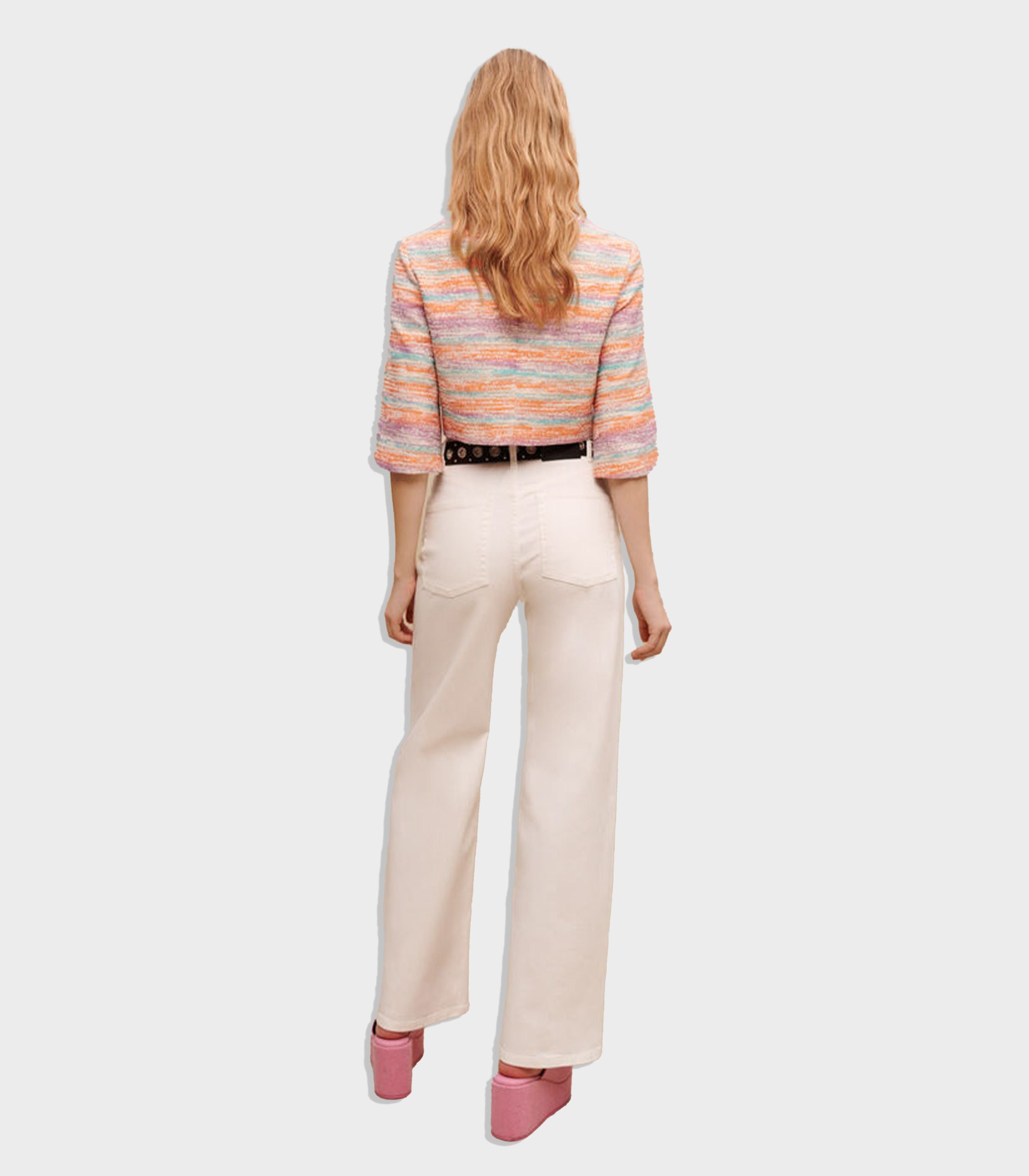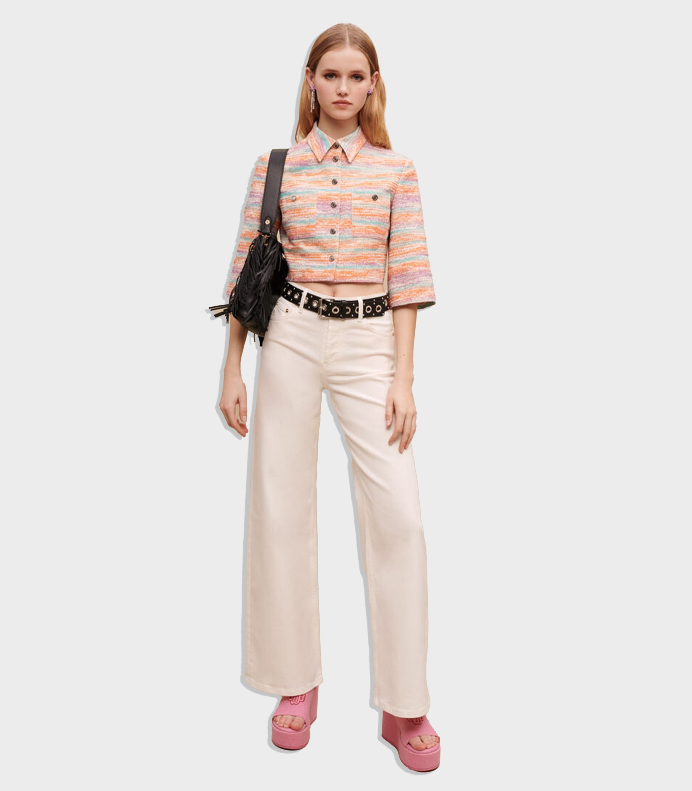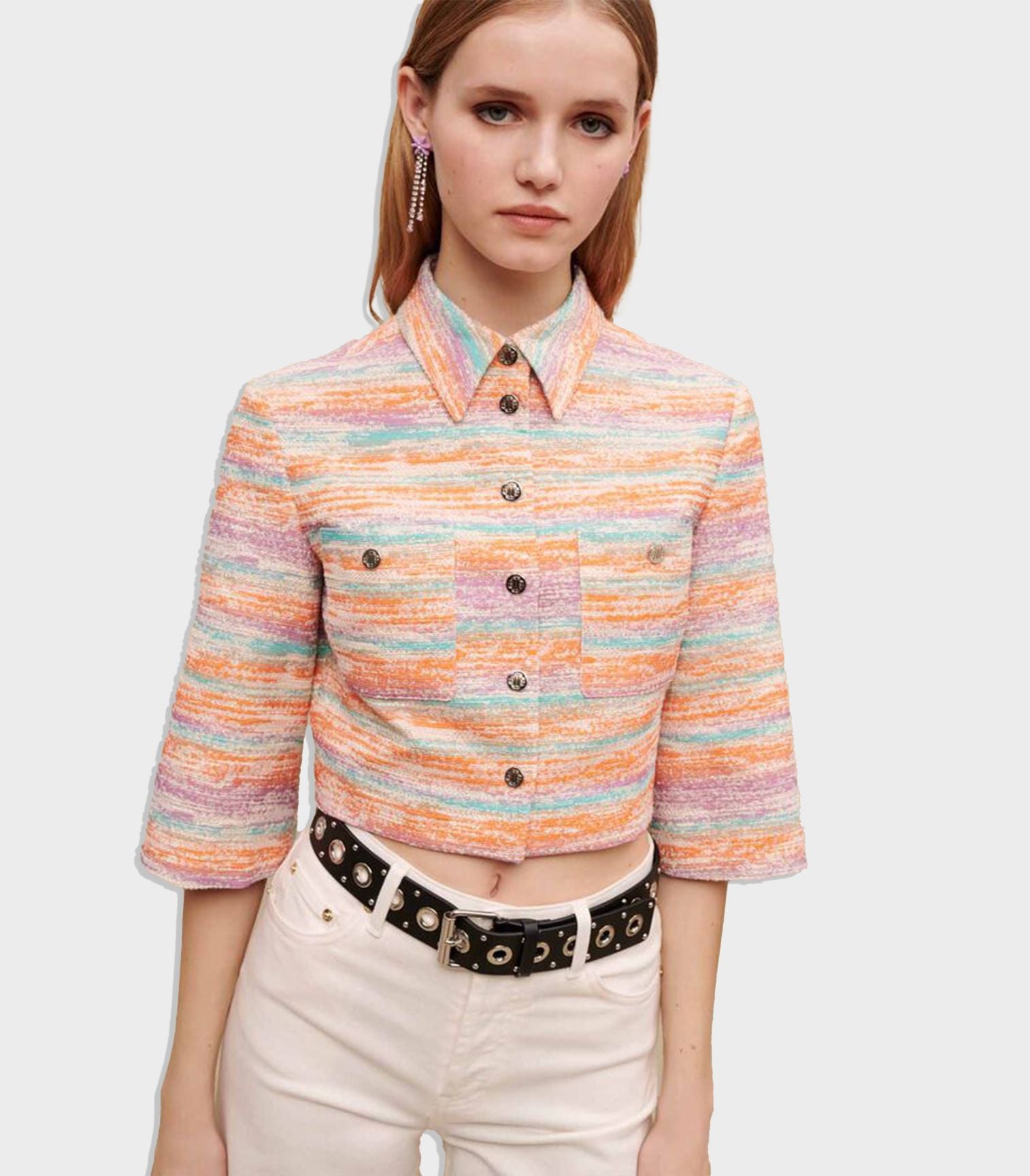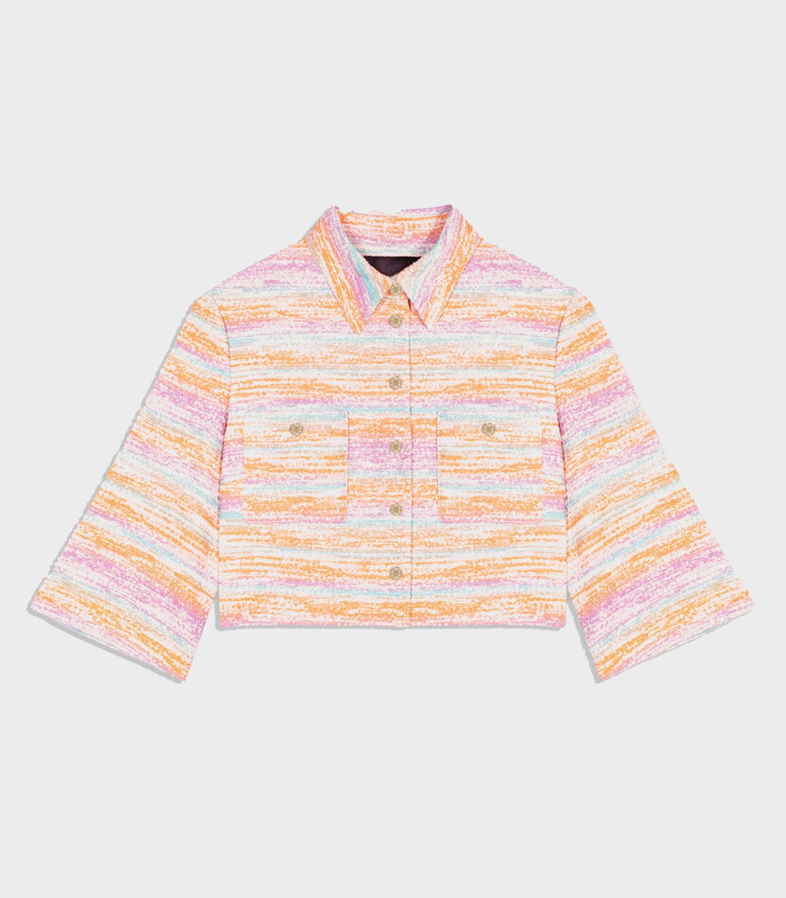 • This cropped jacket in cute gradated pastel colours is embellished with metallic fibres. Pair it with the matching mini skirt to create a structured ensemble.