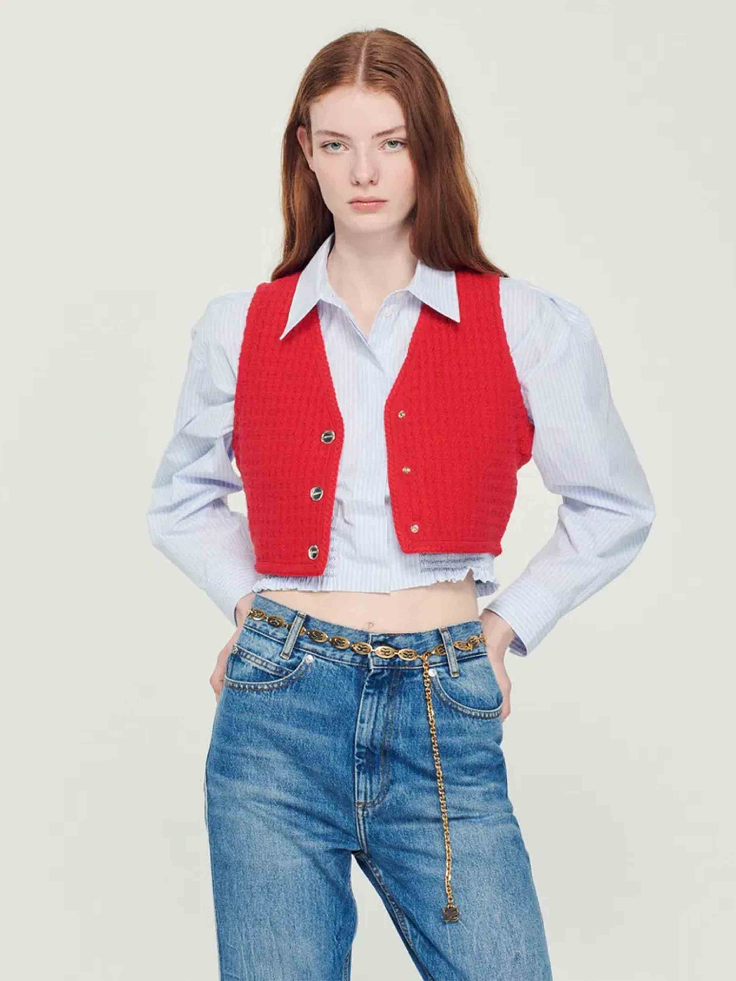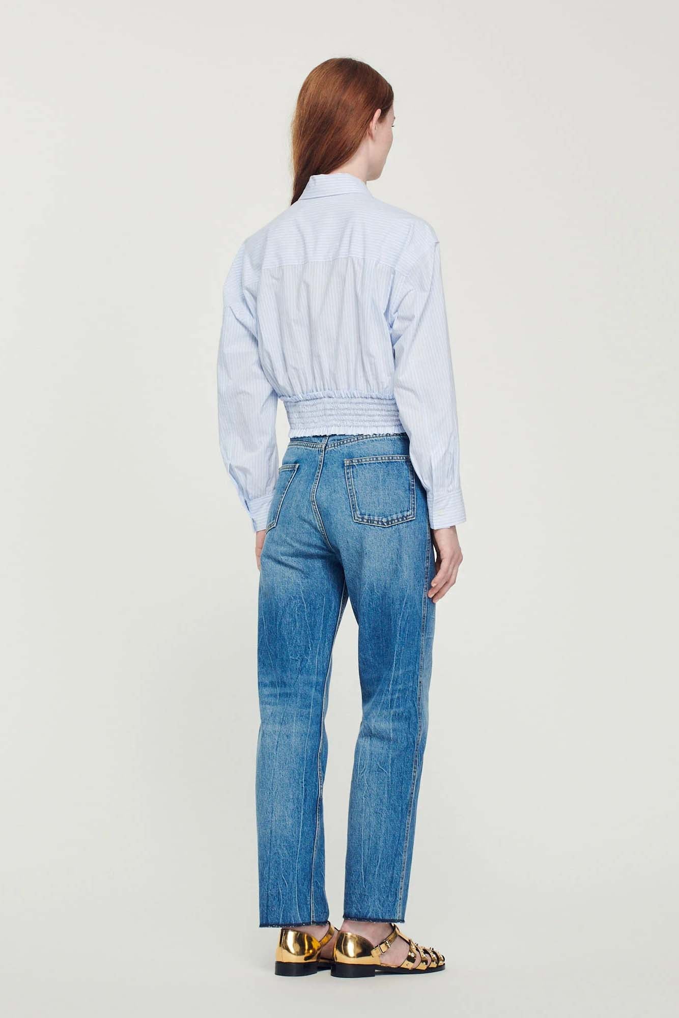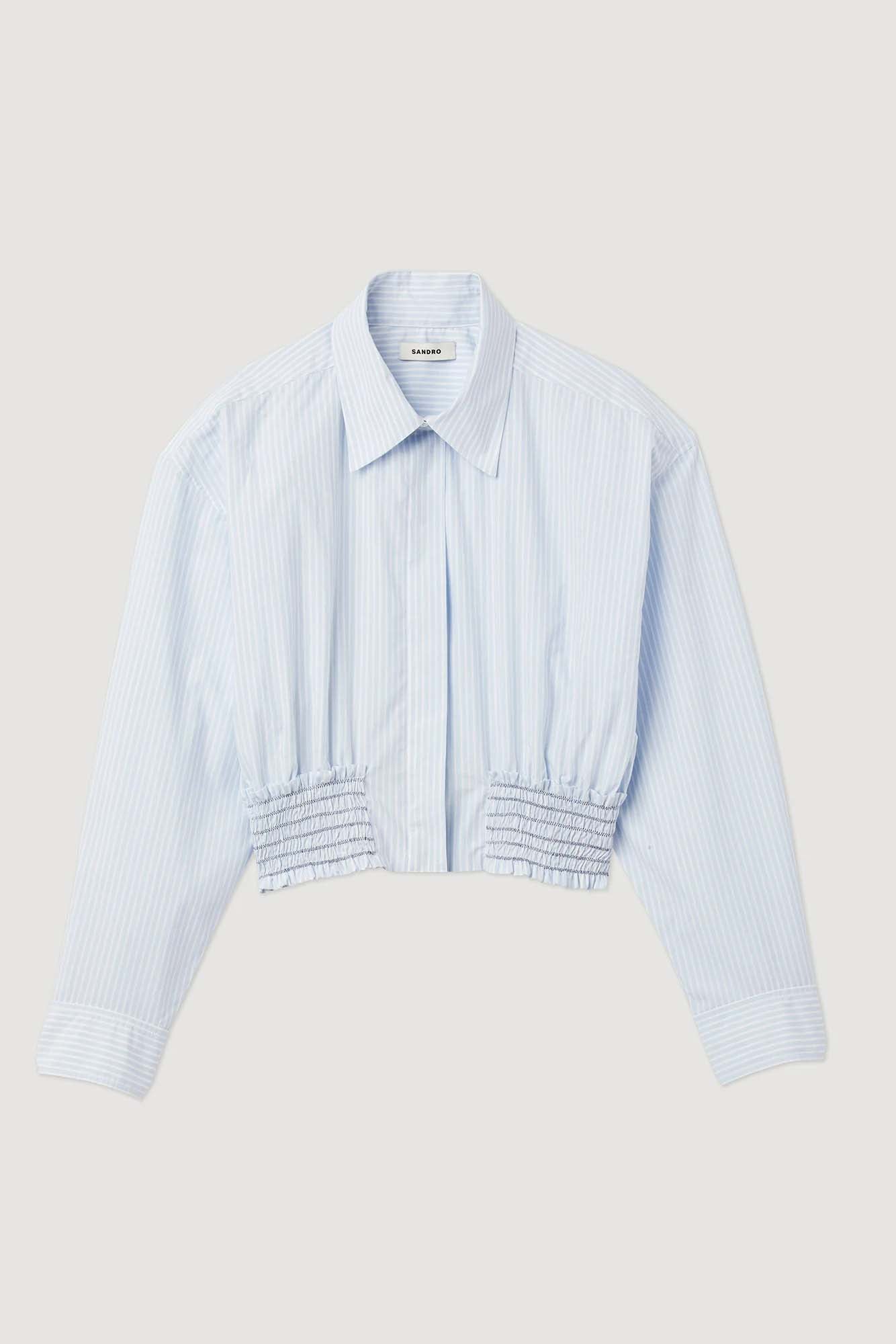• Cropped cotton blouse-style shirt with stripes and ruffles on the shoulders and sleeves. • Sandro Women's shirt • Round neck • Ruffles on the shoulders and sleeves• Full sleeves with gathered cuffs • Elasticated bottom hem • Button placket at the front The model is 5'10" tall and wears a size 1 FR / 4 US