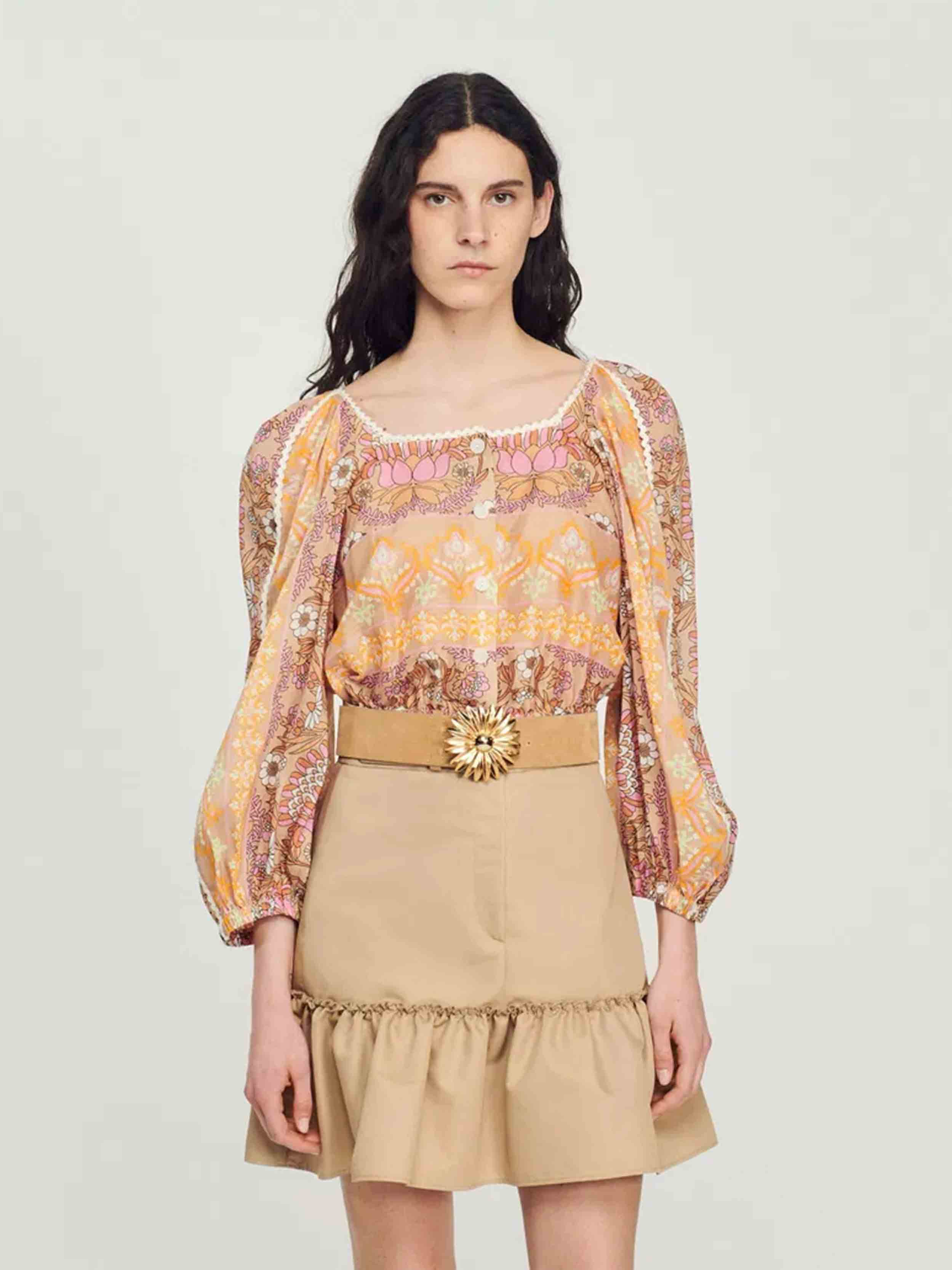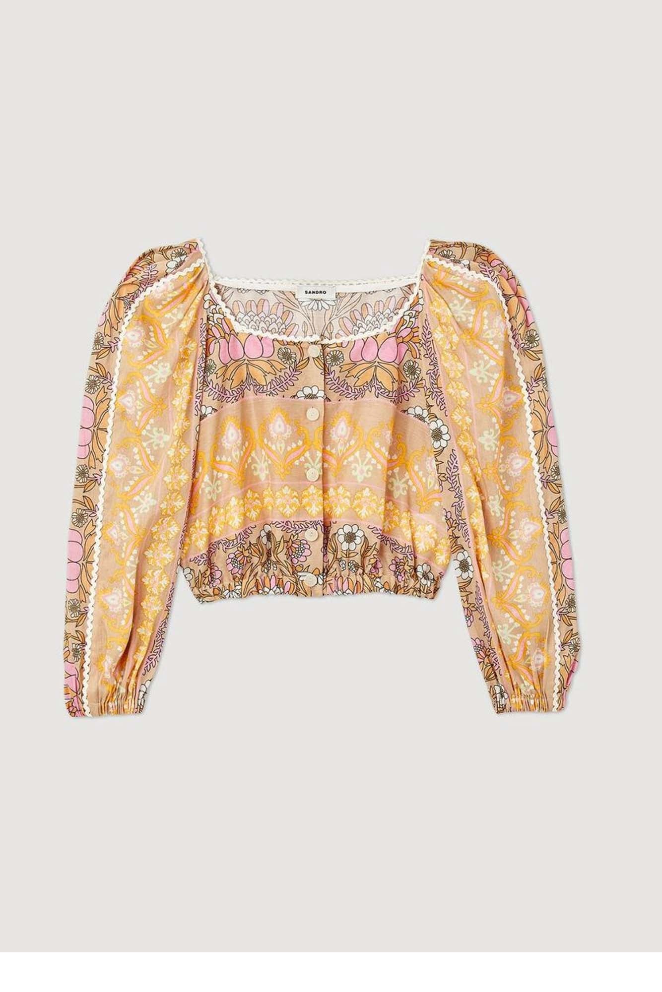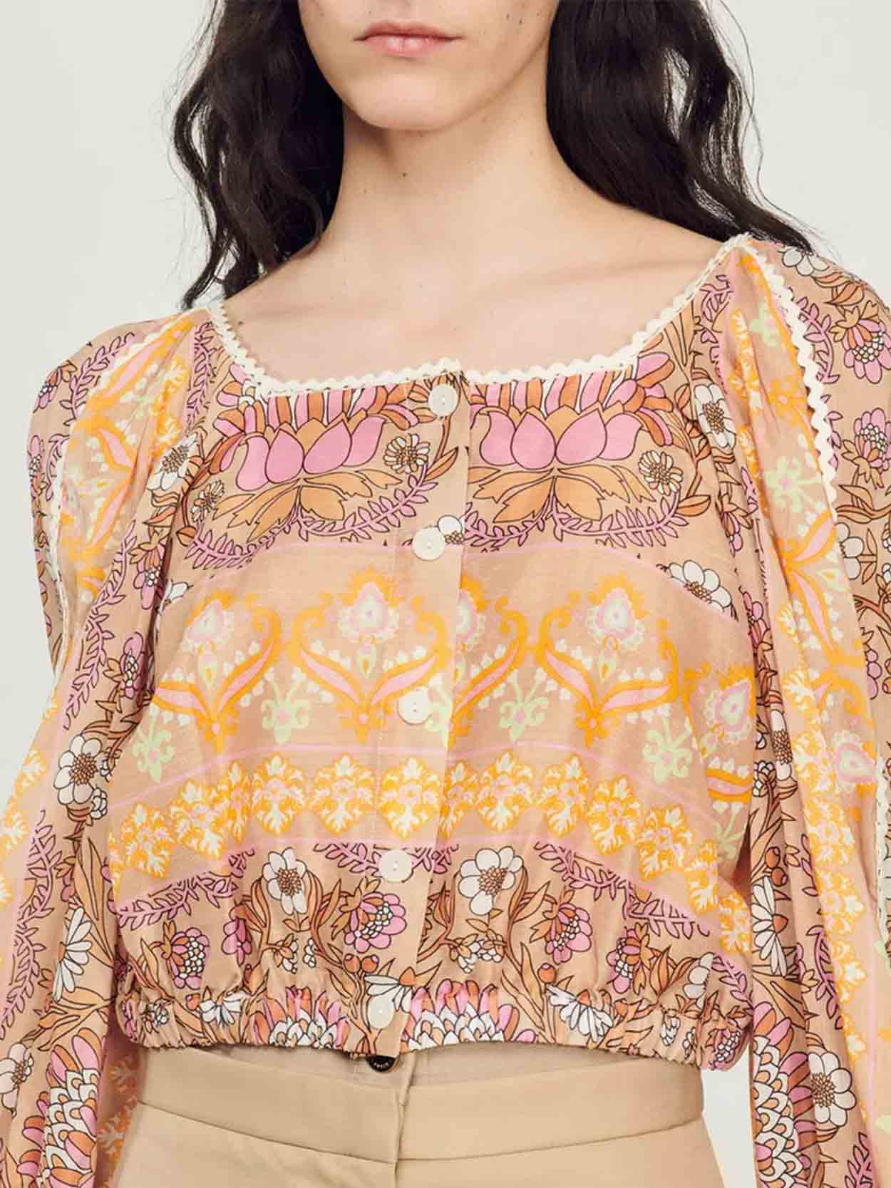 • Crop top featuring a scarf print, long voluminous sleeves, a square neckline with contrasting trim, and a button fastening.