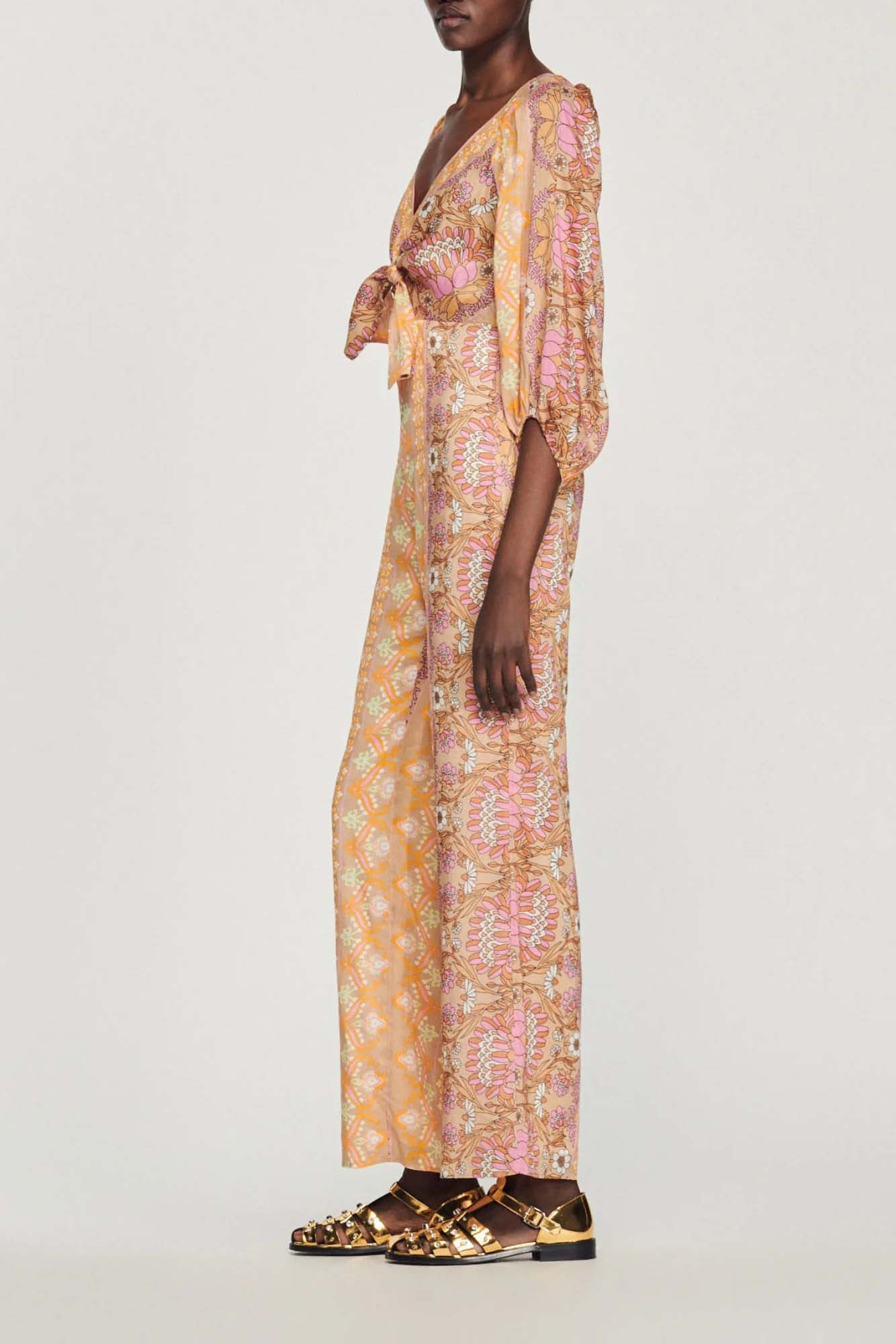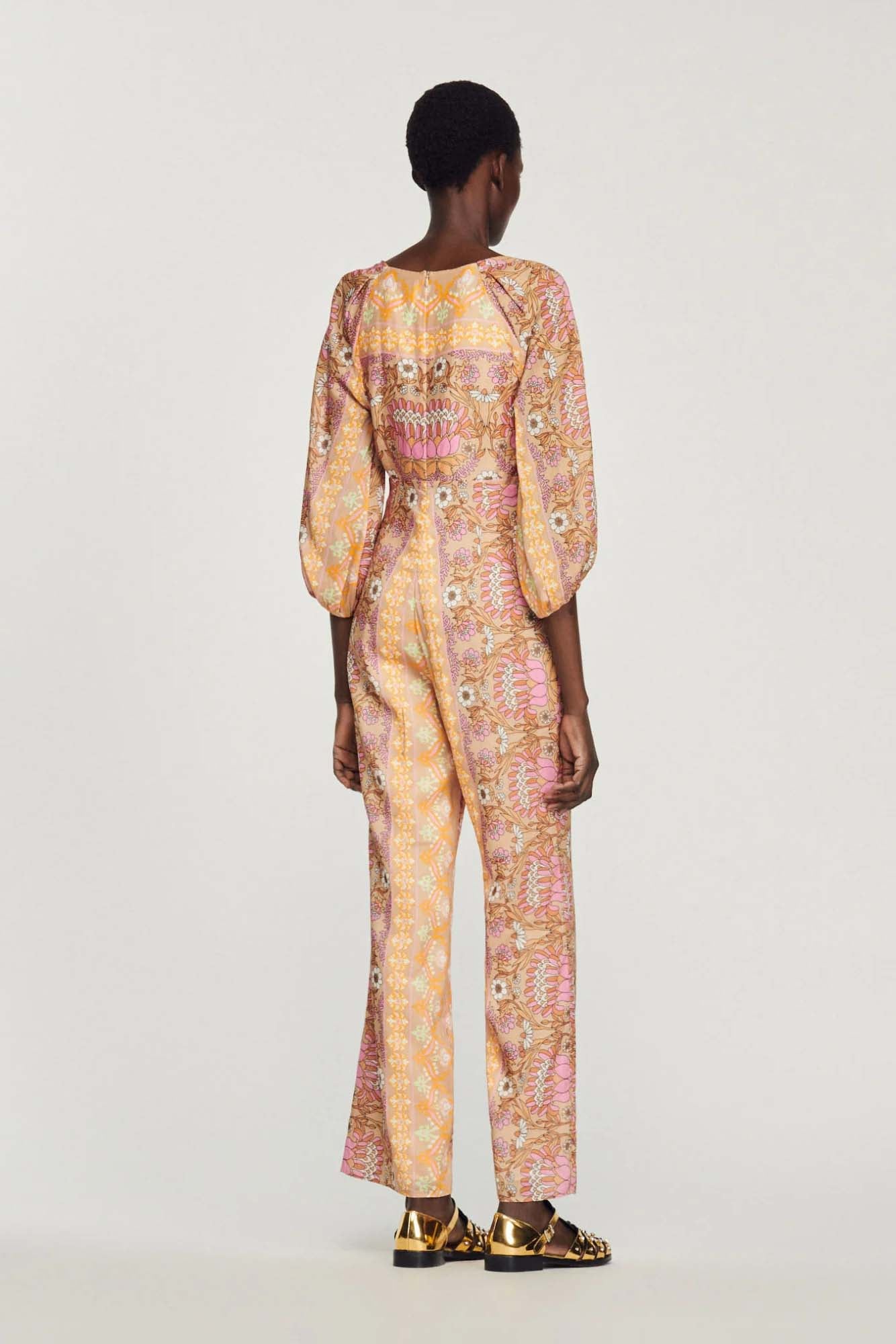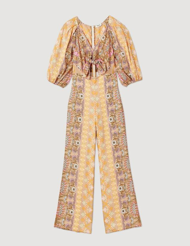 • Jumpsuit with full three-quarter sleeves tied on the front and decorated with a scarf print.