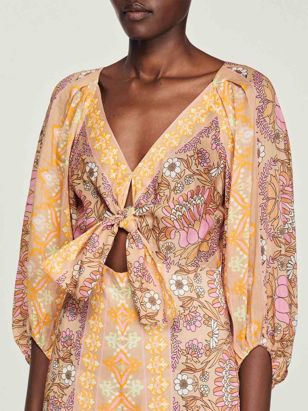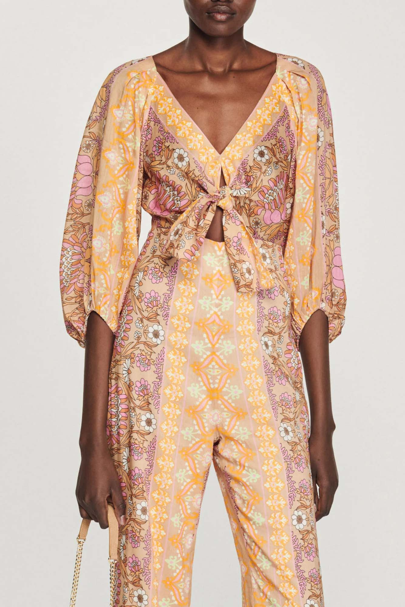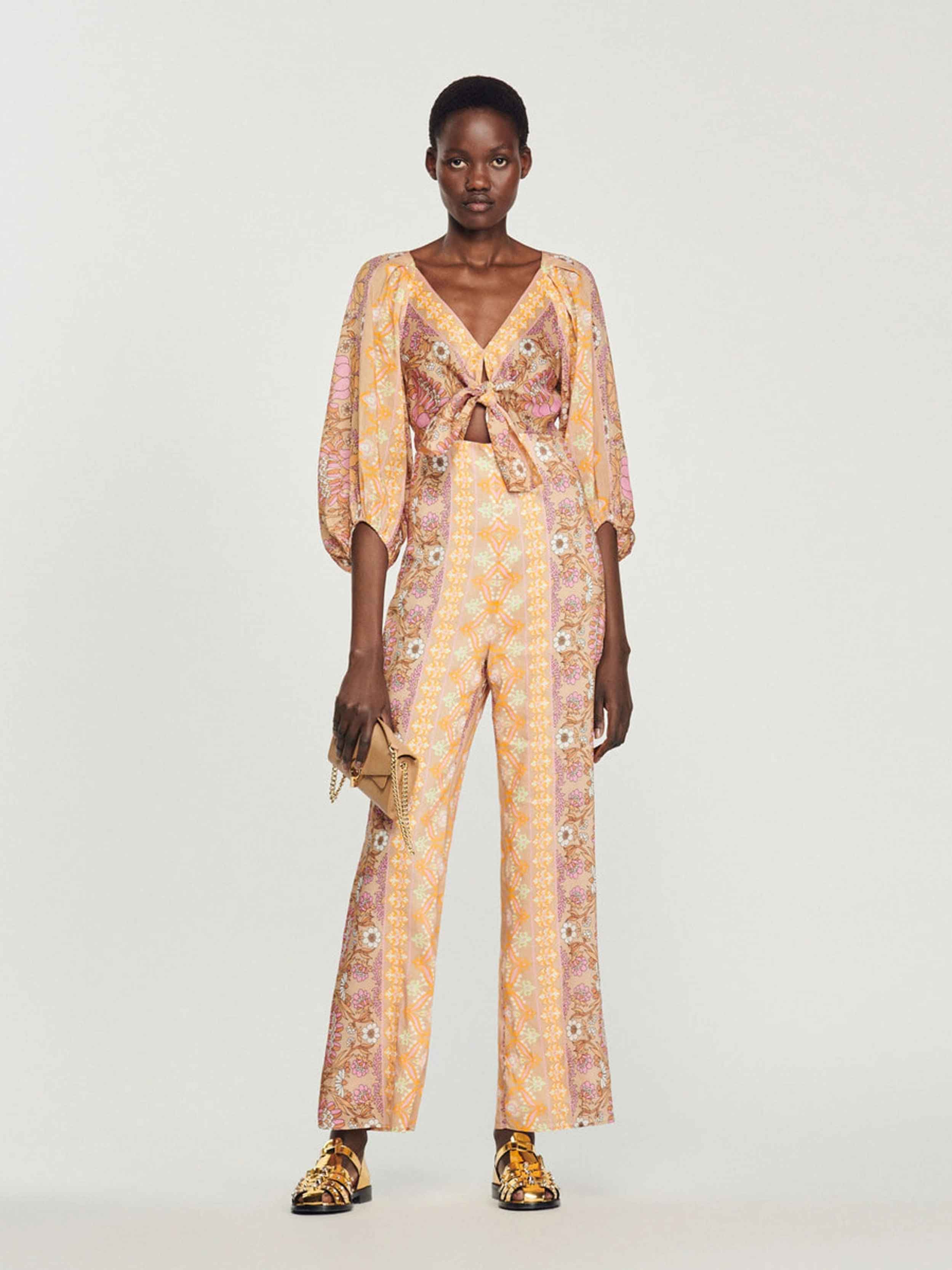 • Jumpsuit with full three-quarter sleeves tied on the front and decorated with a scarf print.