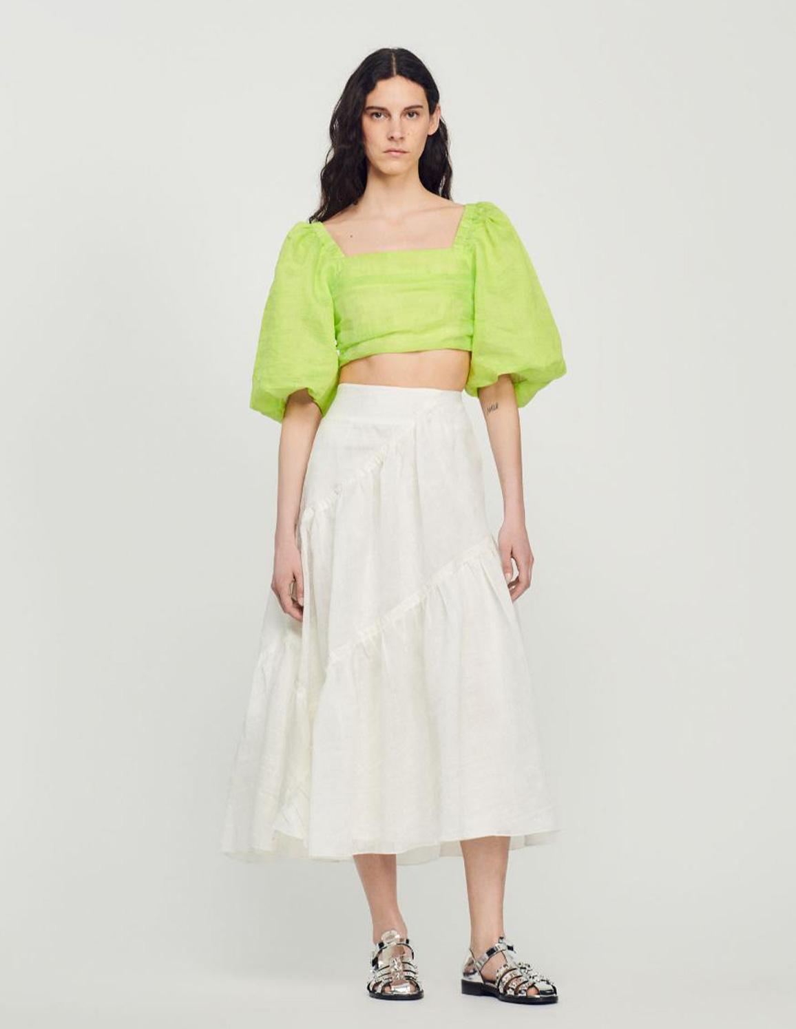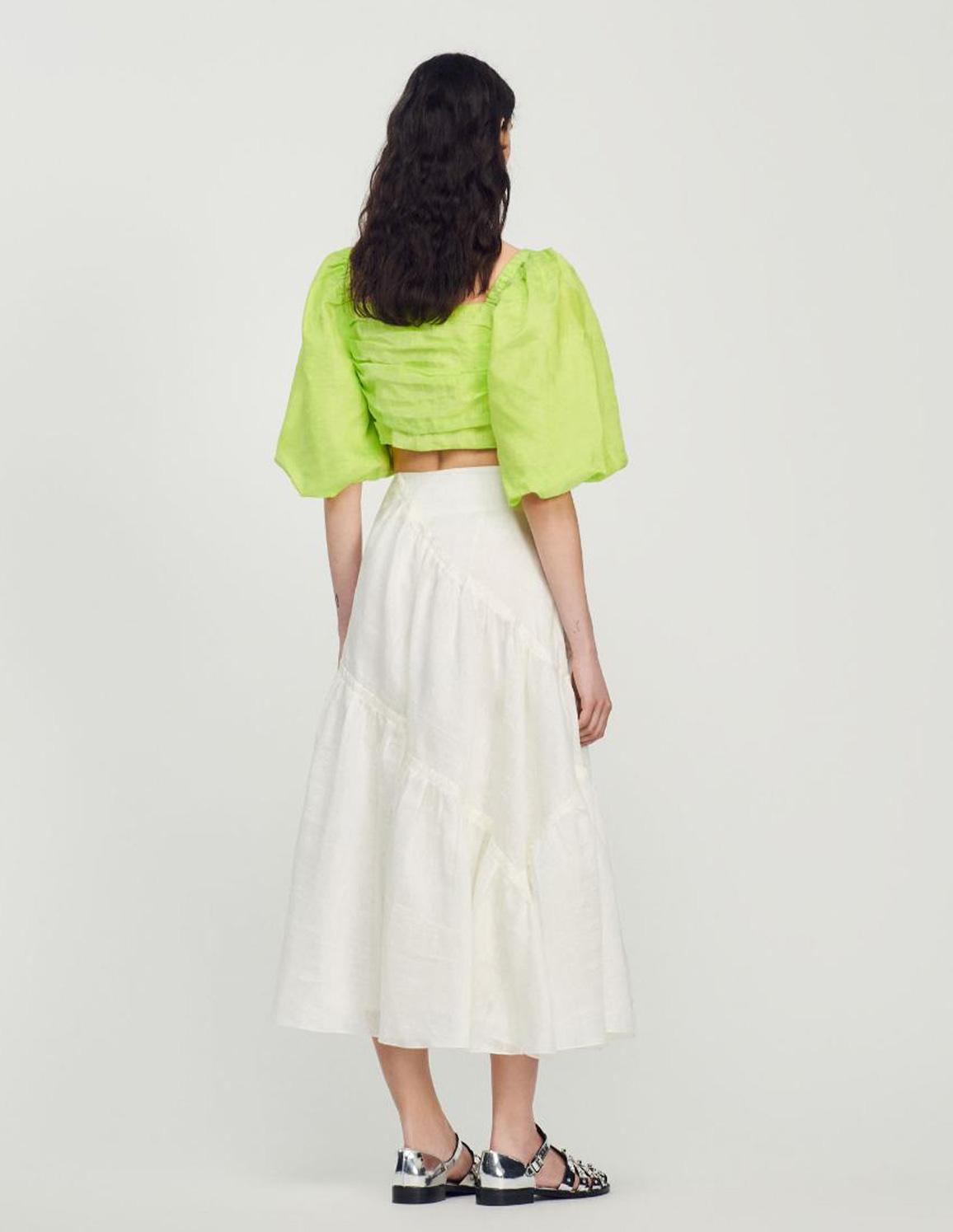 • Long, slightly flared skirt with ruffles, gathering, and a side zipper.